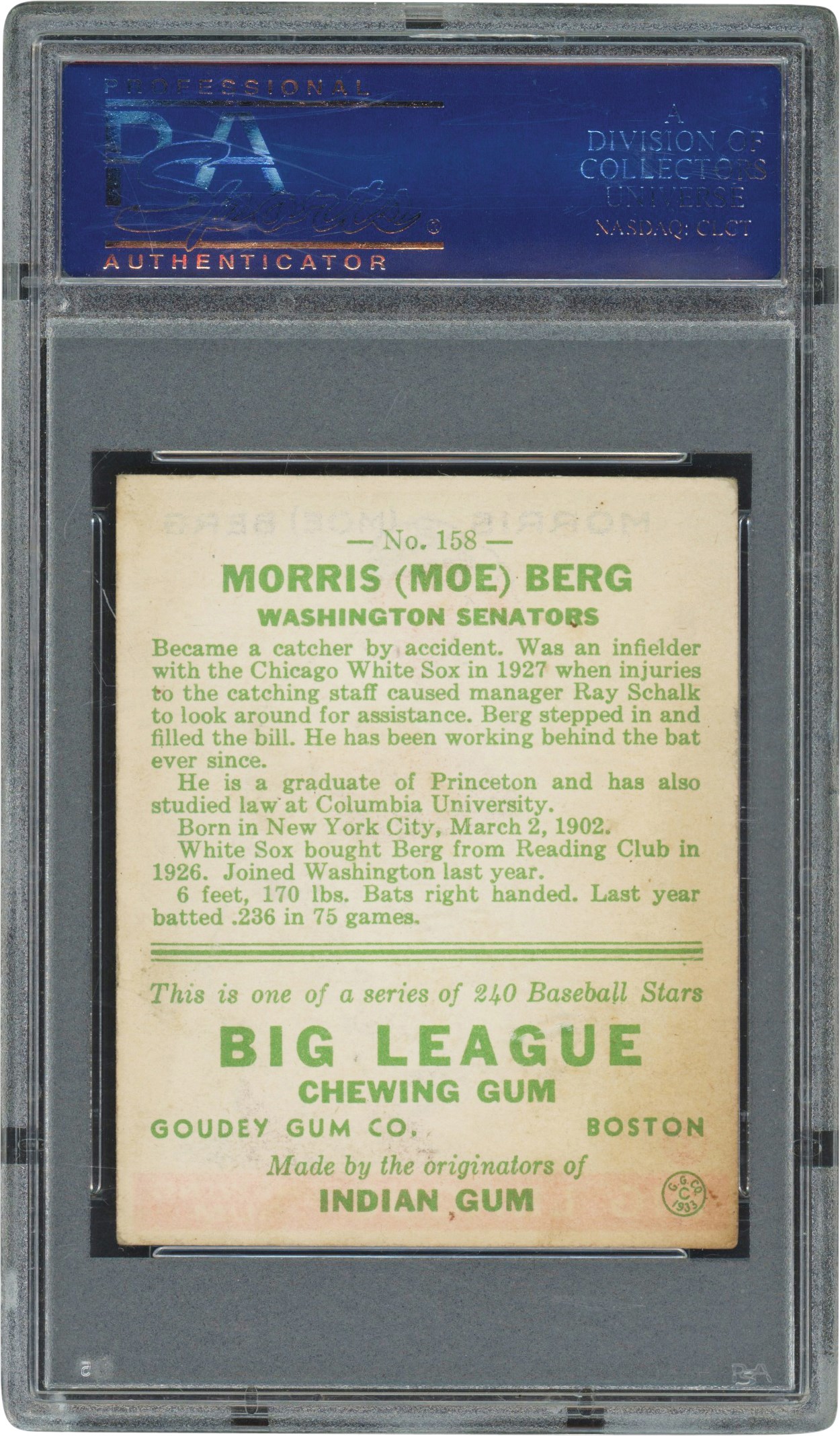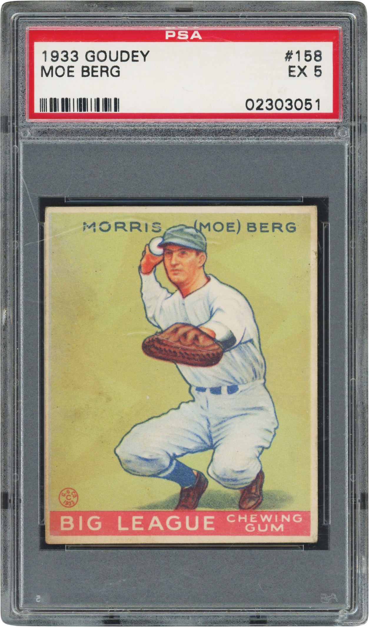 1933 Goudey 158 Moe Berg card. The card has been graded and encapsulated by PSA EX 5. It has a colorful image of Berg in squatting catcher pose set against a light green background. The edges are fairly smooth. Centering is off left to right. All four corners exhibit light wear. The reverse is bright ad clean.