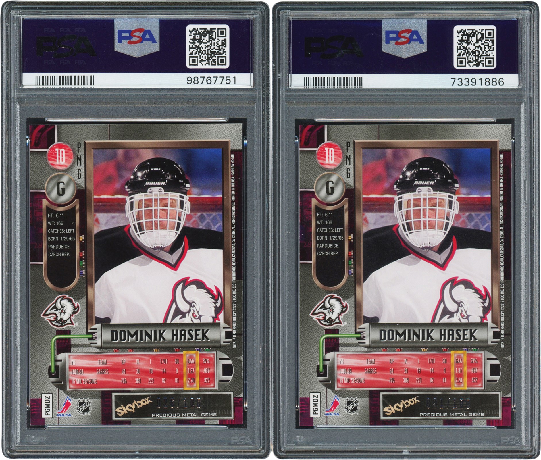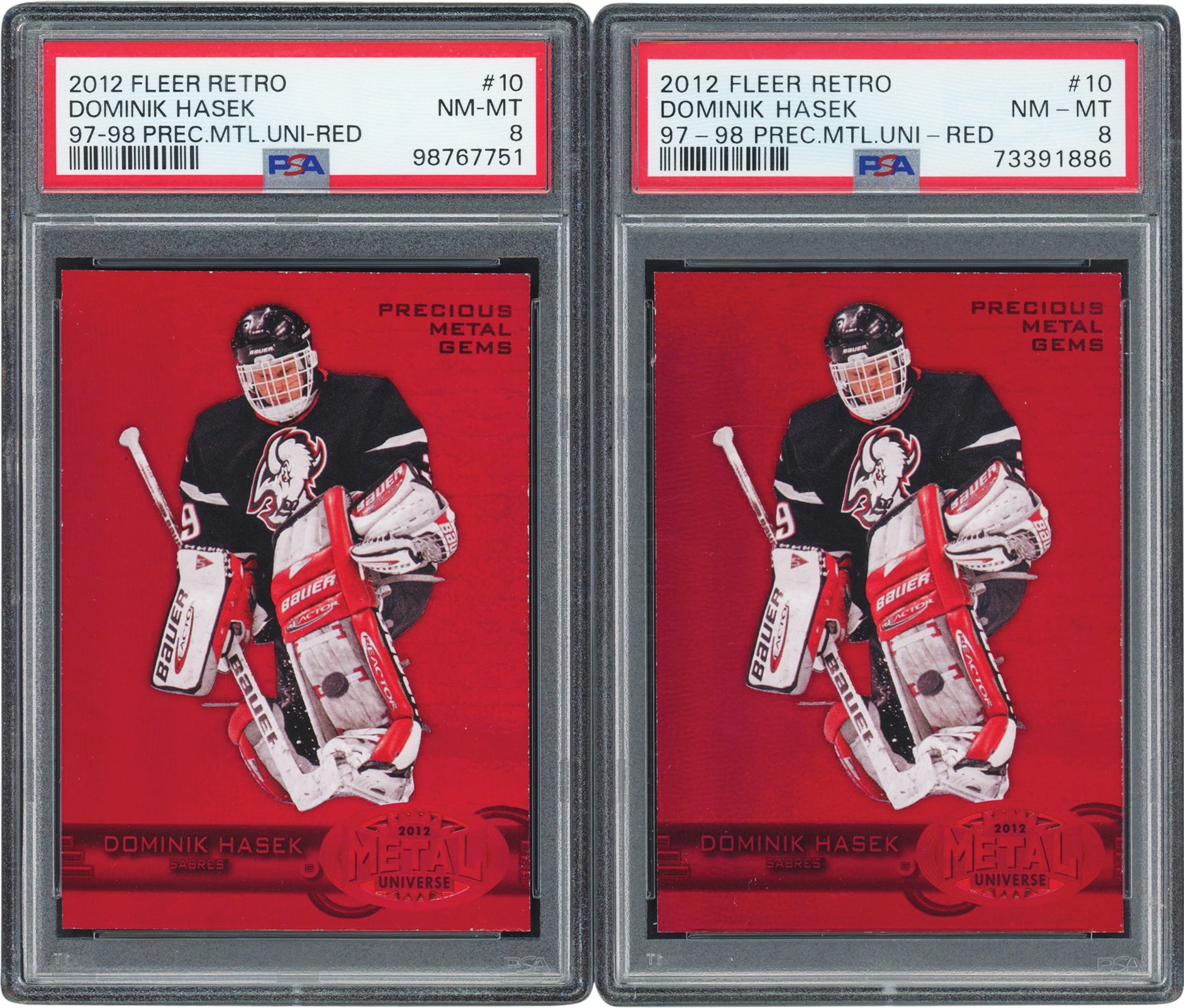 Lot # 261: 2012 Fleer Retro '97-98 Precious Metal Gems Red #10 Dominik Hasek #26/100 and #81/100 (Both PSA NM-MT 8 - Highest Graded)
