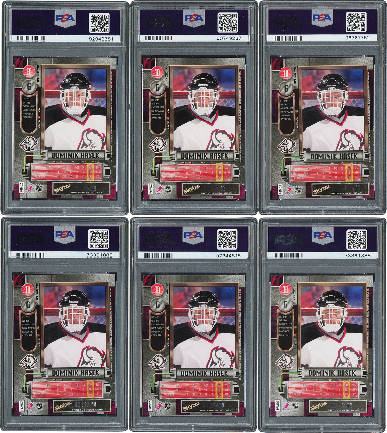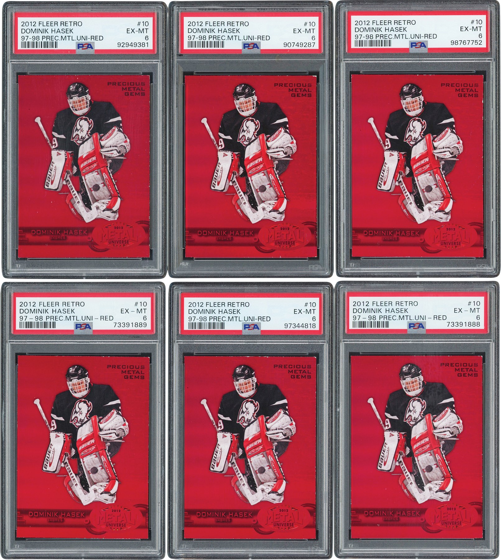 This lot features a collection of (6) 2012 Fleer Retro #10 Dominik Hasik '97-'98 Precious Metal Gems Red cards #/50. All (6) cards have been graded and encapsulated by PSA EX-MT 6. The serial numbers of these cards are: #027/100; #032/100; #038/100; #044/100; #049/100; and #098/100.