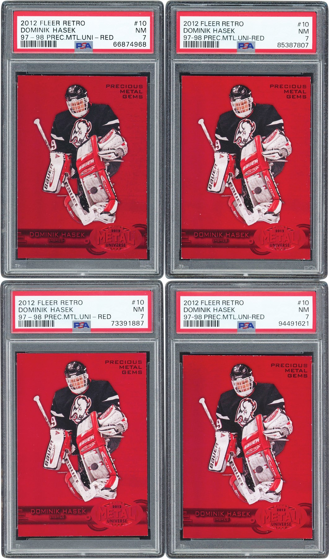 This lot features a collection of (4) 2012 Fleer Retro #10 Dominik Hasik '97-'98 Precious Metal Gems Red cards #/50. All (4) cards have been graded and encapsulated by PSA NM 7. The serial numbers of these cards are: #008/100; #014/100; #019/100; and #048/100.