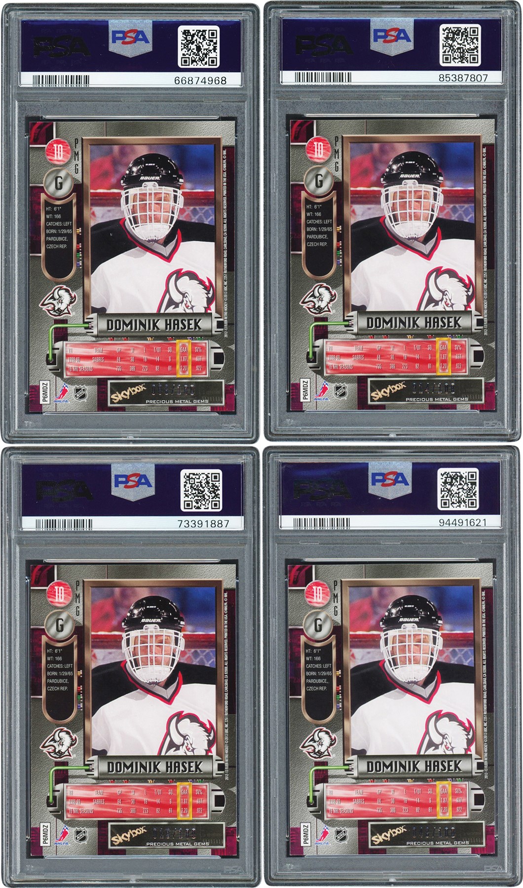 Lot # 262: (4) 2012 Fleer Retro '97-98 Precious Metal Gems Red #10 Dominik Hasek (#/100) - Each PSA NM 7