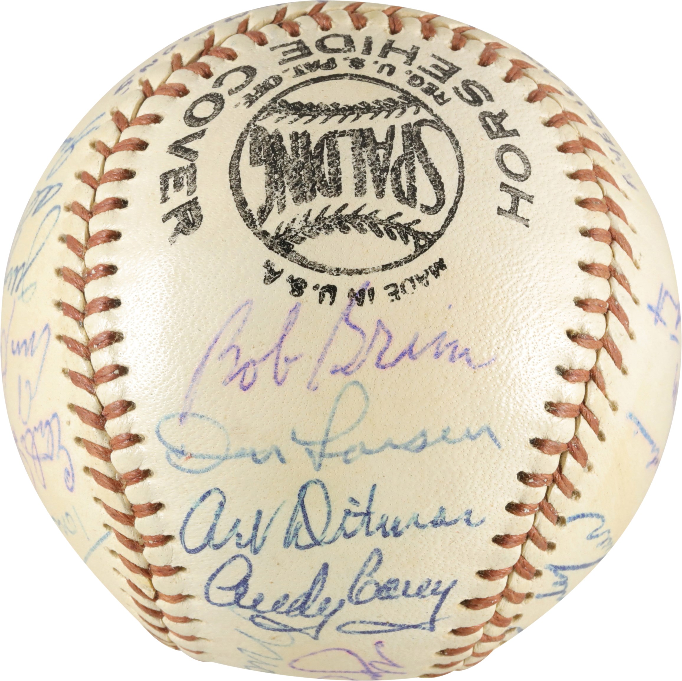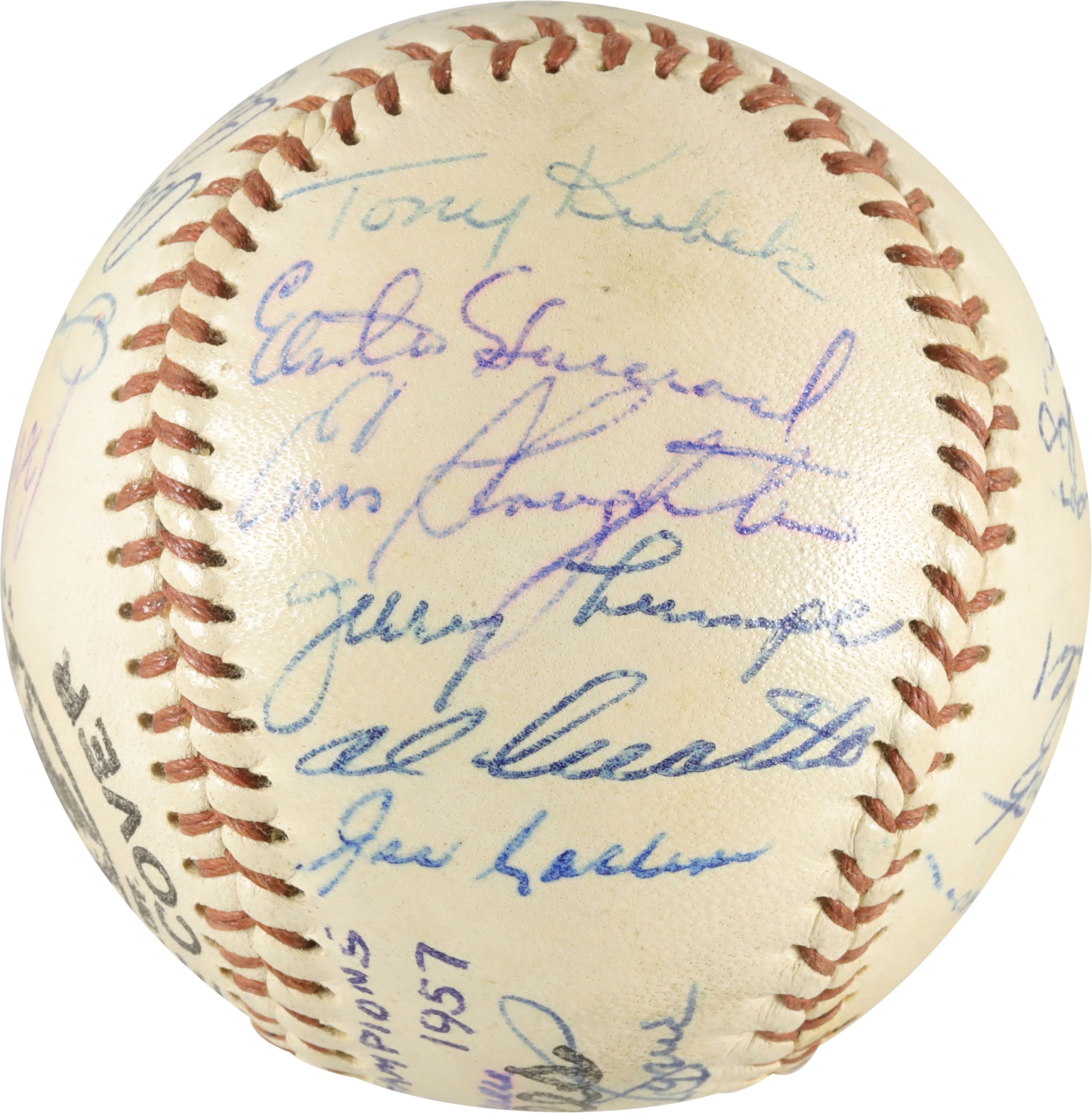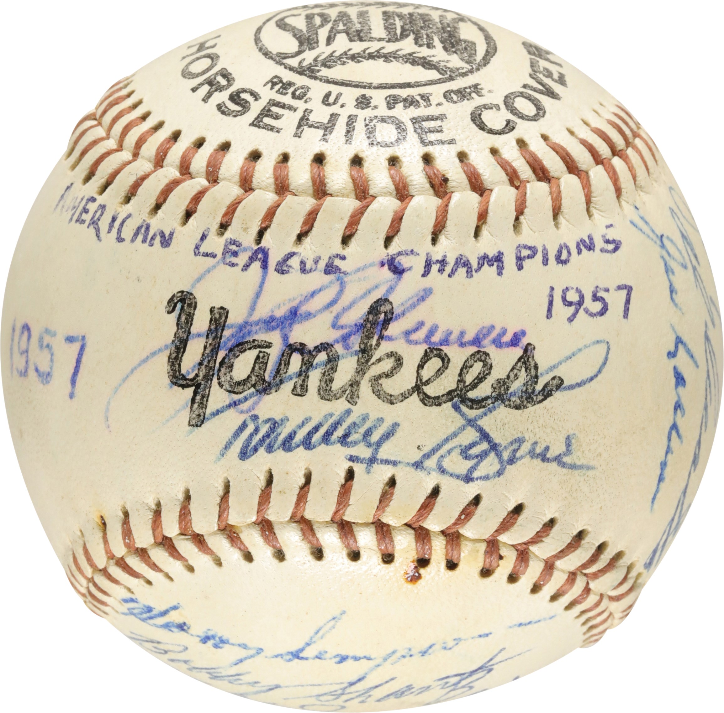 1957 New York Yankees team signed baseball. This Spalding Yankees logo ball is in near-mint condition and has  been signed by 25 members of the 1957 Yankees, including Mickey Mantle and Yogi Berra (on the sweet spot), Elston Howard, Tony Kubek, Bobby Shantz, Bob Turley, Hank Bauer, Whitey Ford, Enos Slaughter, Don Larsen, Bob Grim and others. "AMERICAN LEAGUE CHAMPIONS" and "1957" has been written on the ball in an unknown hand. "Yankees" is stamped on the ball in black ink. Includes a full LOA from PSA.