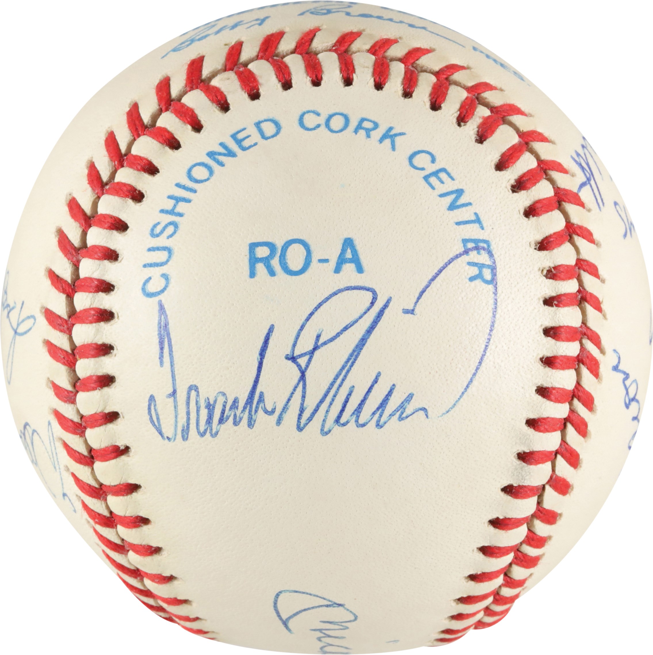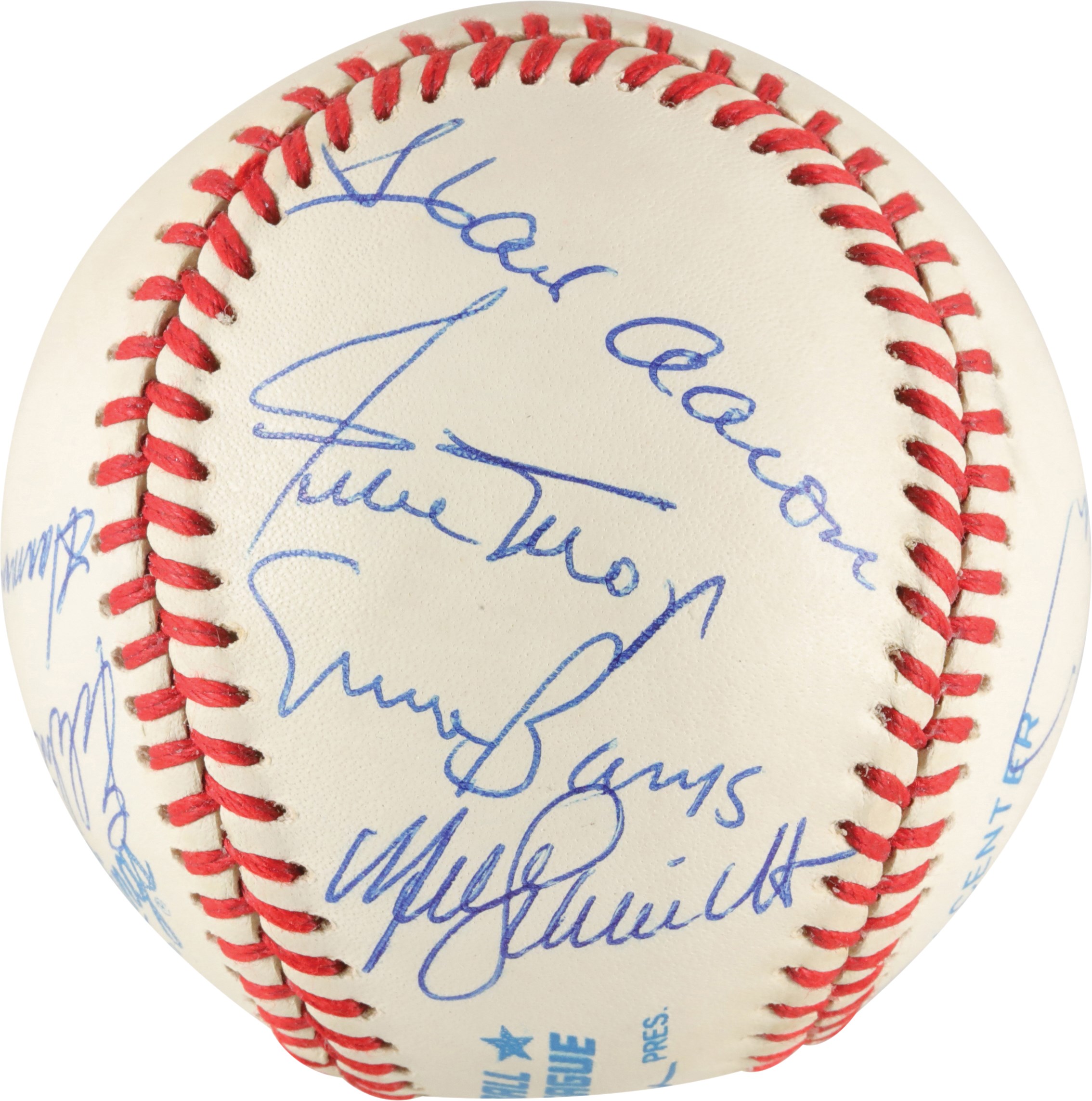 500 home run club signed baseball with 10 signatures. Mickey Mantle signed the sweet spot of this Rawlings Official American League (Brown) baseball. It is also signed by Frank Robinson, Eddie Mathews, Harmon Killebrew, Hank Aaron, Willie Mays, Ernie Banks, Mike Schmidt, Willie McCovey, and Reggie Jackson. The baseball is in near-mint condition, and the signatures rate 9/10. Includes a full LOA from PSA.