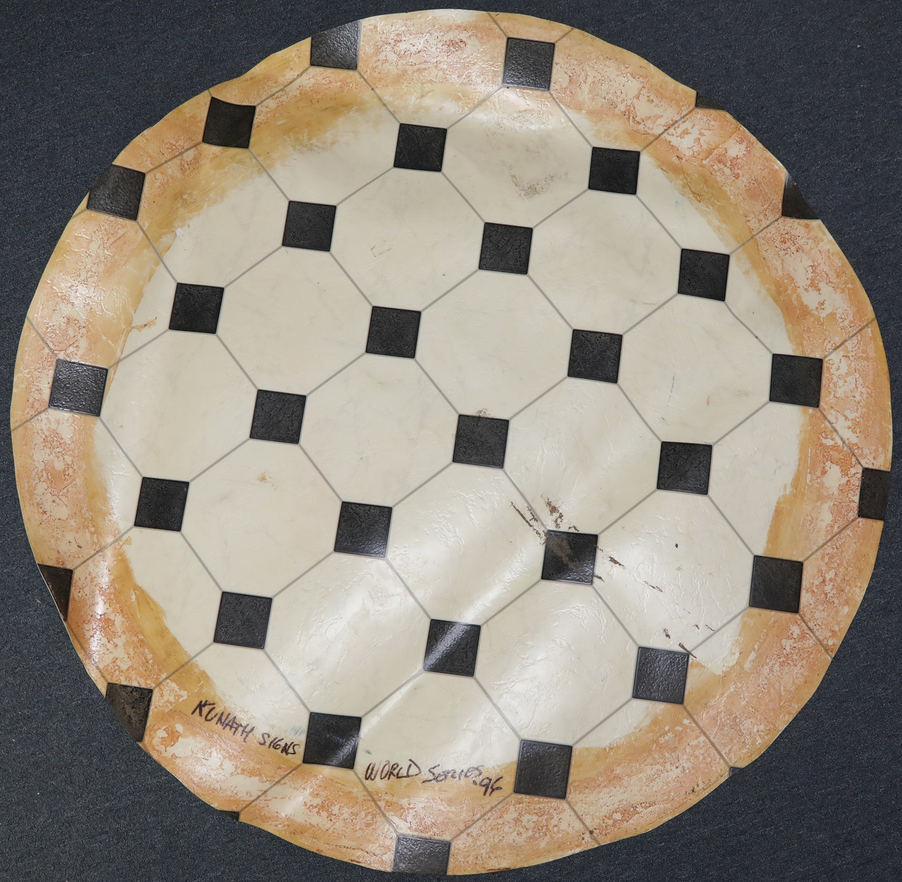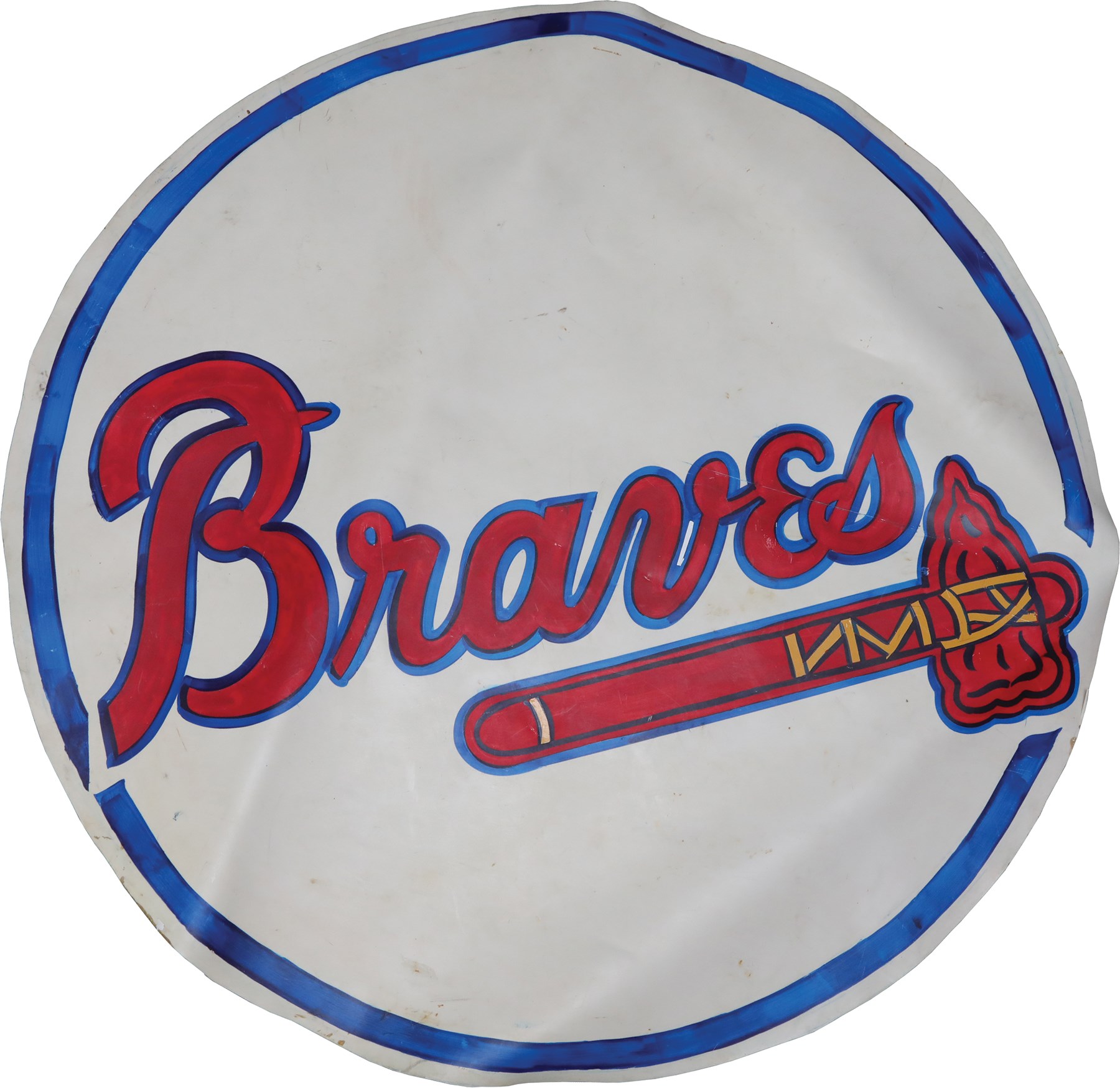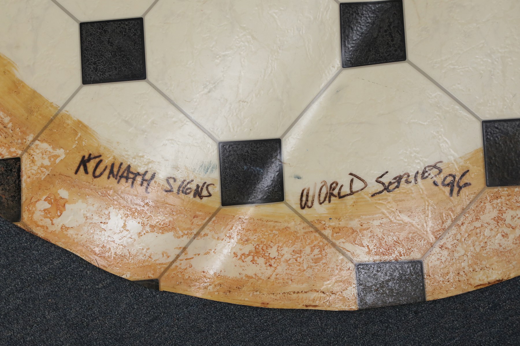 1996 Atlanta Braves World Series on deck circle. This unique stadium artifact is 53" in diameter and was used by the Braves in the 1996 World Series vs. the New York Yankees. The Braves made their second straight World Series in 1996, led by a lineup that included Chipper Jones, Javy Lopez, and Andruw Jones. These players, and more, took swings in this on deck circle as they waited their turn to bat against David Cone, Jimmy Key, Mariano Rivera, and the rest of the Yankee pitchers. The Braves tomahawk logo is painted on the on deck circle. "KUNATH SIGNS, WORLD SERIES '96" is written on the back of the circle in black ink.