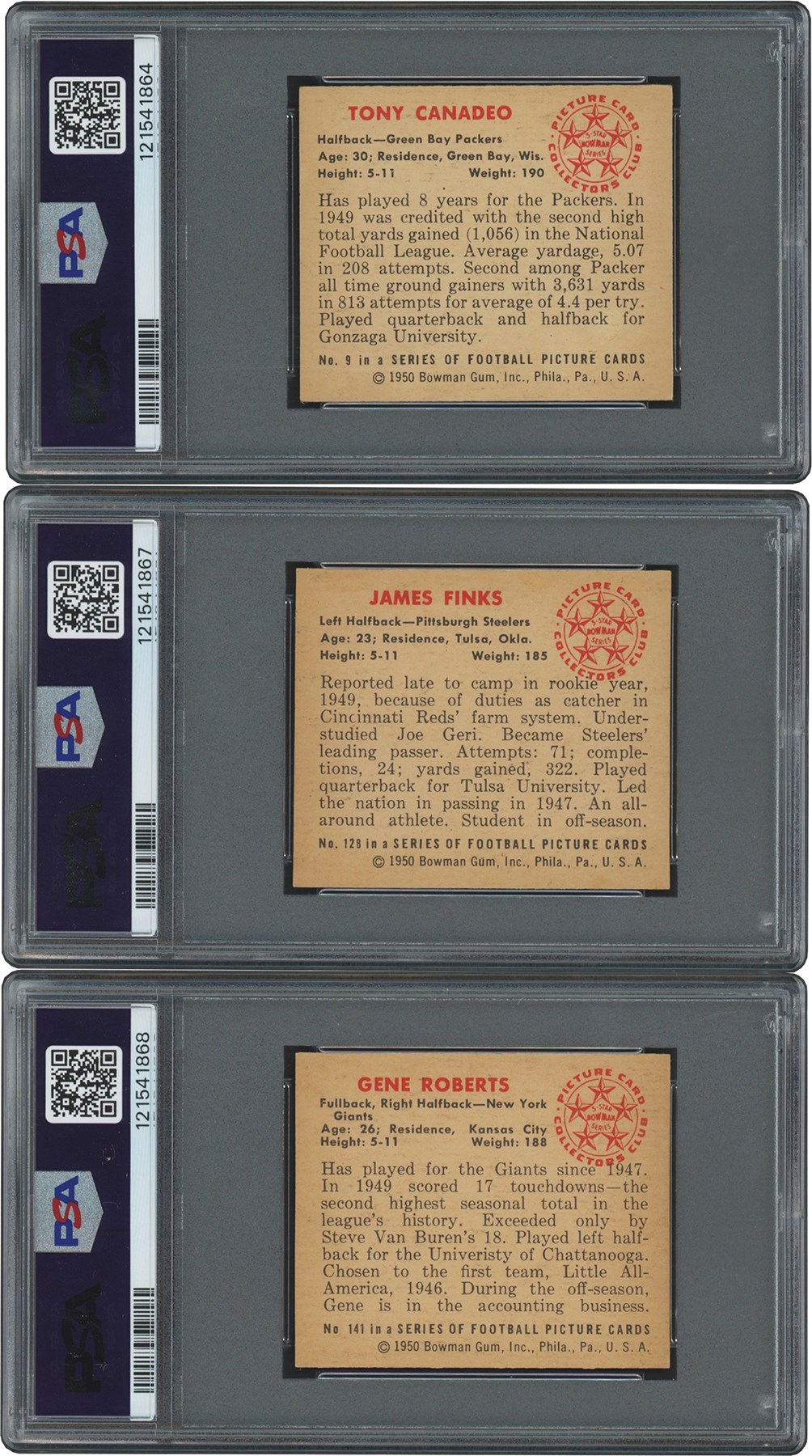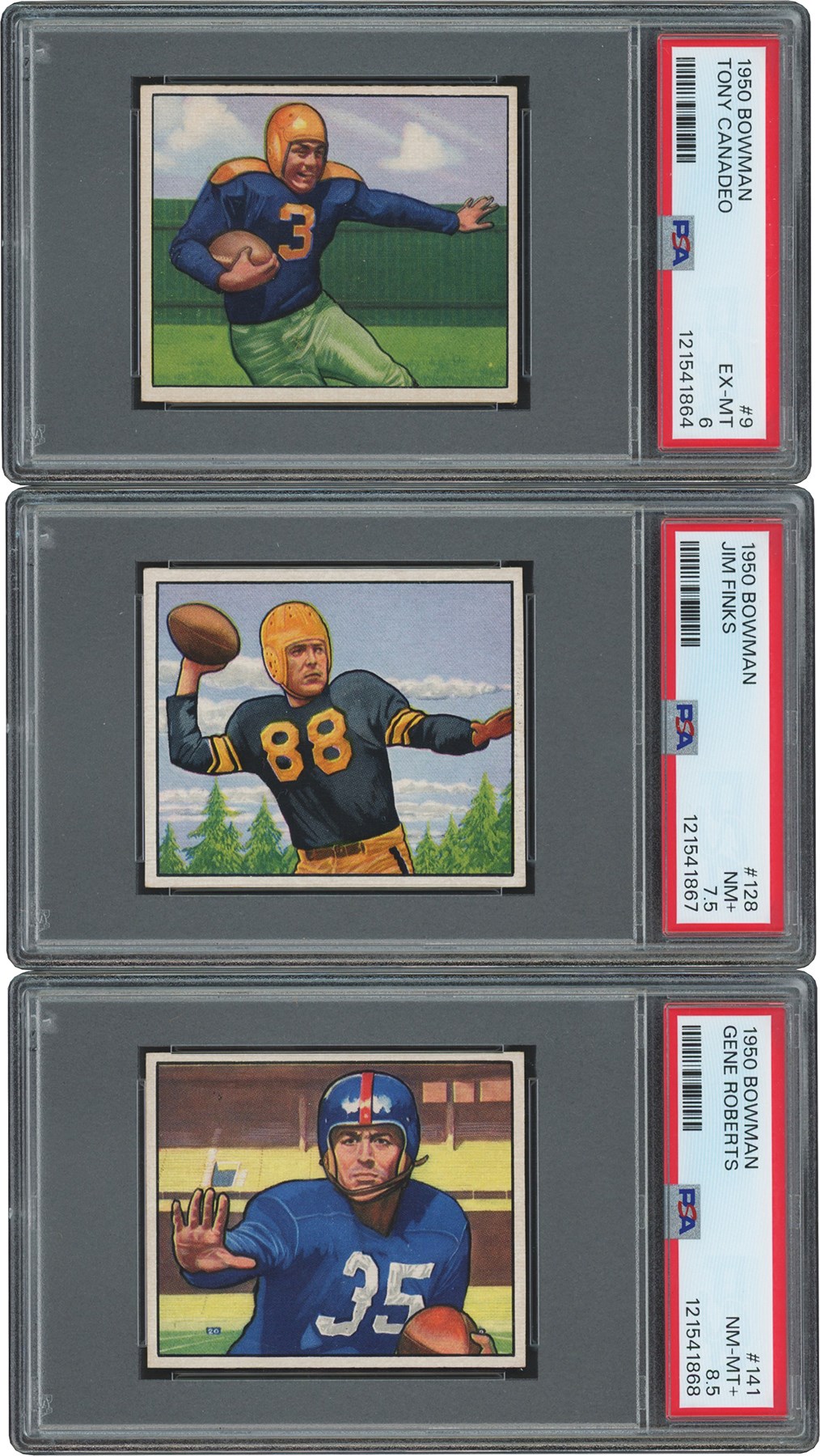 This lot features a collection of (3) High Grade PSA graded 1950 Bowman Football cards. All cards are hobby fresh and were recently graded by PSA including: #9 Tony Canadeo PSA EX-MT 6; #128 Jim Finks PSA NM+ 7.5; and #141 Gene Roberts PSA NM-MT+ 8.5.