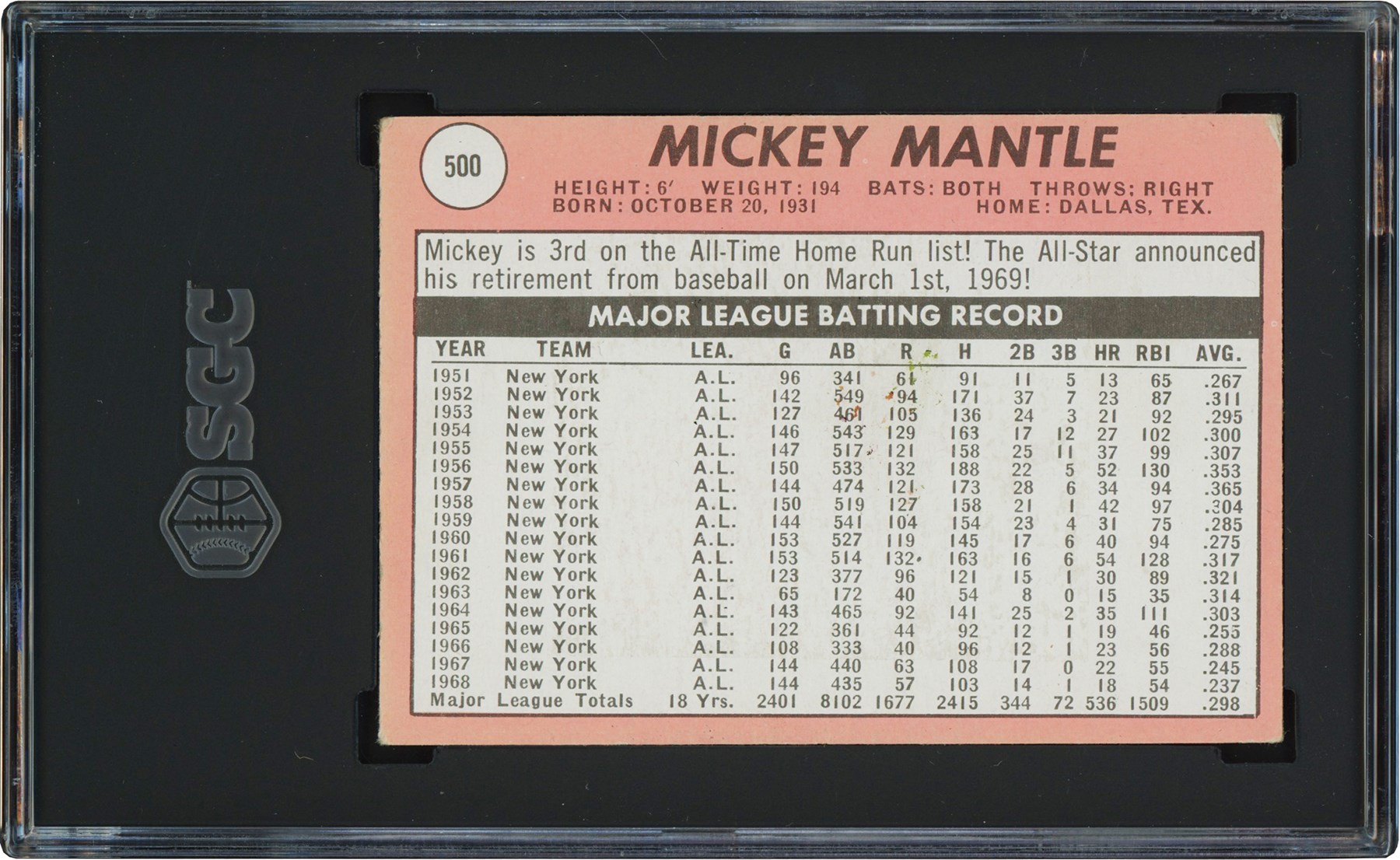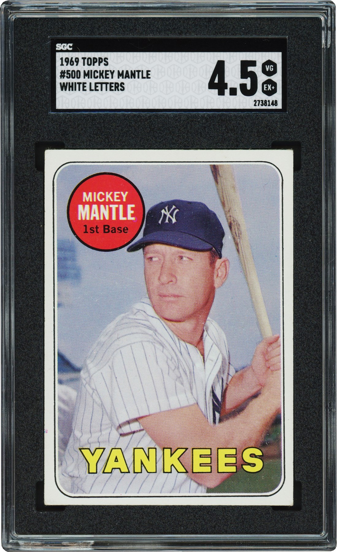 Lot # 86: 1969 Topps Baseball #500 Mickey Mantle (White Letters) SGC VG-EX+ 4.5