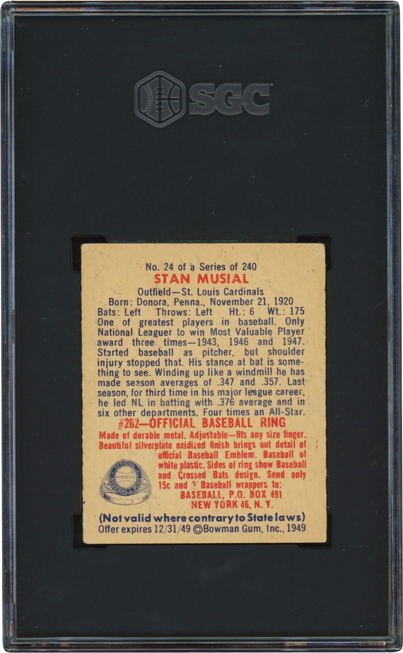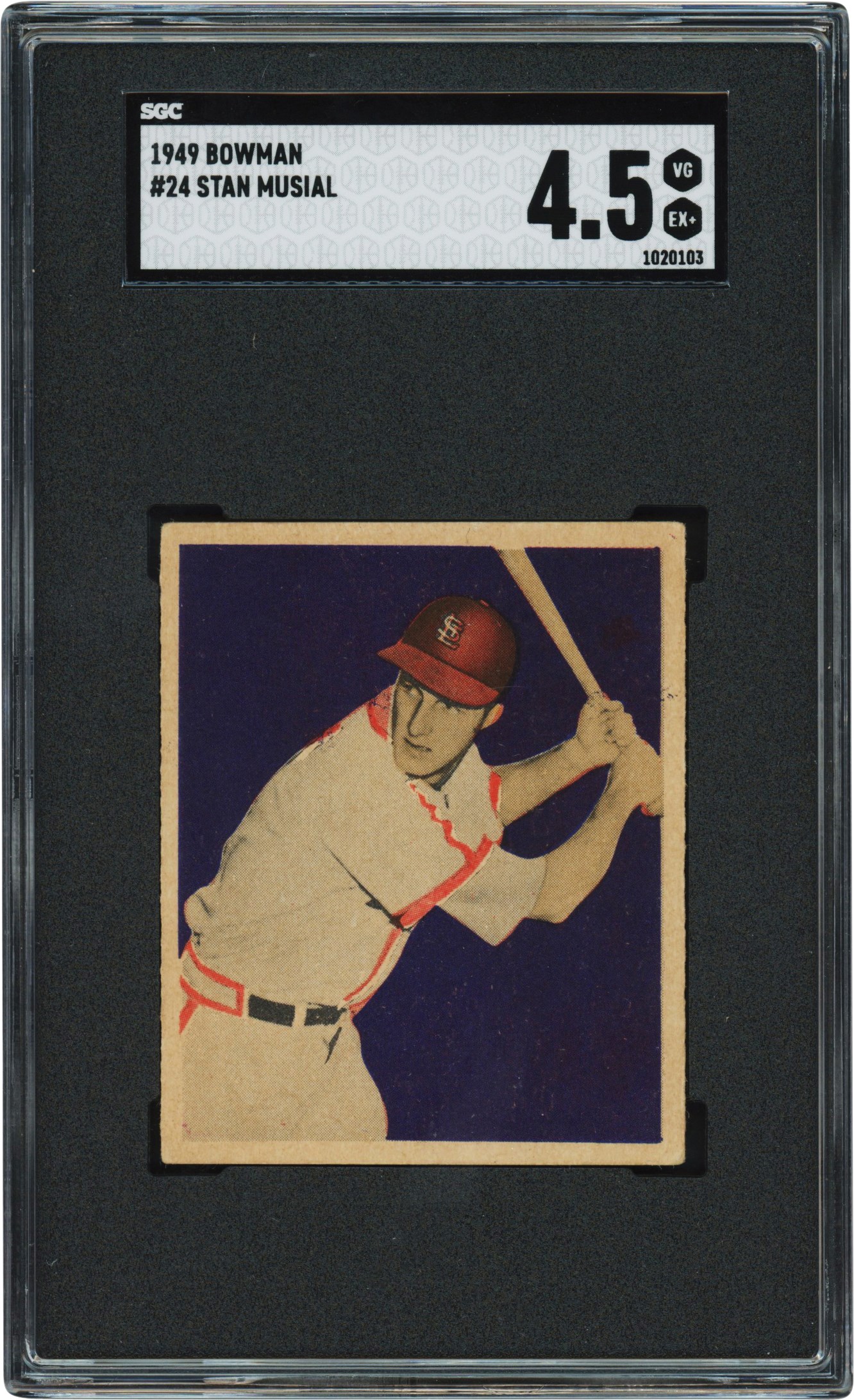 1949 Bowman Baseball 24 Stan Musial card. The card has been graded and encapsulated by SGC VG-EX+ 4.5. It has a colorful image of Musial with bat at the ready set against a dark blue background. The edges appear smooth. Centering is slightly off both top to bottom and left to right. All four corners exhibit light wear. The reverse is bright and clean.