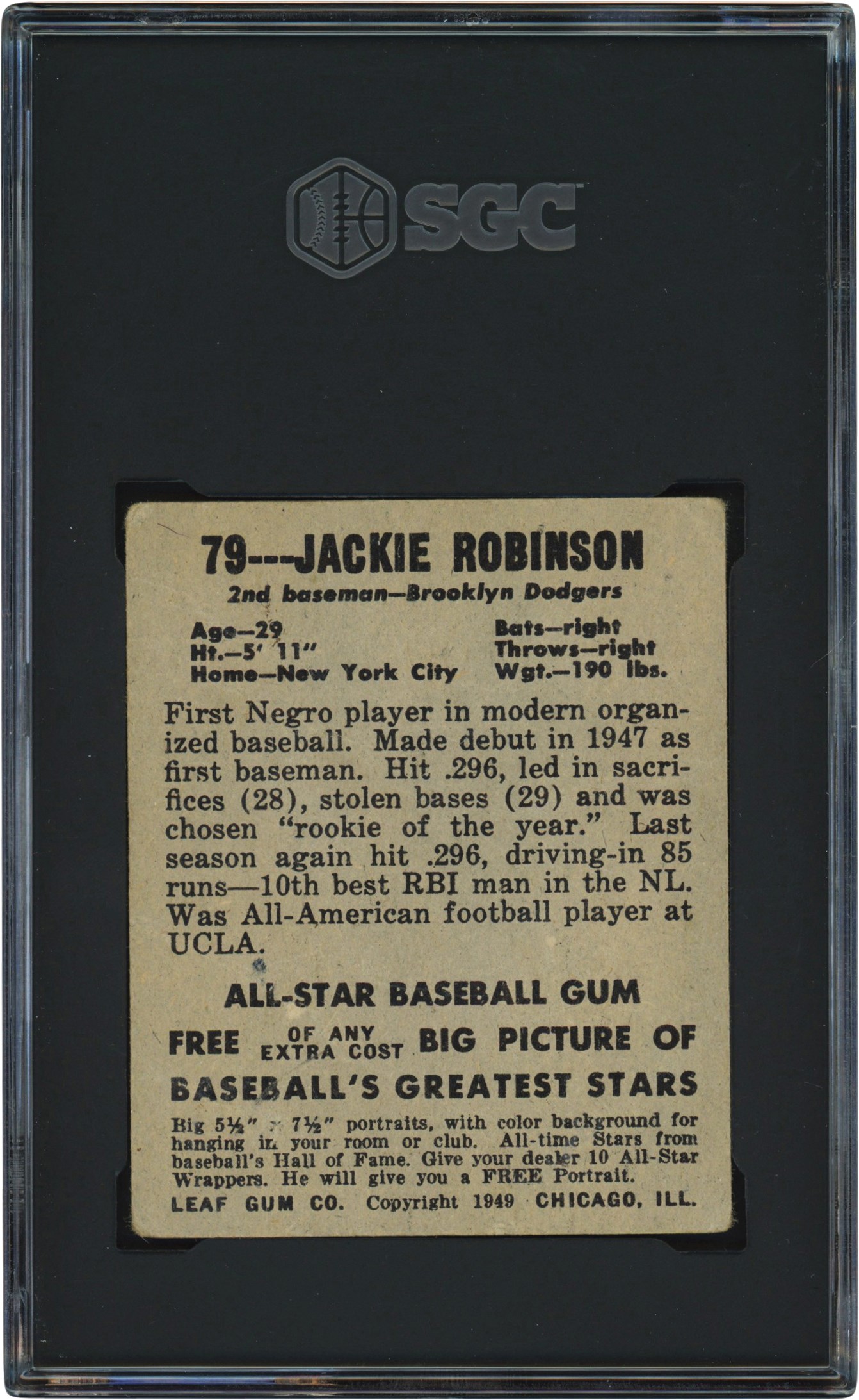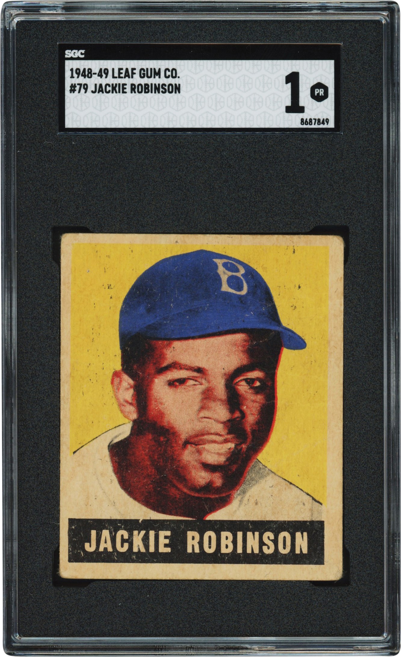 1948 Leaf Baseball 79 Jackie Robinson card. The card has been graded and encapsulated by SGC PR 1. It has a colorful head shot image of Robinson set against a yellow background. The edges have light scattered areas of roughness. Centering is off left to right. There are multiple creases throughout with some affecting the Robinson image. All four corners are rounded. The reverse is bright and clean outside of the previously mentioned creasing.