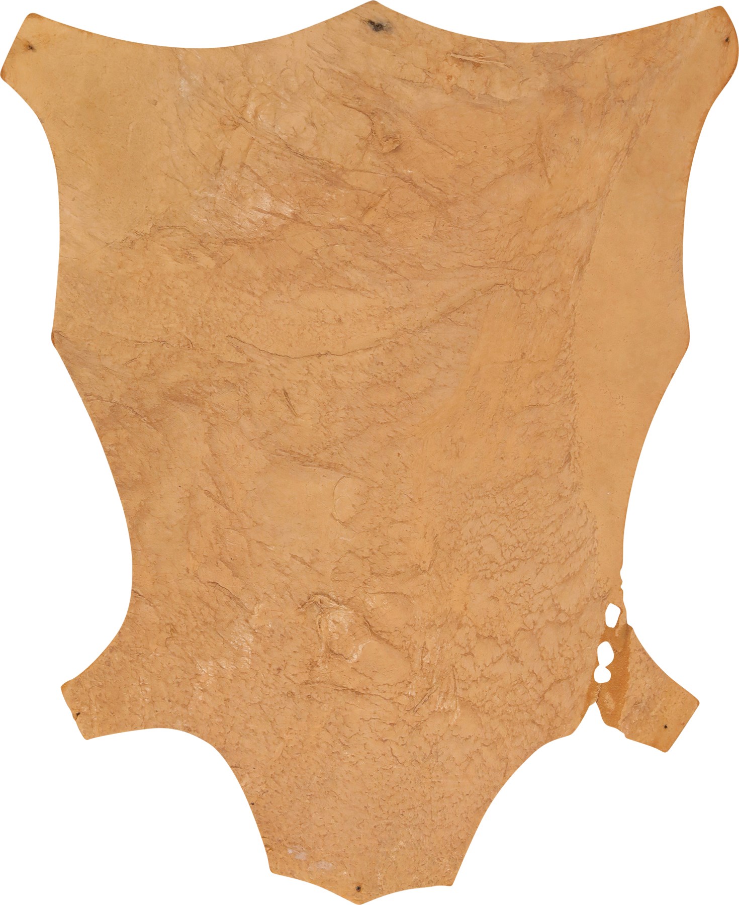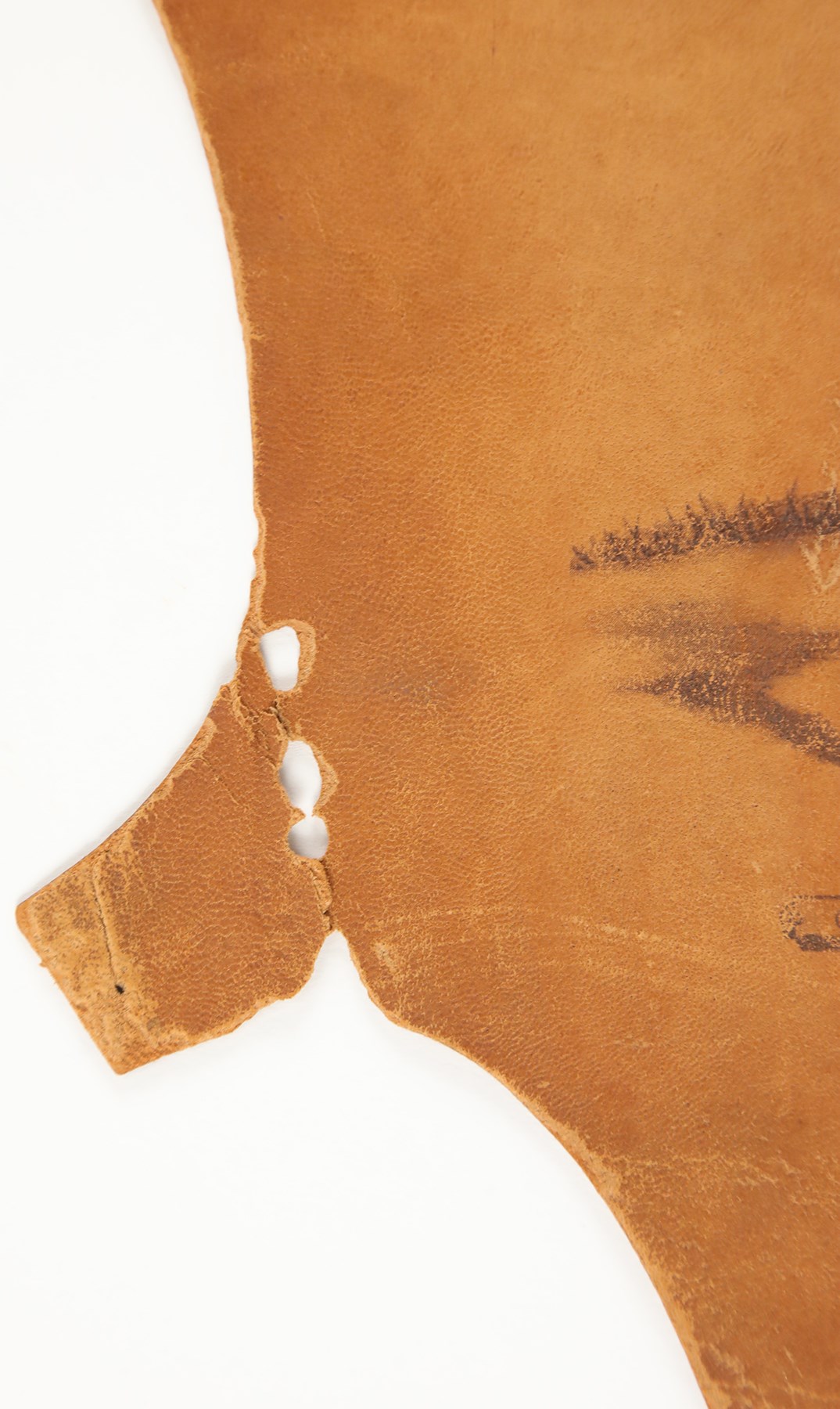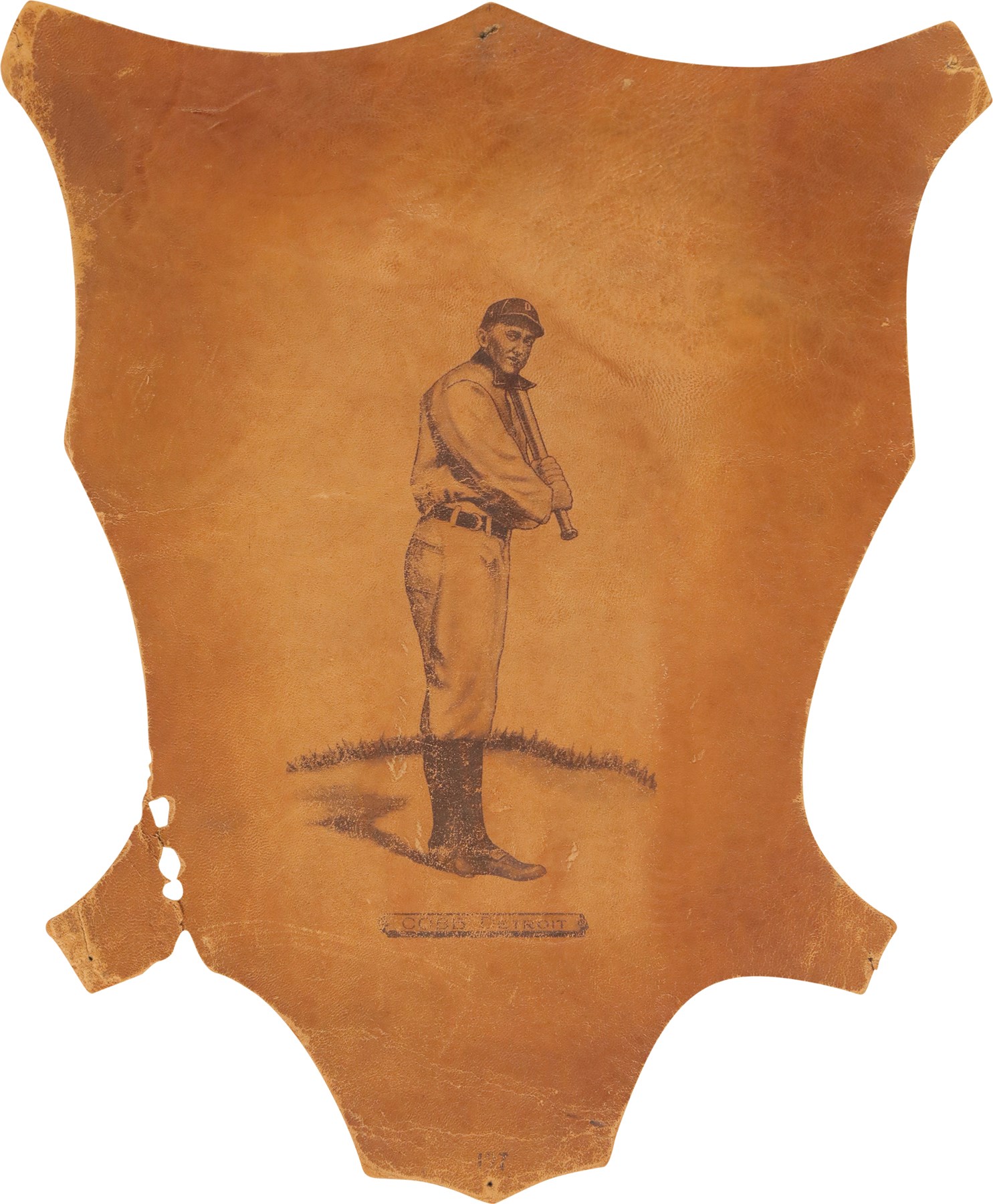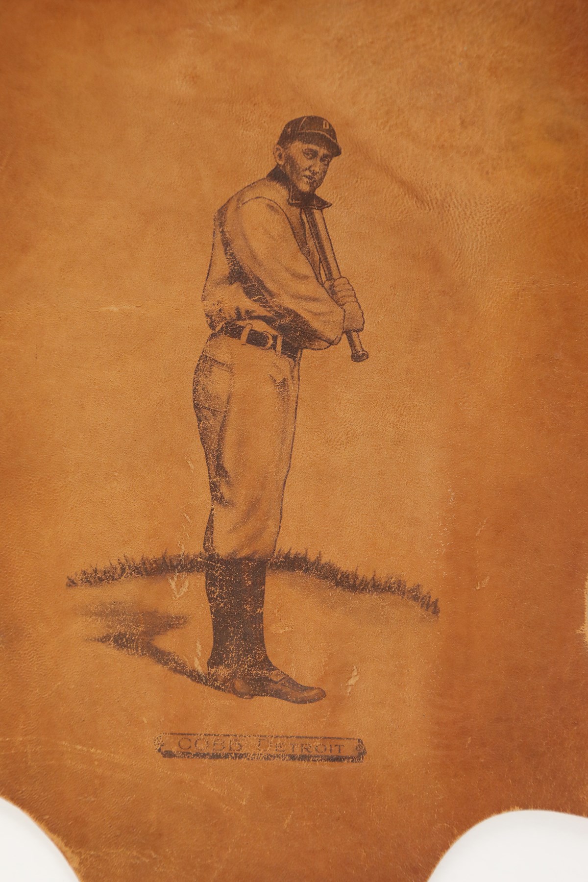 1912 L1 Helmar Leathers 102 Ty Cobb premium. The Leathers were available for 50 Helmar coupons and feature drawings on a 10x12" piece of leather. This example features Ty Cobb with bat on shoulder which has scattered color loss. The leather is damaged with three holes near the bottom left "leg' and six pin holes located at the tip of each "appendage" of the piece. There are scattered rubs and creases throughout. The reverse exhibits scattered wear and rubbing as well as an old repair to the previously mentioned three "leg" holes on the bottom left. A rarely seen issue!