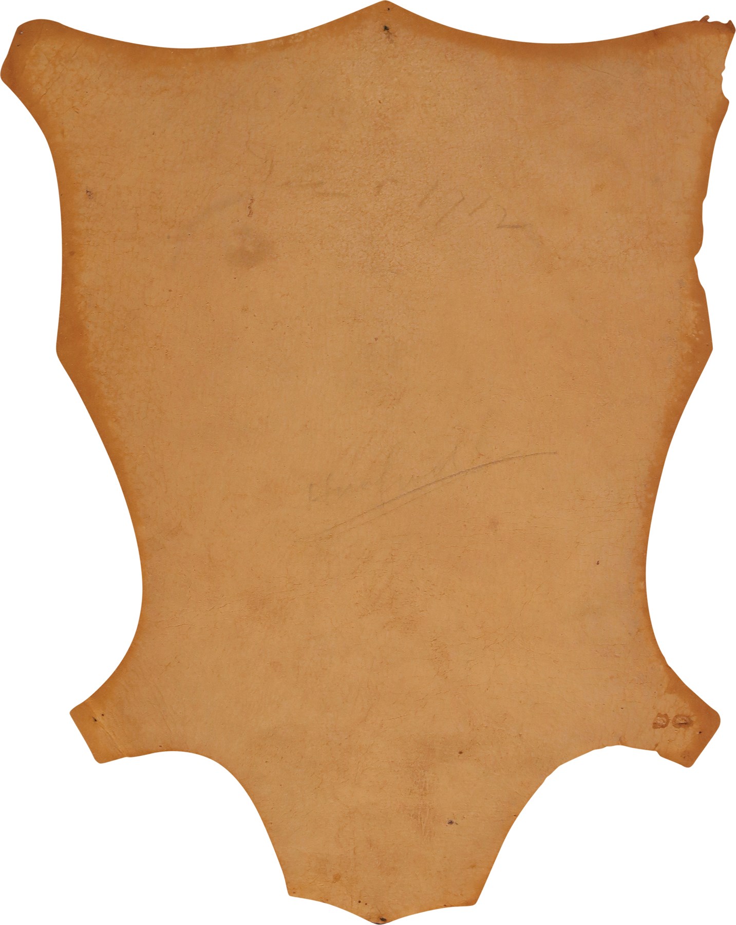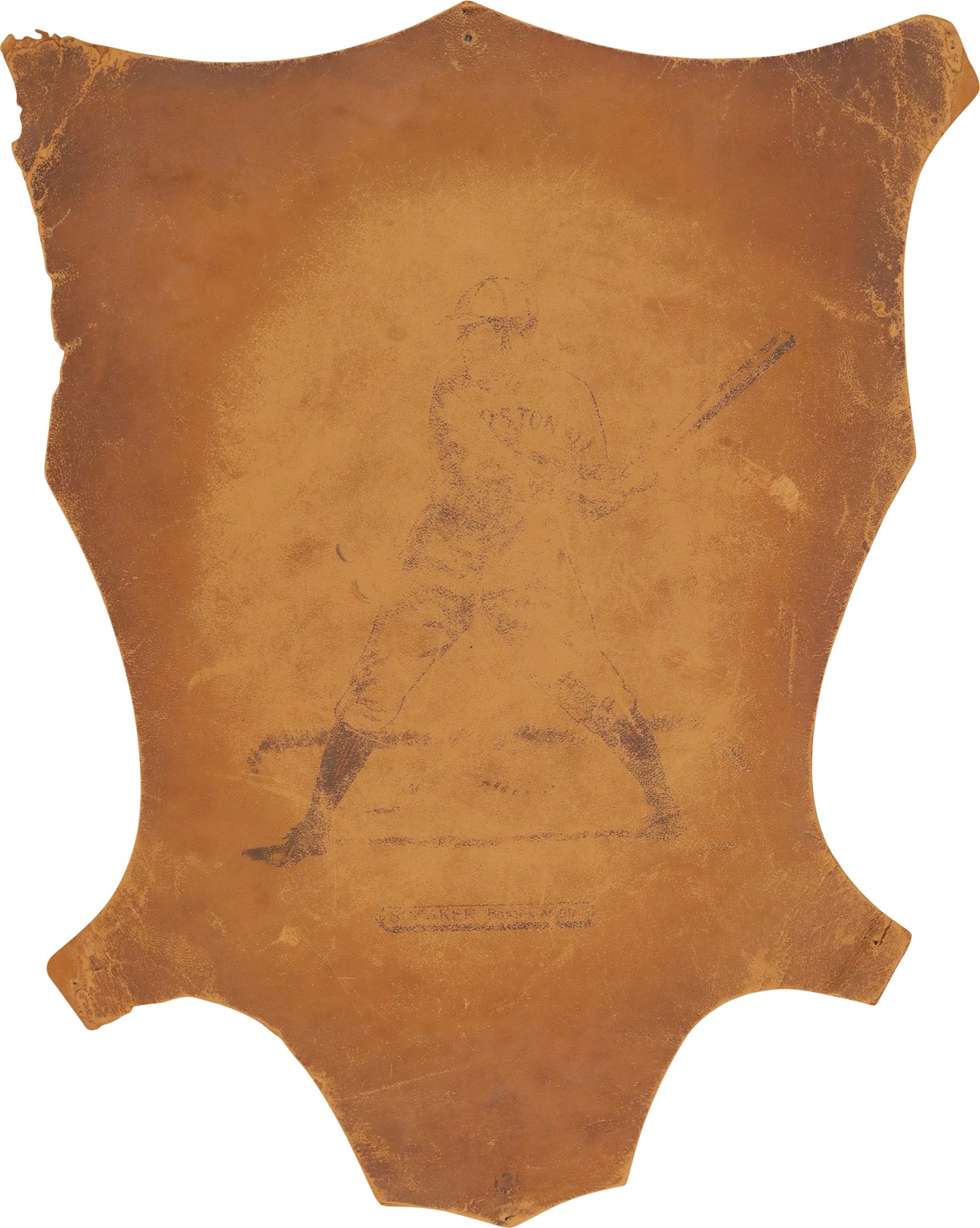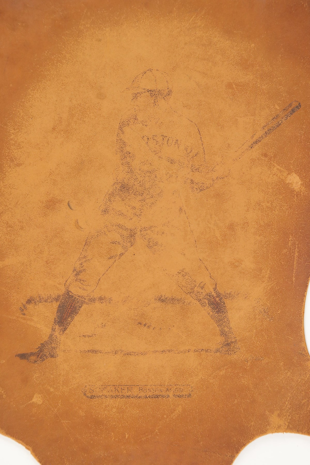 1912 L1 Helmar Leathers 106 Tris Speaker premium. The Leathers were available for 50 Helmar coupons and feature drawings on a 10x12" piece of leather. This example features Tris Speaker i a batting pose which is well worn and faded. The leather is missing a portion of its top left corner with additional scattered edge and corner wear throughout. There is a pin hole at the top of the piece over the image of Speaker as well as in the bottom left and right "legs". Scattered rubbing and creasing are evident on both the front and back of the piece A rarely seen issue!