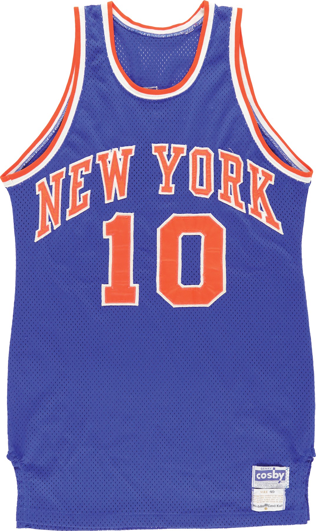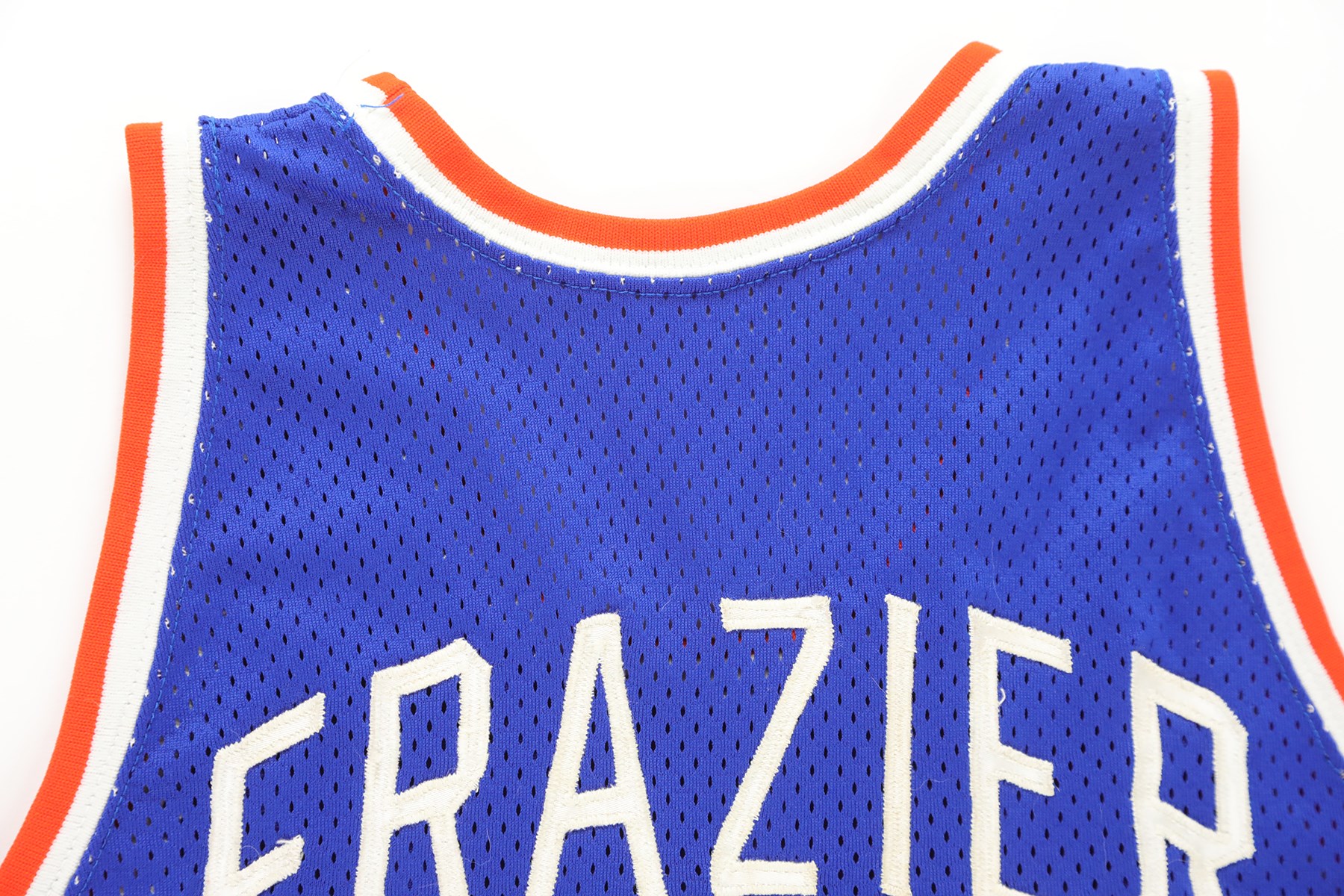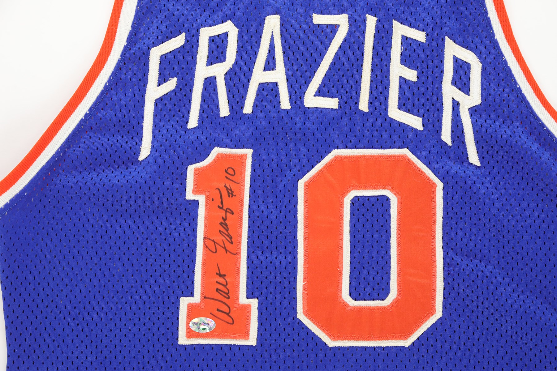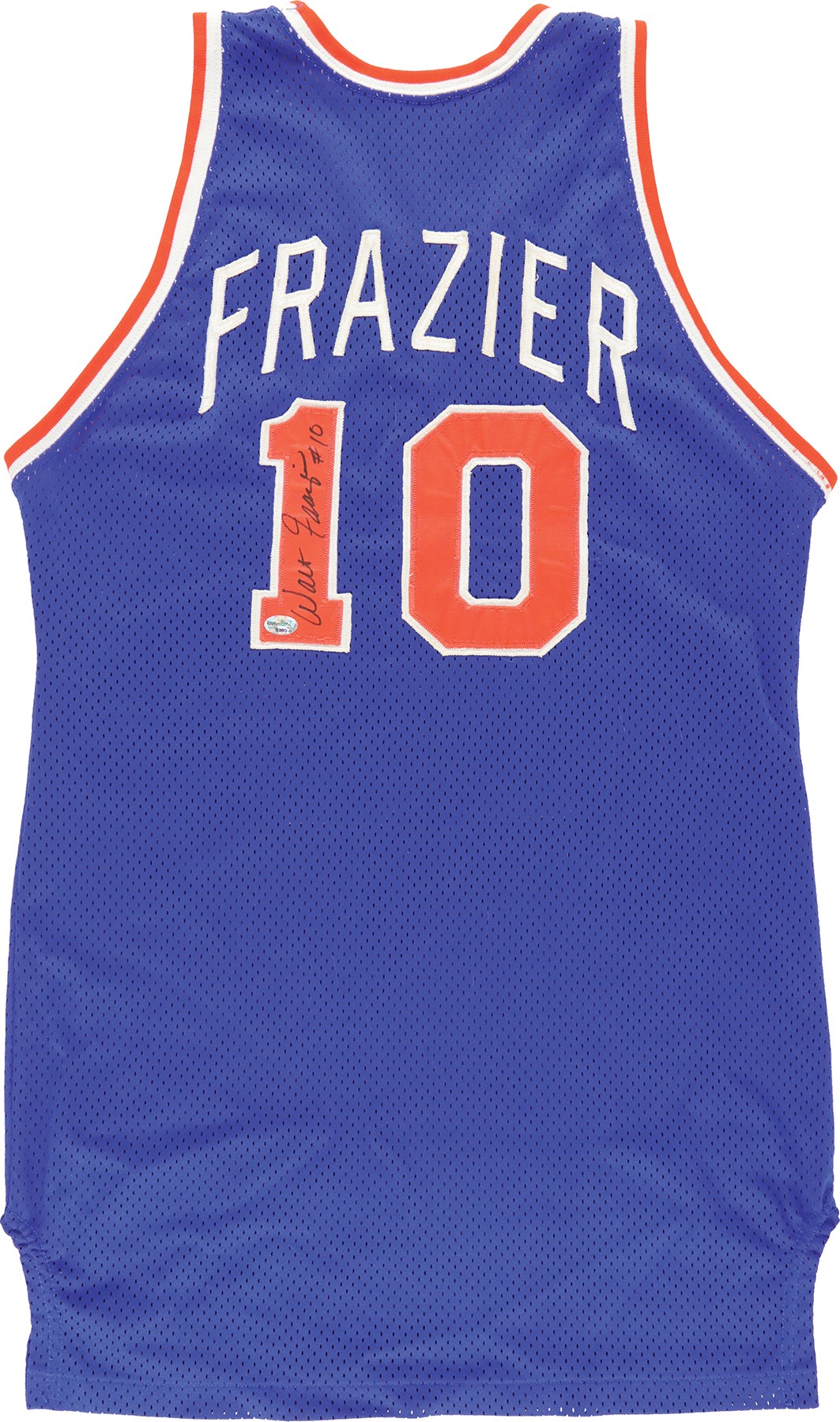 The blue mesh jersey is lettered "New York" across the front and features the number "10" on the front and reverse. "Frazier" is lettered on the reverse, directly above the number. All numerals and front lettering are applied in orange on white tackle twill. All reverse letters are applied in white tackle twill. Both a "Cosby" label and a "Medalist/Sand-Knit 40" label appear on the left front tail. Frazier has inscribed the jersey "Walt Frazier #10" in black Sharpie (grading 9/10) on the reverse numeral "1." The jersey is original as issued and displays heavy wear, including puckering to numerals. Full LOA from MEARS (base grade of 10, with 5 points deducted for the smaller size). Full LOA from PSA (for the signature only). There is also a hologram label from Halloffamesports.com (for the signature) affixed to the reverse numeral "1."