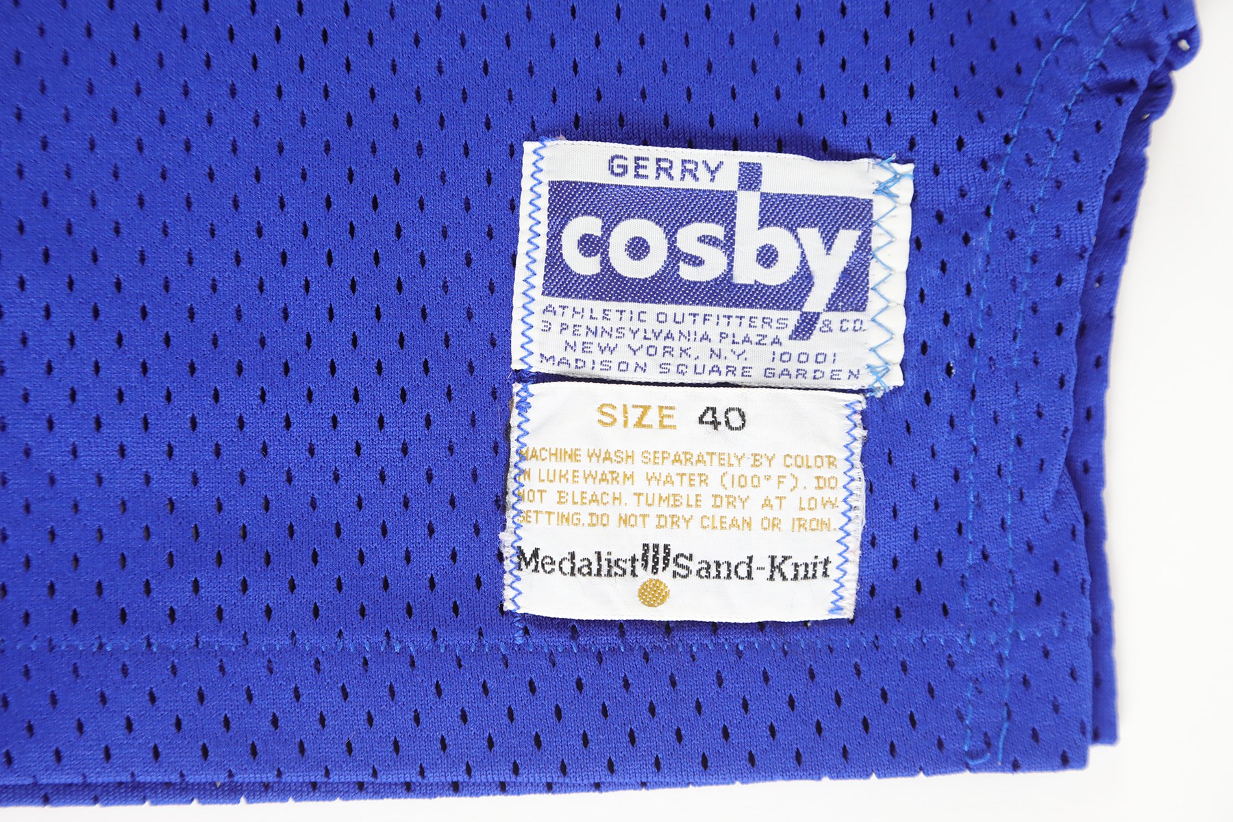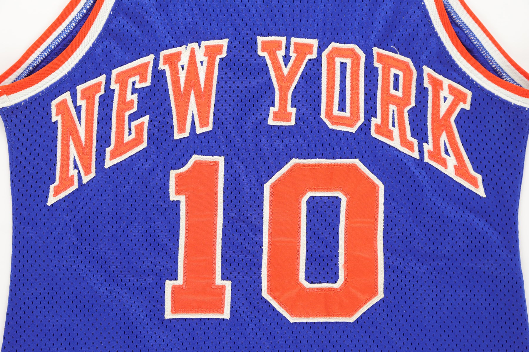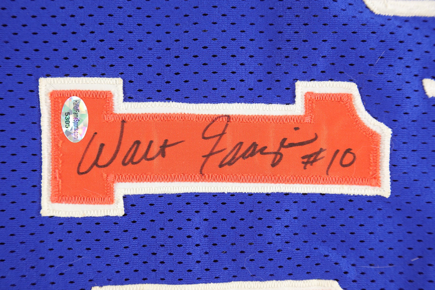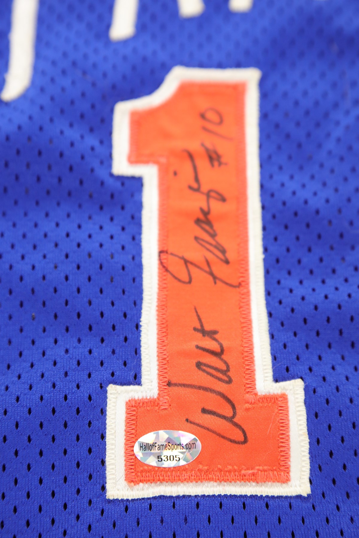 The blue mesh jersey is lettered "New York" across the front and features the number "10" on the front and reverse. "Frazier" is lettered on the reverse, directly above the number. All numerals and front lettering are applied in orange on white tackle twill. All reverse letters are applied in white tackle twill. Both a "Cosby" label and a "Medalist/Sand-Knit 40" label appear on the left front tail. Frazier has inscribed the jersey "Walt Frazier #10" in black Sharpie (grading 9/10) on the reverse numeral "1." The jersey is original as issued and displays heavy wear, including puckering to numerals. Full LOA from MEARS (base grade of 10, with 5 points deducted for the smaller size). Full LOA from PSA (for the signature only). There is also a hologram label from Halloffamesports.com (for the signature) affixed to the reverse numeral "1."