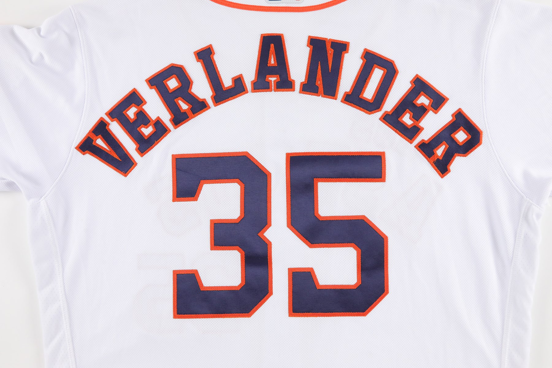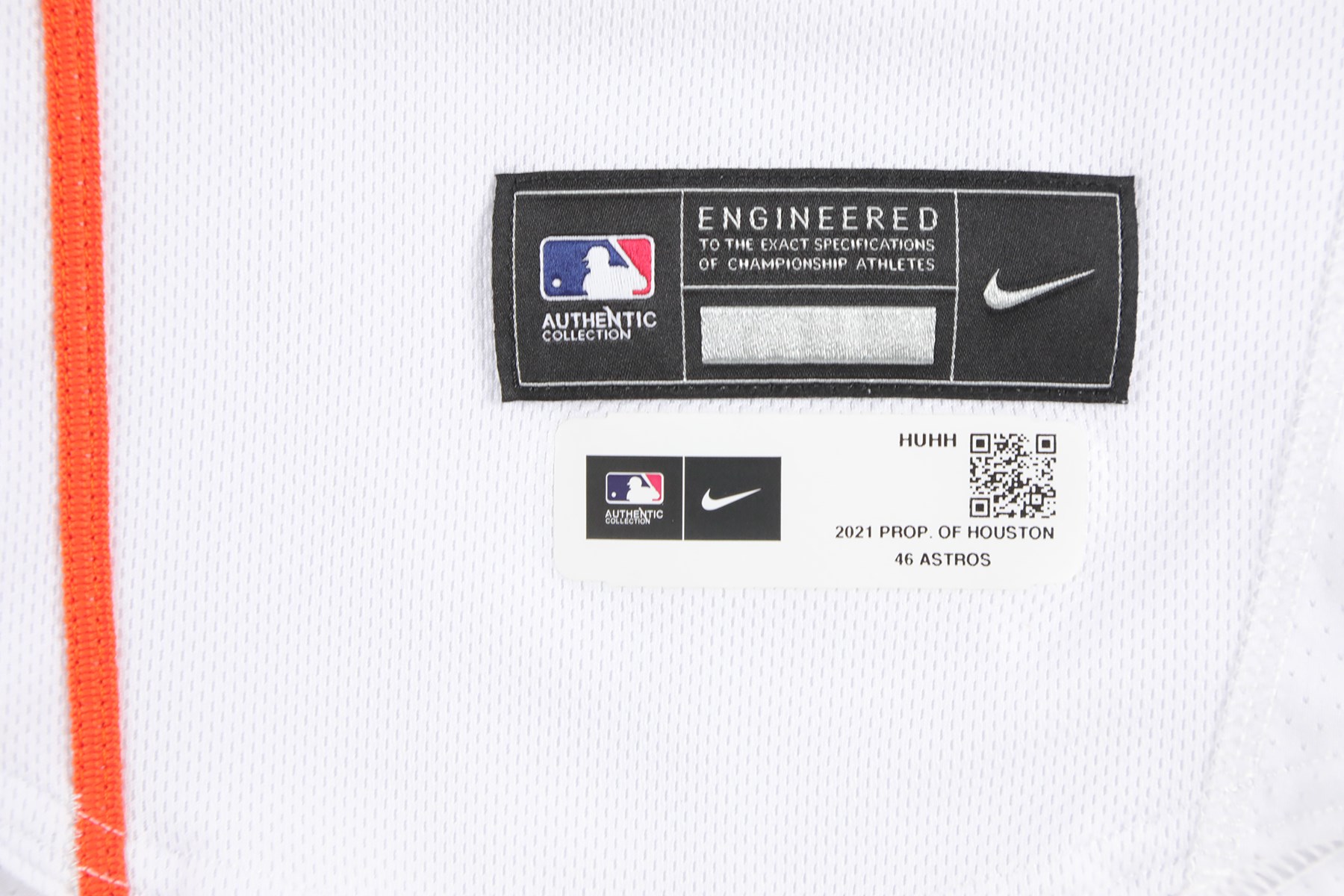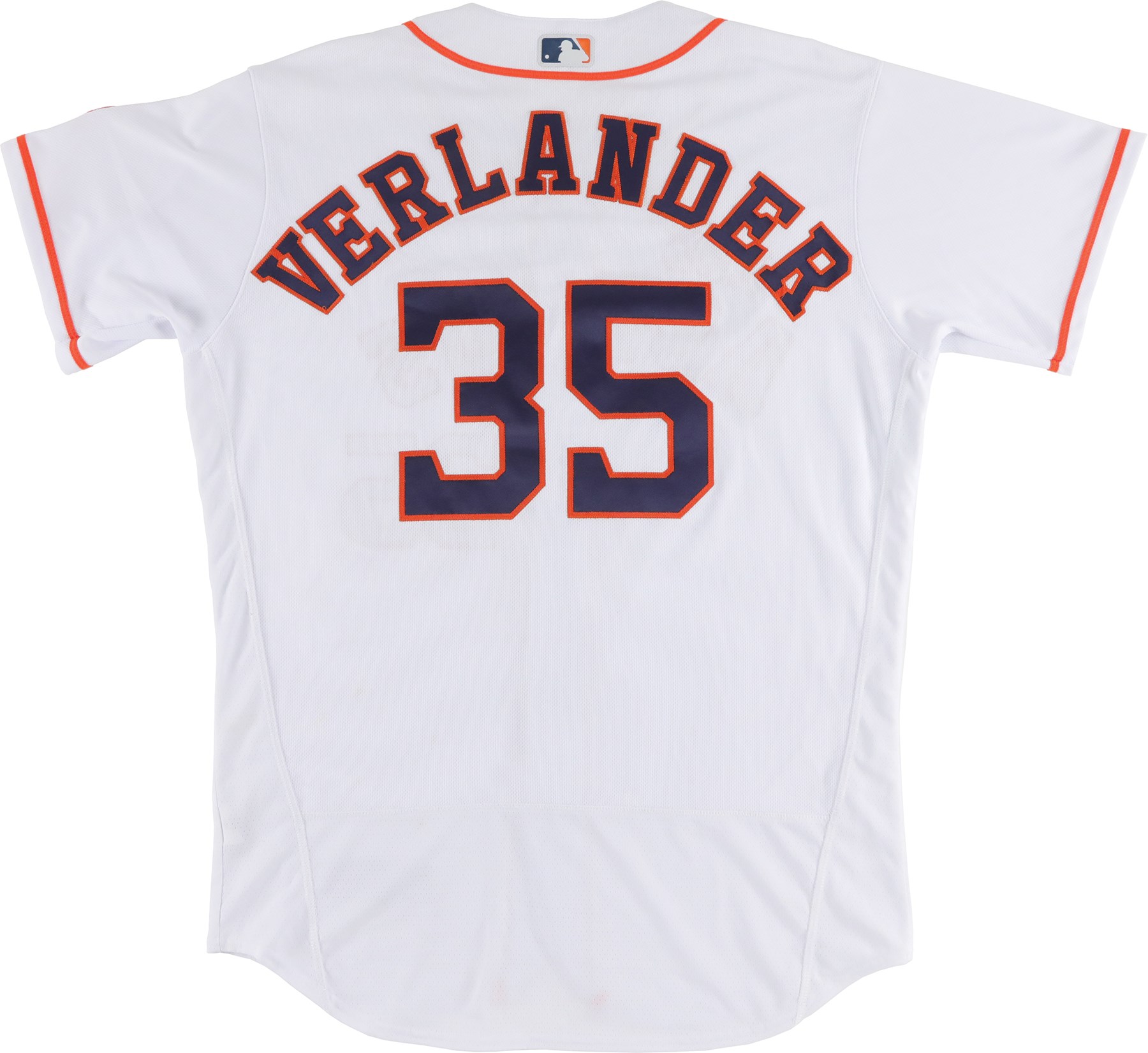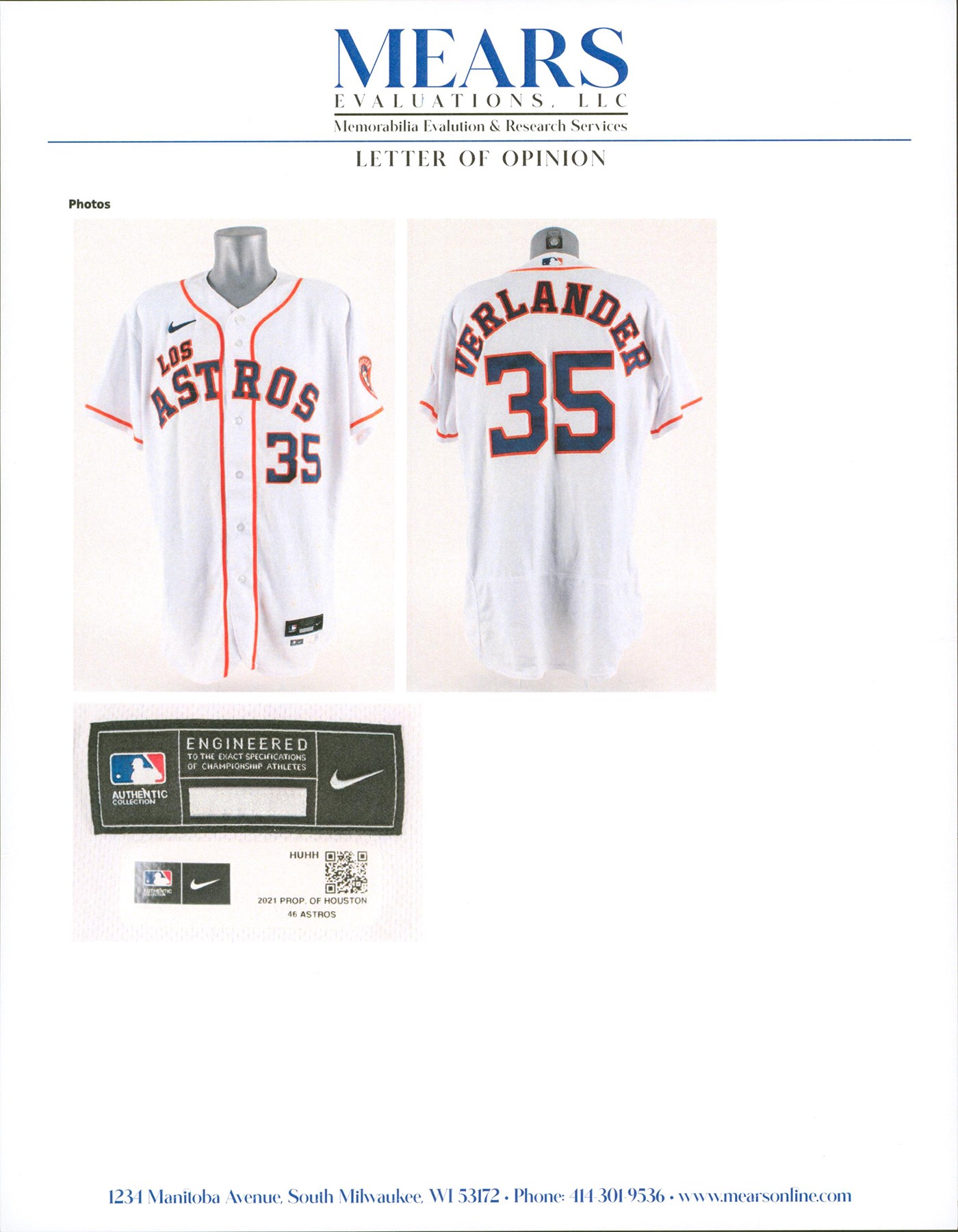 2021 Justin Verlander Houston Astros "Los Astros" alternate team game issued jersey. A patch with the MLB Authentic logo and Nike swoosh logo is sewn to the front left tail of the jersey. Below the tag is a white decal that includes a QR Code. "HUHH", "2021 PROP. OF HOUSTON", and "46 ASTROS" is typed on the tag in black ink. "LOS ASTROS" and "35" are sewn across the front of the jersey. The Nike swoosh logo is also present, just above "LOS". "VERLANDER" and "35" are sewn to the back of the jersey, and the MLB logo is at the back neck area. The Houston Astros logo patch is sewn to the left sleeve. The jersey shows no signs of game use as Verlander was injured and did not pitch during the 2021 season. However, there are some stain marks on the front of the jersey. The jersey has been graded A5 by MEARS, and a full LOA is included.