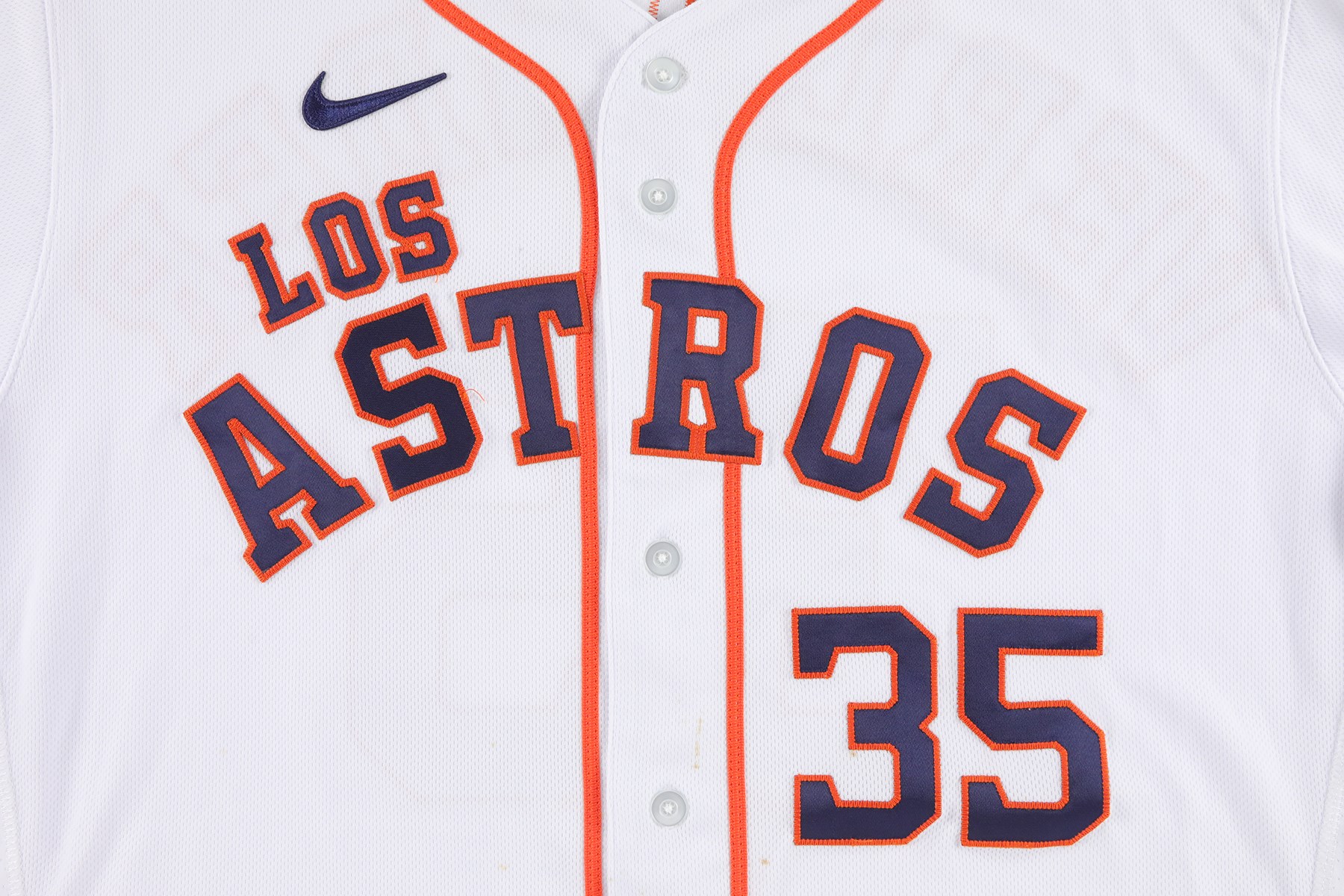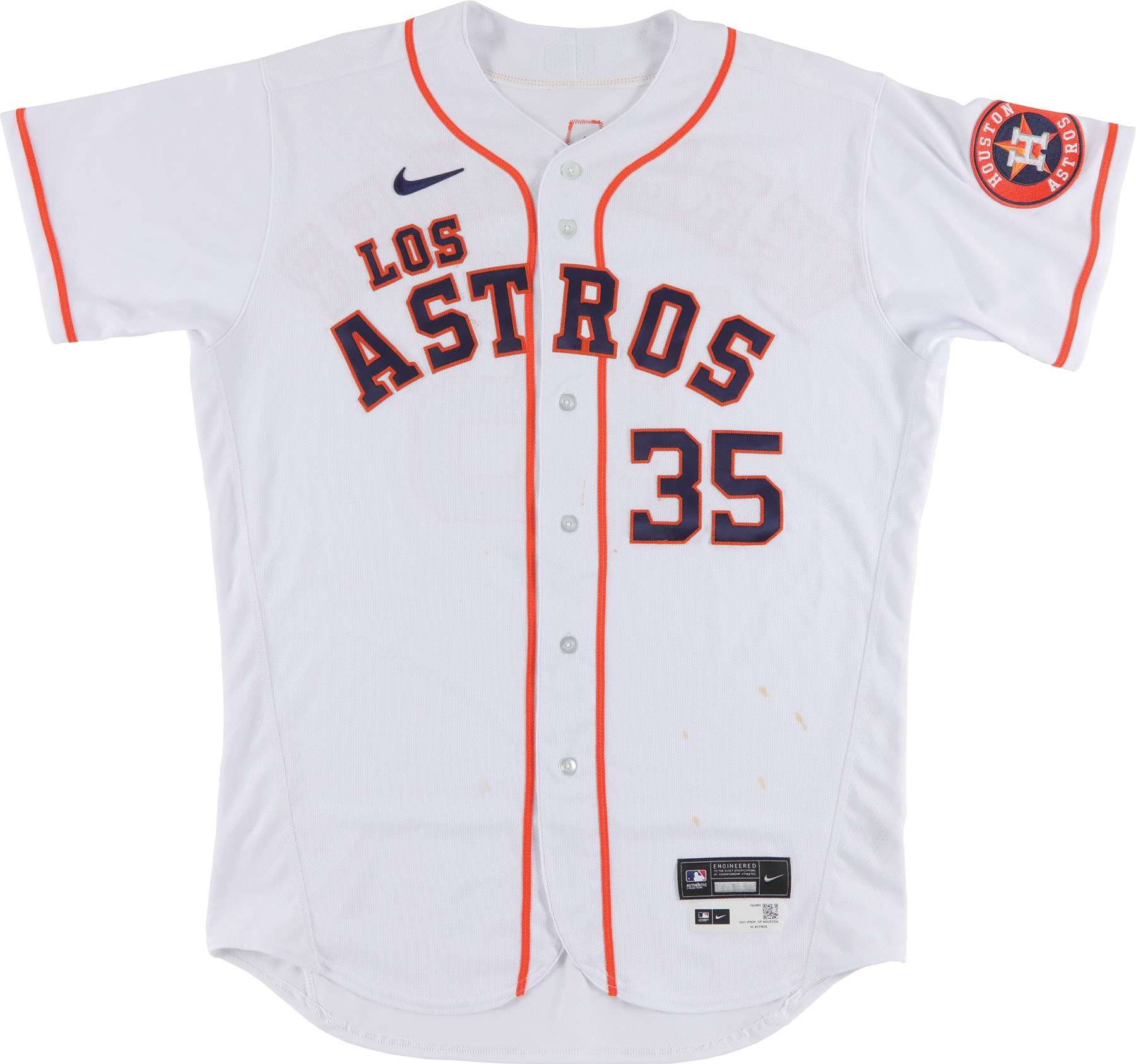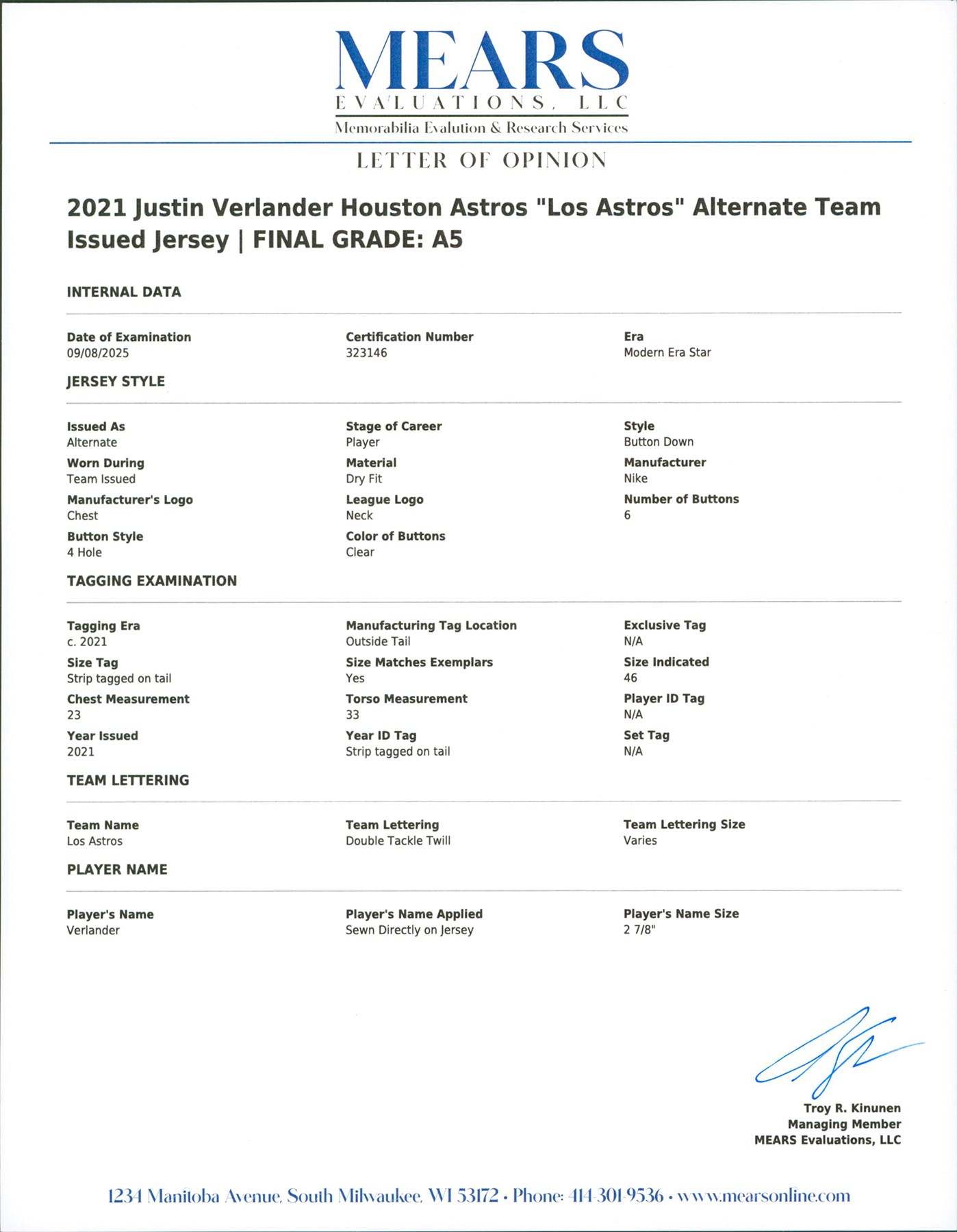 2021 Justin Verlander Houston Astros "Los Astros" alternate team game issued jersey. A patch with the MLB Authentic logo and Nike swoosh logo is sewn to the front left tail of the jersey. Below the tag is a white decal that includes a QR Code. "HUHH", "2021 PROP. OF HOUSTON", and "46 ASTROS" is typed on the tag in black ink. "LOS ASTROS" and "35" are sewn across the front of the jersey. The Nike swoosh logo is also present, just above "LOS". "VERLANDER" and "35" are sewn to the back of the jersey, and the MLB logo is at the back neck area. The Houston Astros logo patch is sewn to the left sleeve. The jersey shows no signs of game use as Verlander was injured and did not pitch during the 2021 season. However, there are some stain marks on the front of the jersey. The jersey has been graded A5 by MEARS, and a full LOA is included.