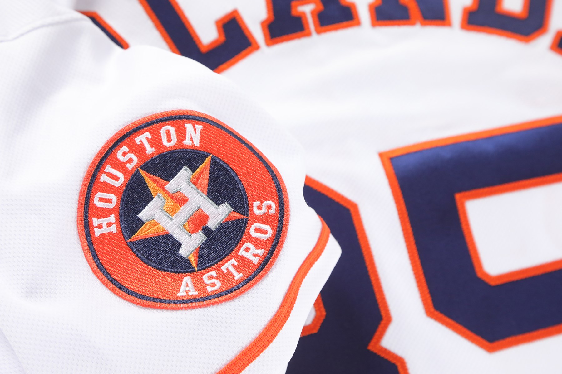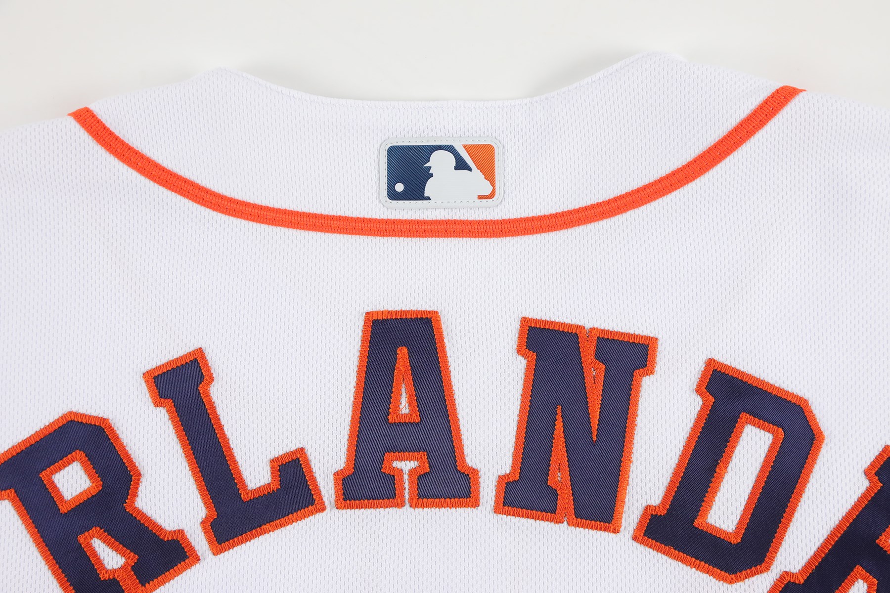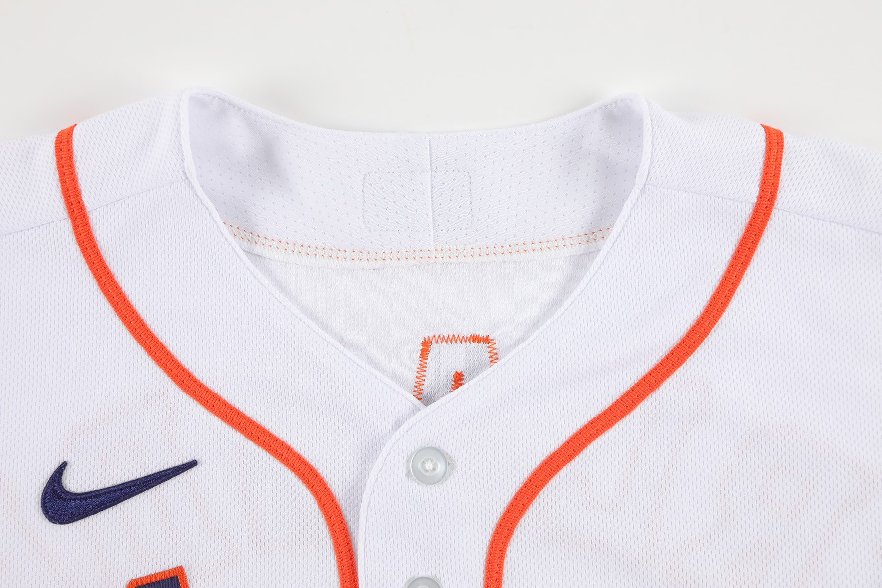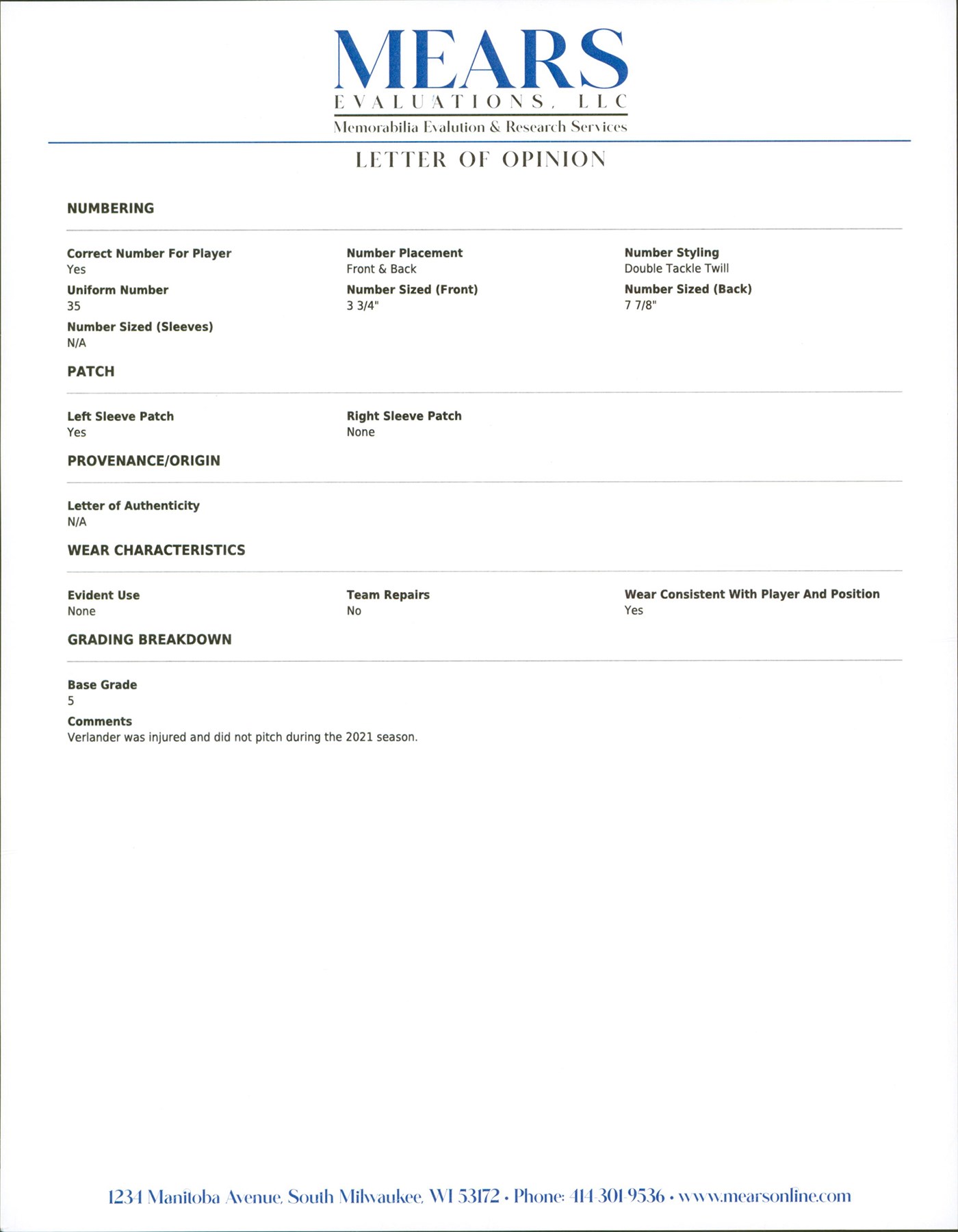 2021 Justin Verlander Houston Astros "Los Astros" alternate team game issued jersey. A patch with the MLB Authentic logo and Nike swoosh logo is sewn to the front left tail of the jersey. Below the tag is a white decal that includes a QR Code. "HUHH", "2021 PROP. OF HOUSTON", and "46 ASTROS" is typed on the tag in black ink. "LOS ASTROS" and "35" are sewn across the front of the jersey. The Nike swoosh logo is also present, just above "LOS". "VERLANDER" and "35" are sewn to the back of the jersey, and the MLB logo is at the back neck area. The Houston Astros logo patch is sewn to the left sleeve. The jersey shows no signs of game use as Verlander was injured and did not pitch during the 2021 season. However, there are some stain marks on the front of the jersey. The jersey has been graded A5 by MEARS, and a full LOA is included.