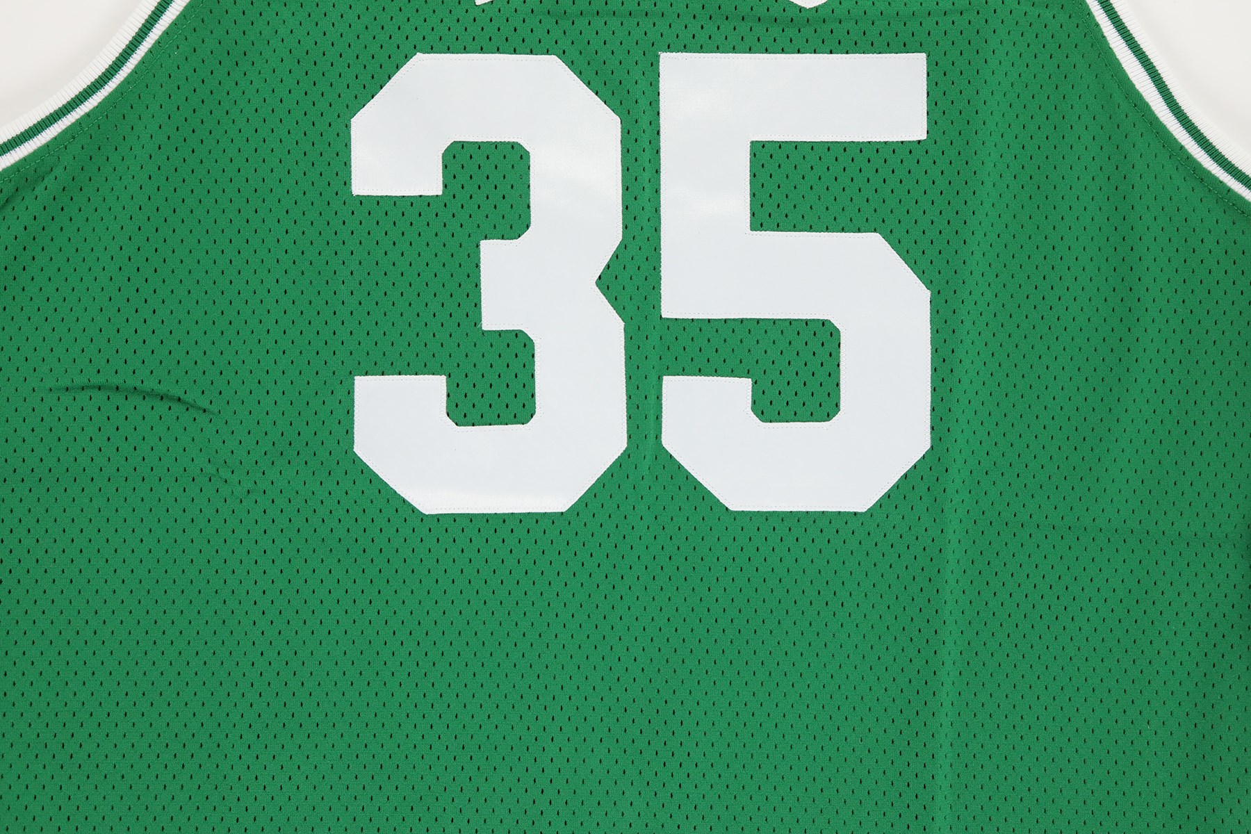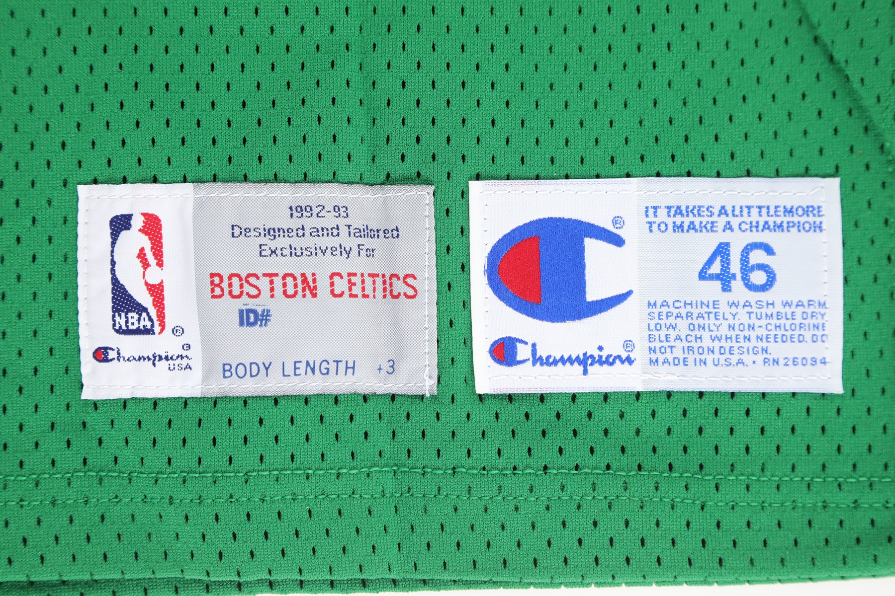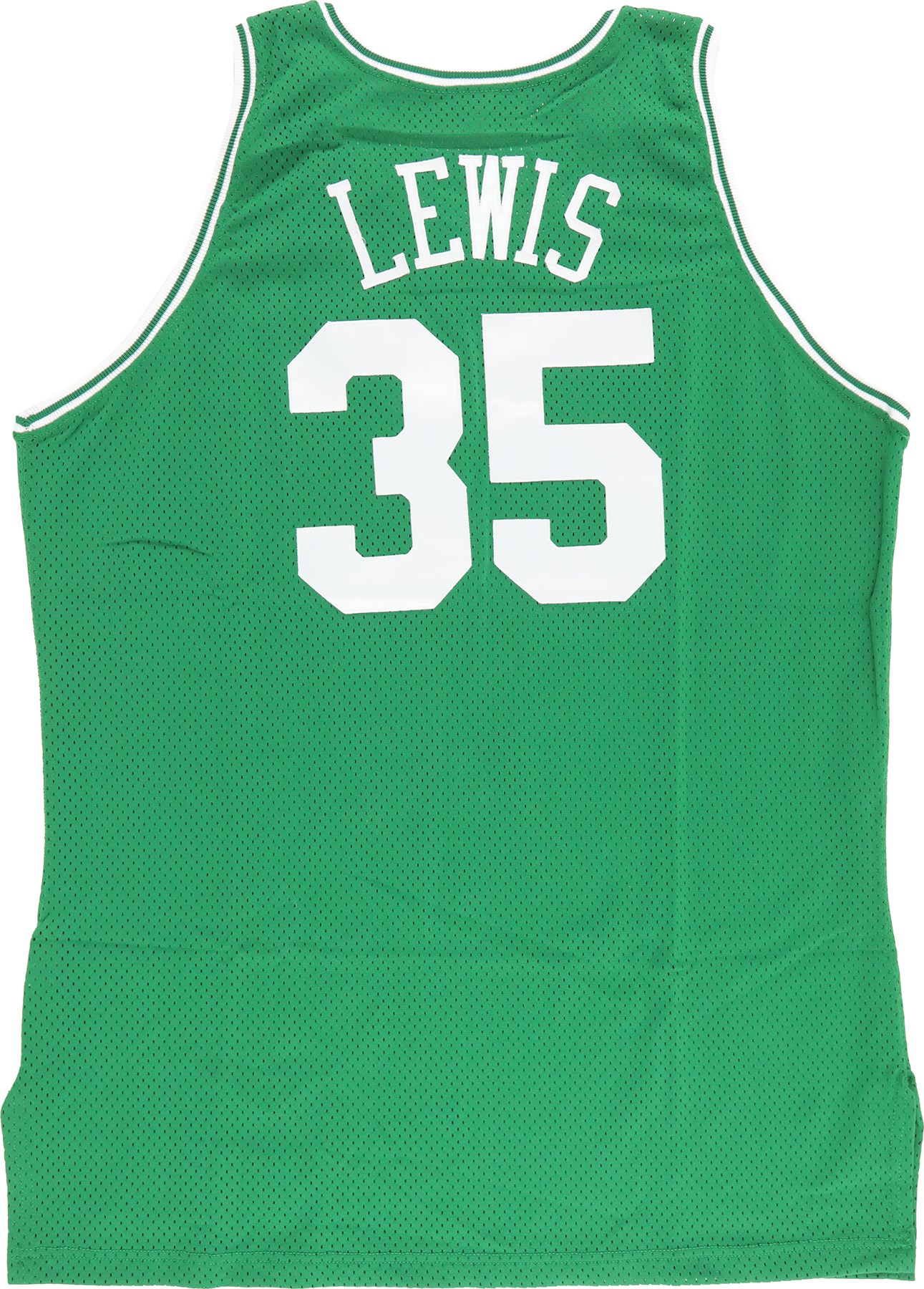 The green mesh jersey is lettered "Celtics" across the front and features the number "35" on the front and reverse. "Lewis" is lettered on the reverse above the number. All letters and numerals are applied in white tackle twill. Located on the front left tail are a "Champion 46" label and a second Champion label reading in part: "1992-93 Designed & Tailored Exclusively for Boston Celtics Body Length +3." The jersey is original as issued and shows no use. Together with a letter of provenance from the consignor.
