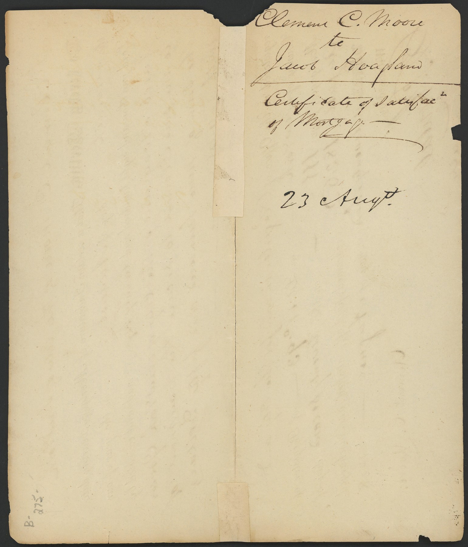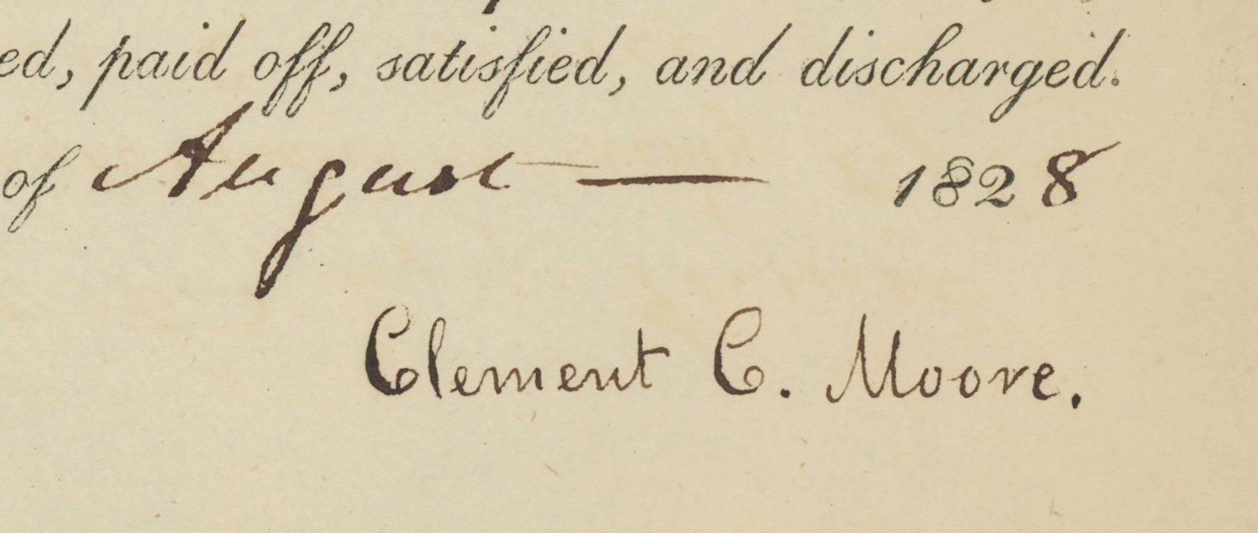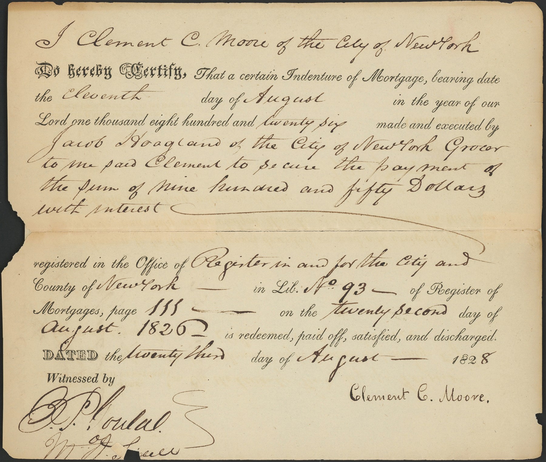 One-page indenture of mortgage document, dated August 23, 1828, signed by Clement C. Moore, American writer and scholar. Today, Moore is best known as the author of the classic Christmas poem A Visit From St. Nicholas, which begins "Twas the Night Before Christmas." The document, which is both preprinted and handwritten (in an unknown hand) certifies that Jacob Hoagland, a New York City grocer, has fully repaid Clement C. Moore for an indenture of Mortgage in the amount of $950. It has been signed by "Clement C. Moore" in black fountain pen (grading 9/10) at the base, along with two witnesses. The document (7.5x6.25") displays toning, a horizontal fold that has been reinforced on the reverse with vintage tape, and several small border tears. Full LOA from PSA.