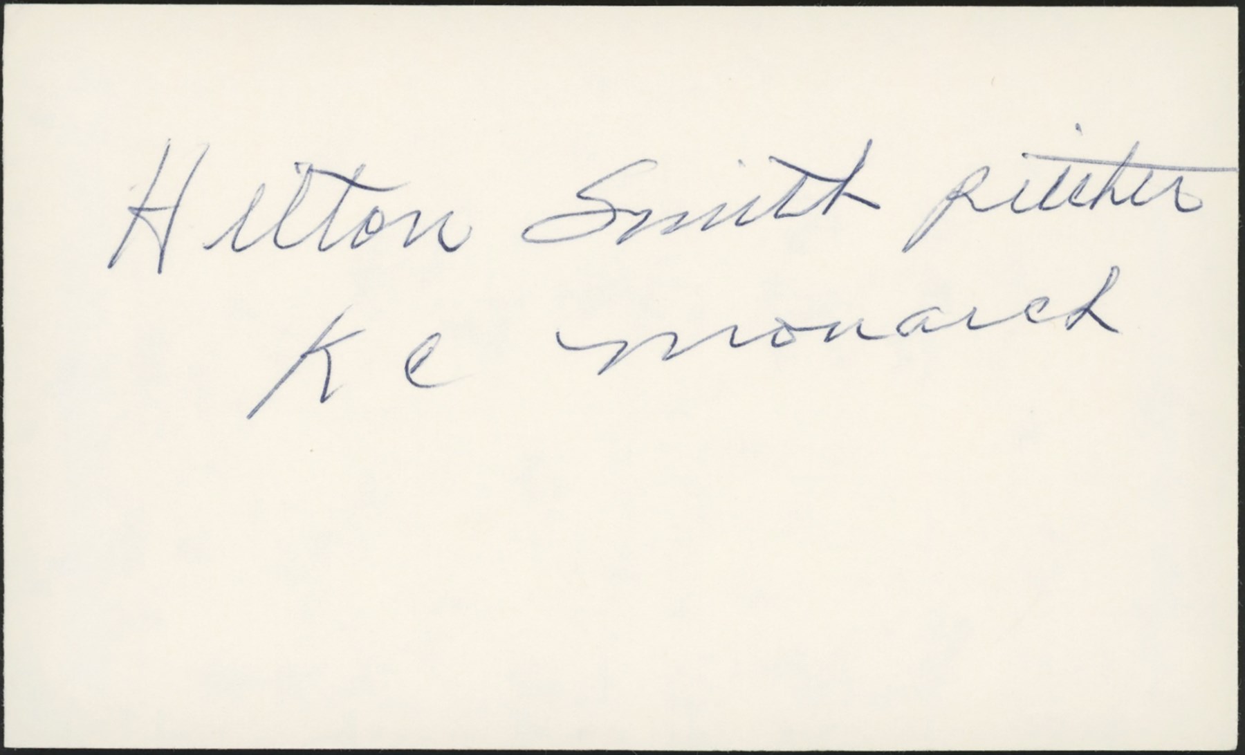 Unlined index card signed by Hall of Fame Negro League pitcher Hilton Smith. Smith has inscribed the card "Hilton Smith pitcher KC Monarchs." Both the inscription and signature have been scripted in blue ink and grade 9/10. Smith's signature is scarce today because he died in 1983 but wasn't elected to the Hall of Fame until 2001. This card was obtained by our consignor's husband personally at a Negro League signing show in the 1970s and has been in the family's possession since that time. The card (5x3") remains in Near Mint condition. Hologram label from PSA affixed to the card.