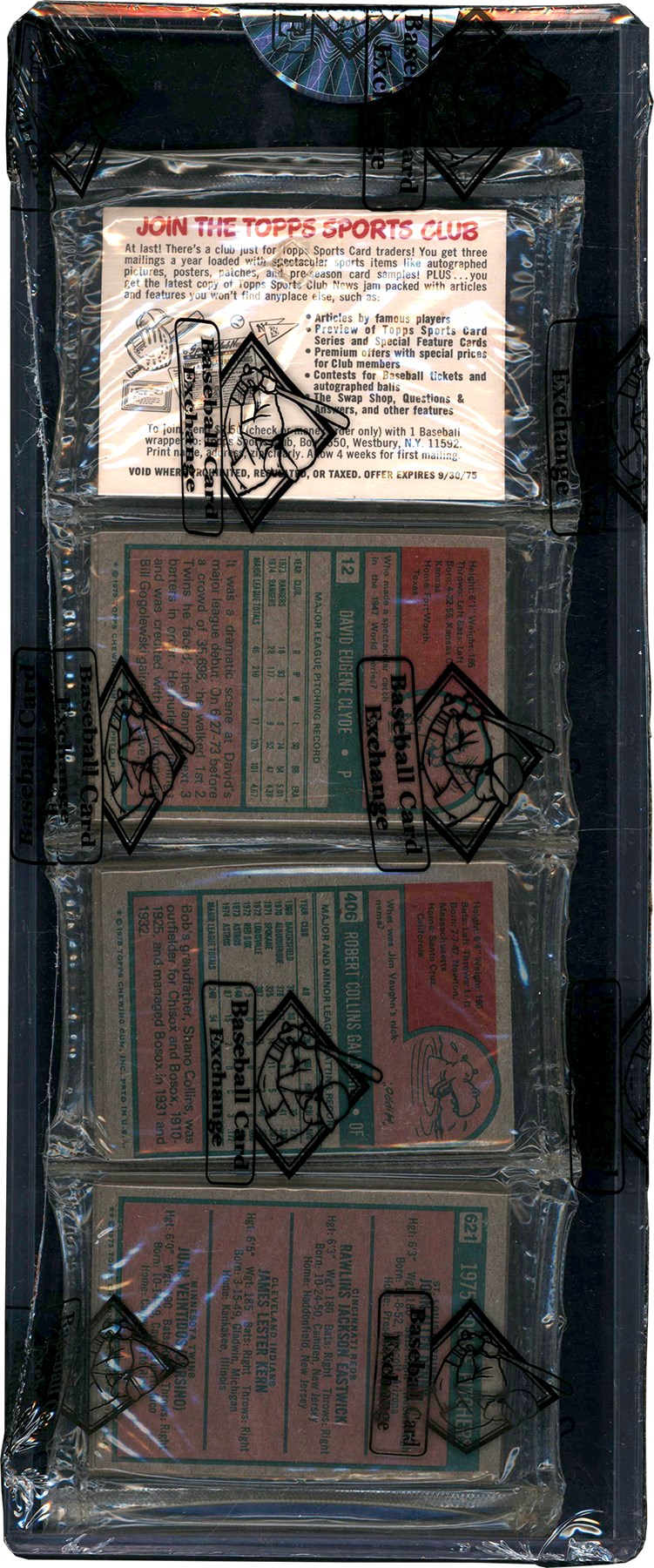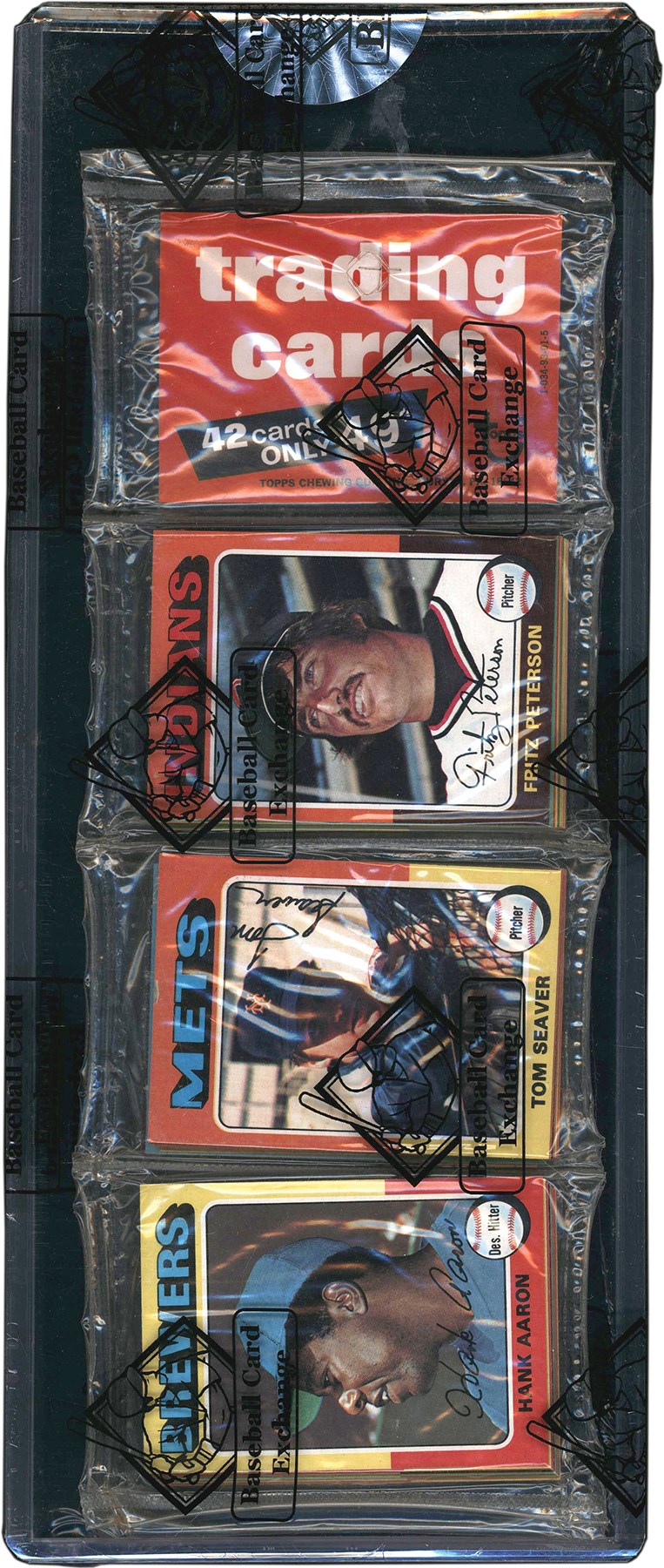 1975 Topps Baseball Unopened Rack Pack.  The rack pack has been authenticated by Baseball Card Exchange and comes with BBCE wrap and BBCE hologram sticker.  The top of the pack has Hank Aaron; Tom Seaver; and Fritz Peterson showing.  The reverse of the pack has 12 David Clyde; 406 Robert Gallagher; and 621 Rookie Pitchers showing.  Cards are assumed to be un NM or better condition.