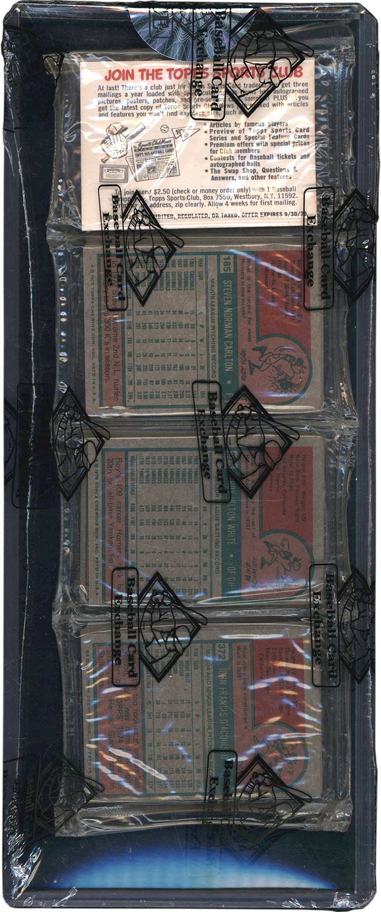 1975 Topps Baseball Unopened Rack Pack.  The rack pack has been authenticated by Baseball Card Exchange and comes sealed in BBCE wrap and BBCE hologram.  The rack pack has Lou Brock Highlight; Rico Petrocelli; and Tony Taylor showing on the top and 185 Steve Carlton; 375 Roy White; and 372 John D'Acquisto on the reverse.  Cards are assumed to be in NM or better condition.