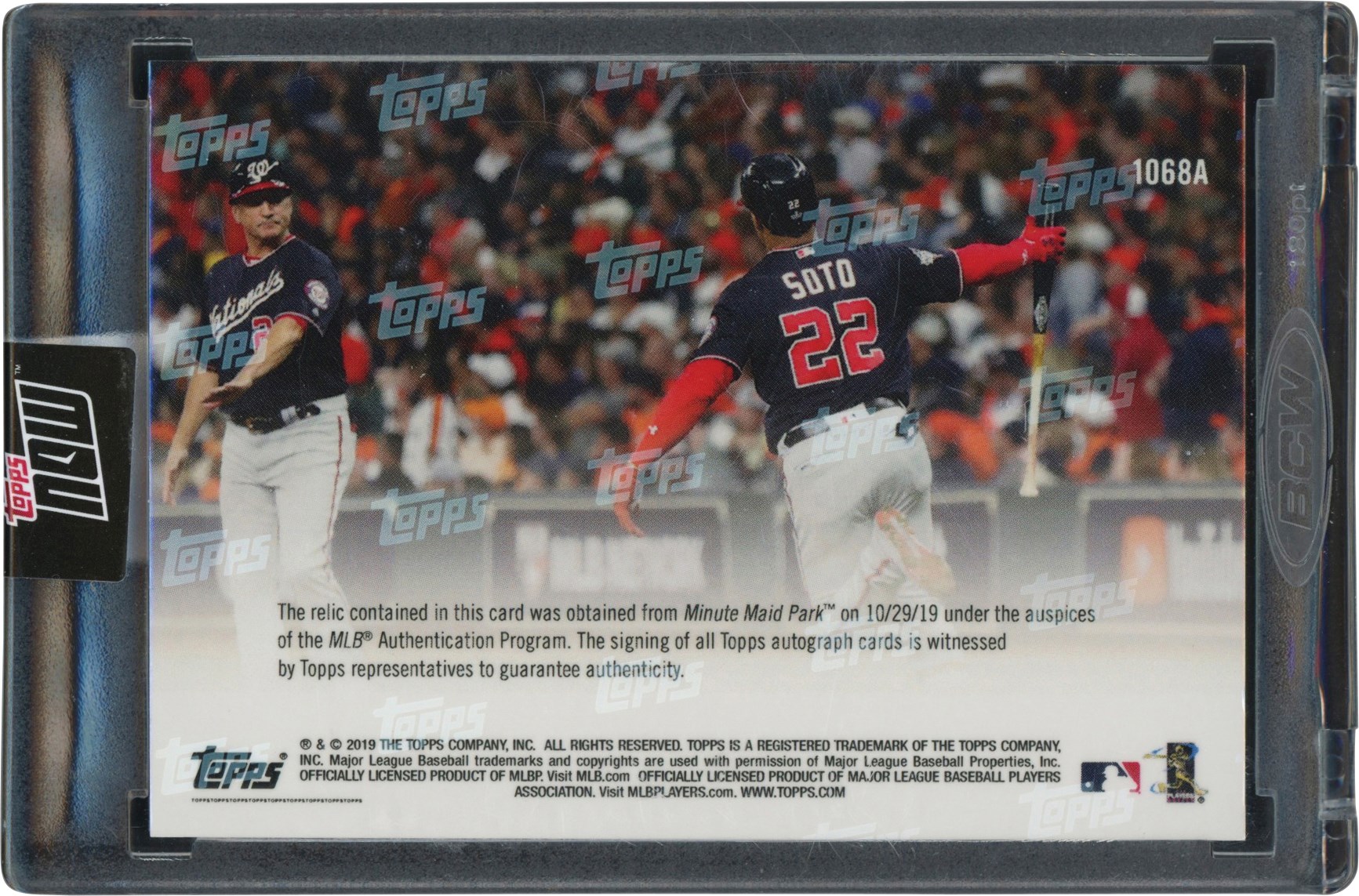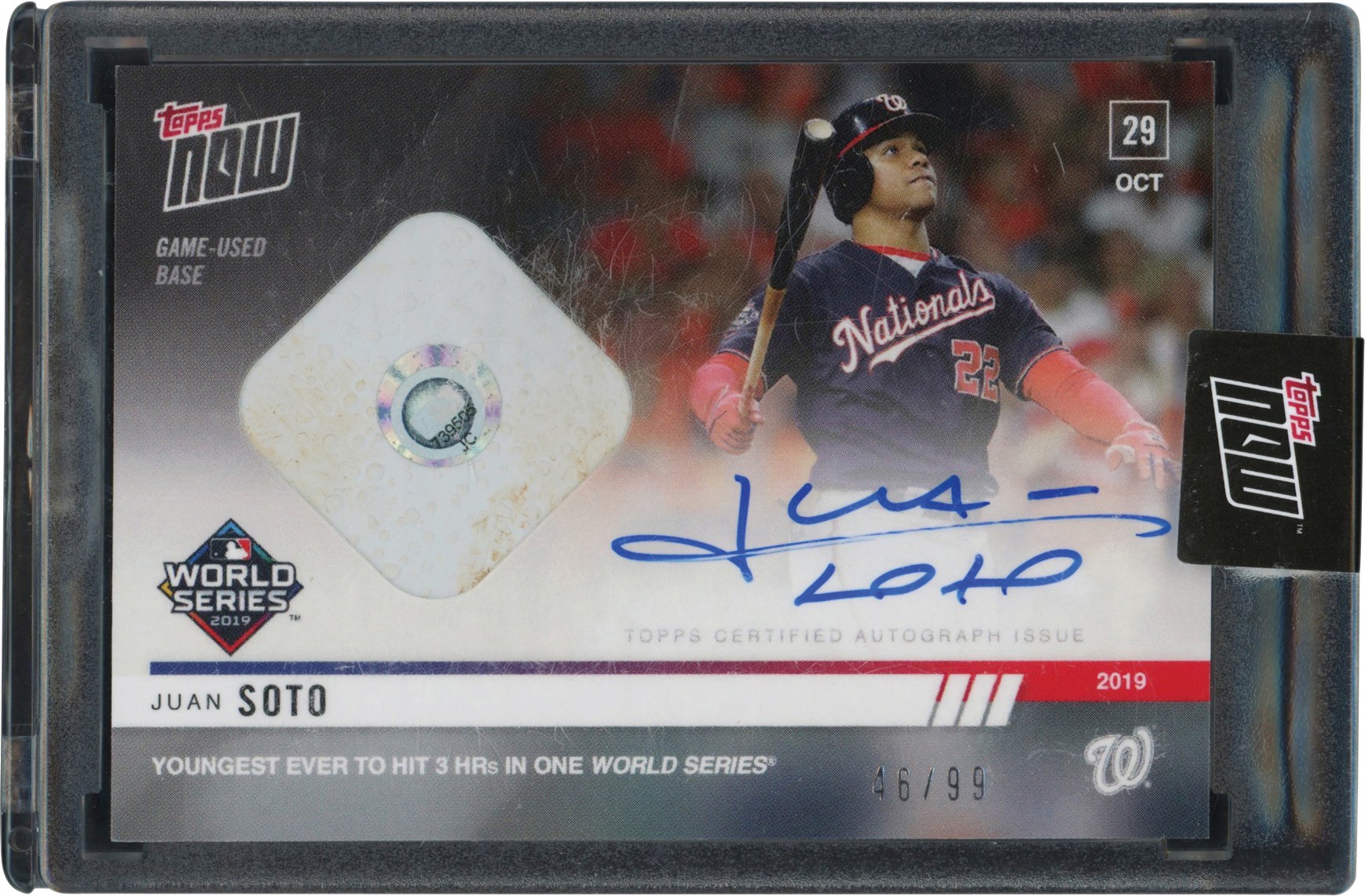 2019 Topps Now Juan Soto #1068A Game Used Autographed Base Card-game featuring Soto becoming youngest ever to hit 3 HR in one World Series. The card is encapsulated by Topps with a Topps Now sticker securing the holder. The card appears to have crisp edges; excellent centering; and four sharp corners. It is #46/99. The autograph was done in blue beneath the image of Soto.