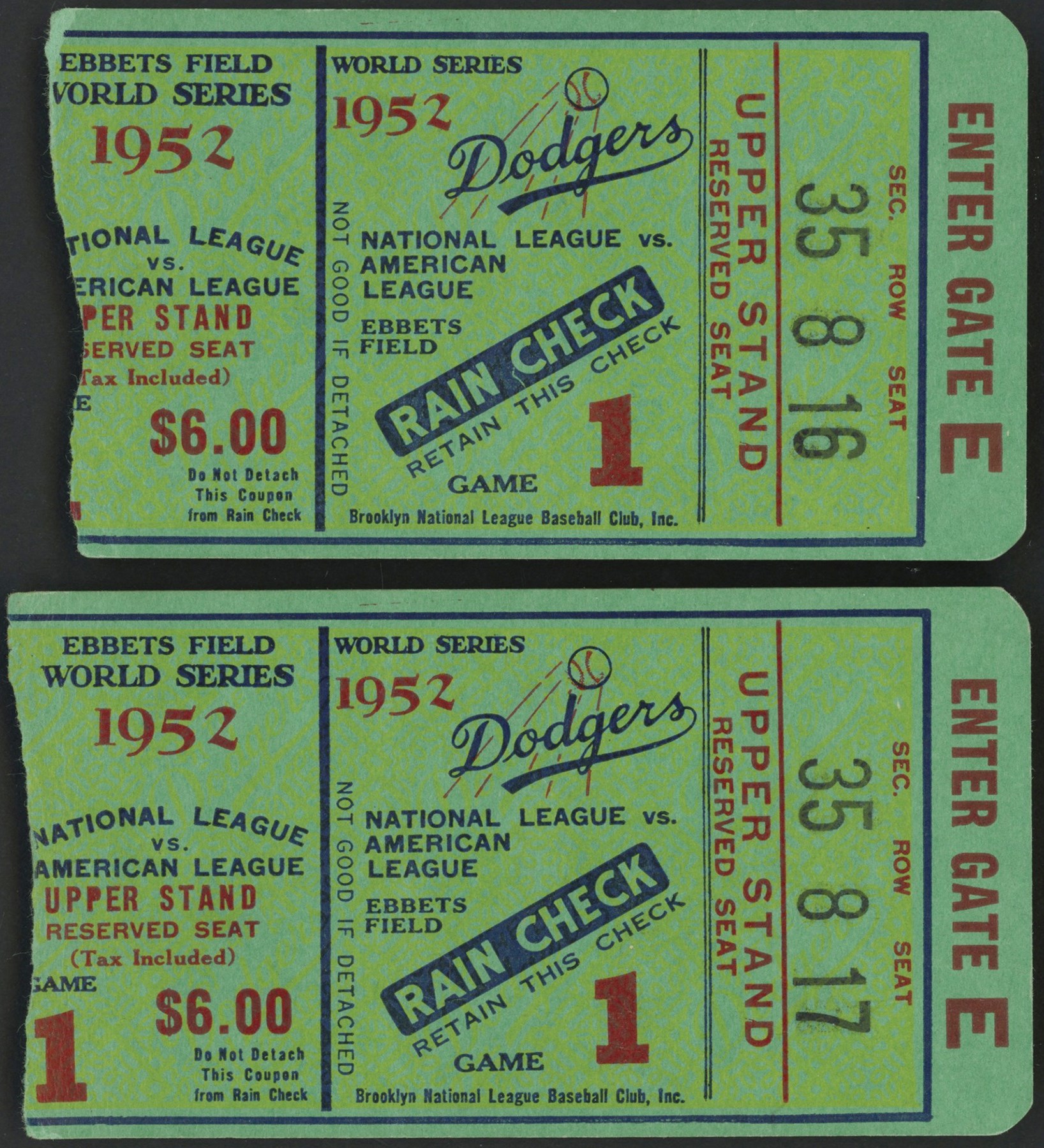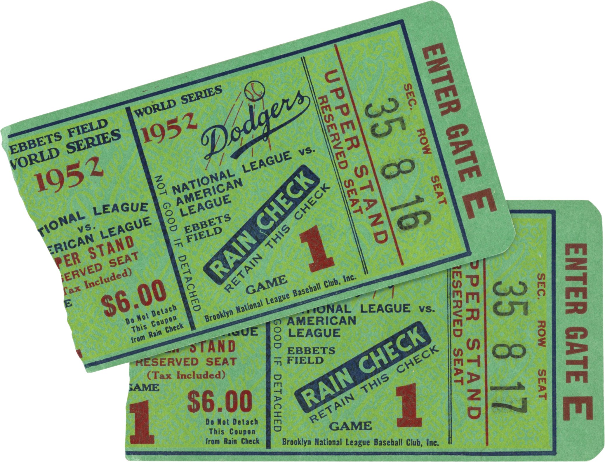 On October 1, 1952, Jackie Robinson hit the first World Series home run of his career. He hit the home run off of New York Yankees pitcher Allie Reynolds, to lead off the second inning of Game 1. Duke Snider and Pee Wee Reese also homered for the Dodgers. The Dodgers defeated the Yankees 4-2, and pitcher Joe Black became the first African-American pitcher to win a World Series game. This pair of tickets is from the historic game. The tickets measure approximately 4.125x2.25" and are in very good condition.