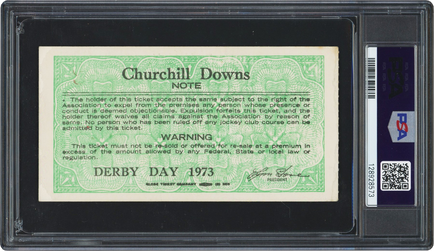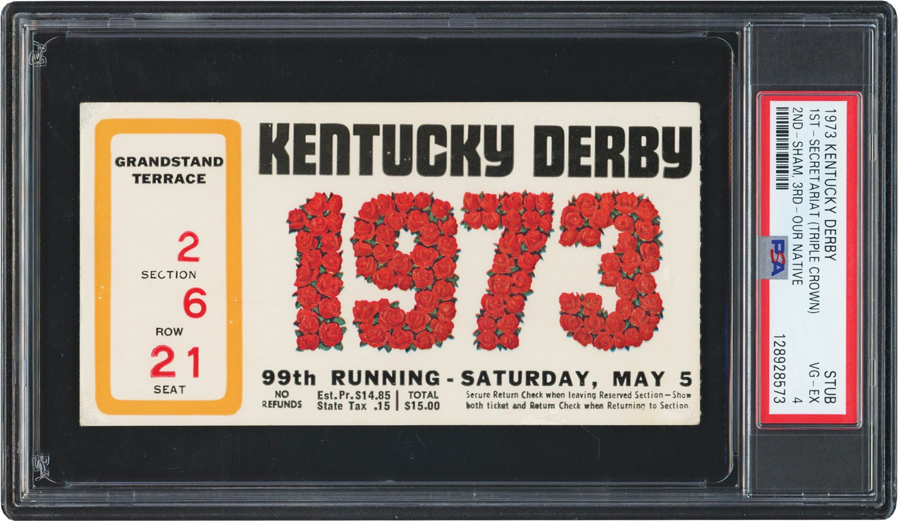 1973 Kentucky Derby Secretariat Triple Crown ticket stub graded PSA VG-EX 4. The ticket presented here is from the 99th running of the Kentucky Derby that took place on May 5, 1973 at Churchill Downs in Louisville, Kentucky. In the race, Secretariat won the Derby in record time (1:59 2/5), and finished ahead of the second place horse, Sham, by 2 and a half lengths. The event was witnessed by a then-record crowd of 134,476. The win earned Secretariat the first jewel of his Triple Crown run. Secretariat would end up winning the Triple Crown in 1973 after winning the Preakness Stakes, and Belmont Stakes.