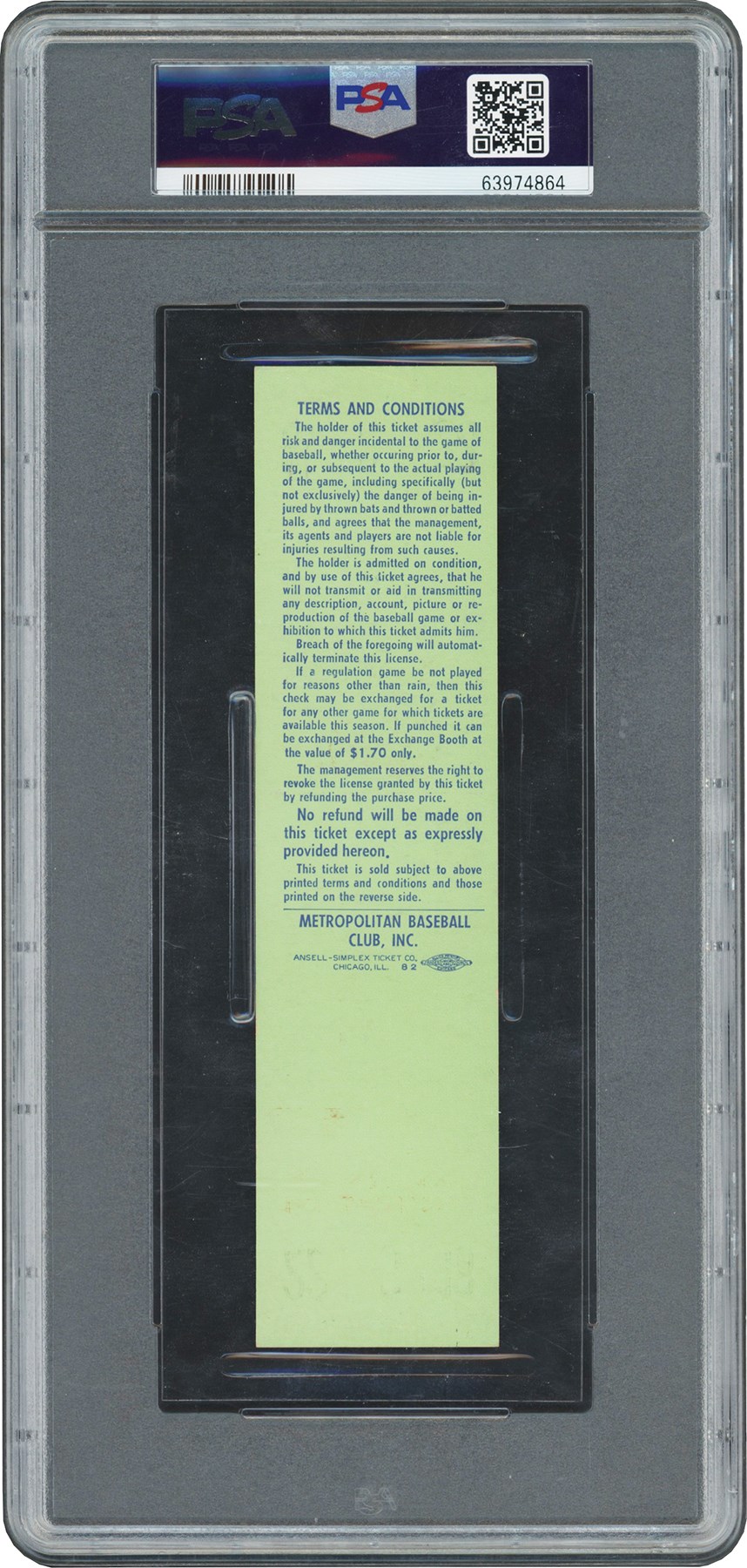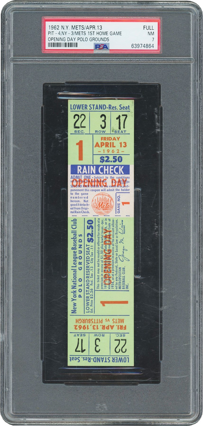 Lot # 667: April 13th, 1962 New York Mets First Game at Polo Grounds (Opening Day) Full Ticket PSA NM 7 (Pop 1 of 3 Highest Graded)