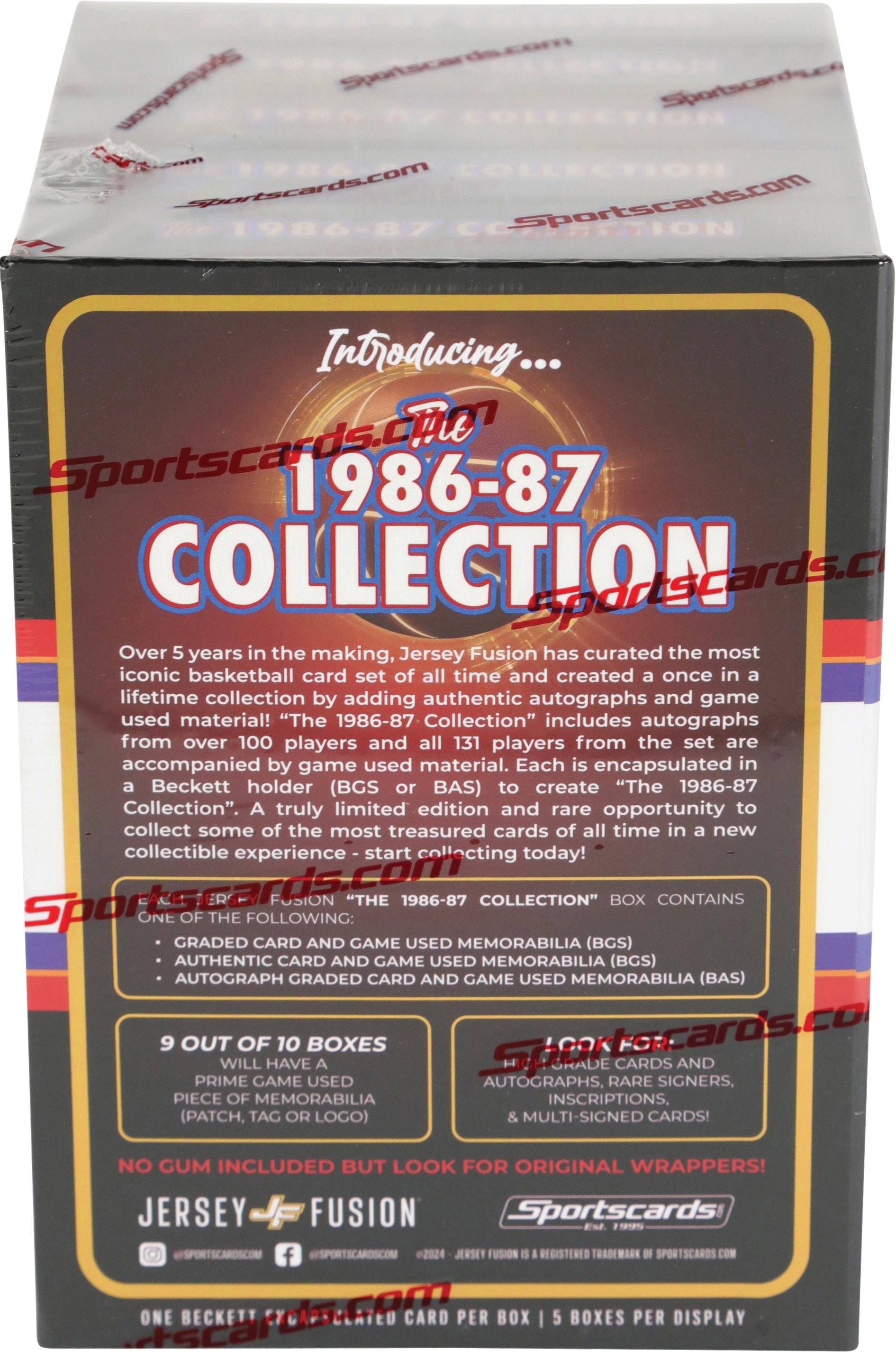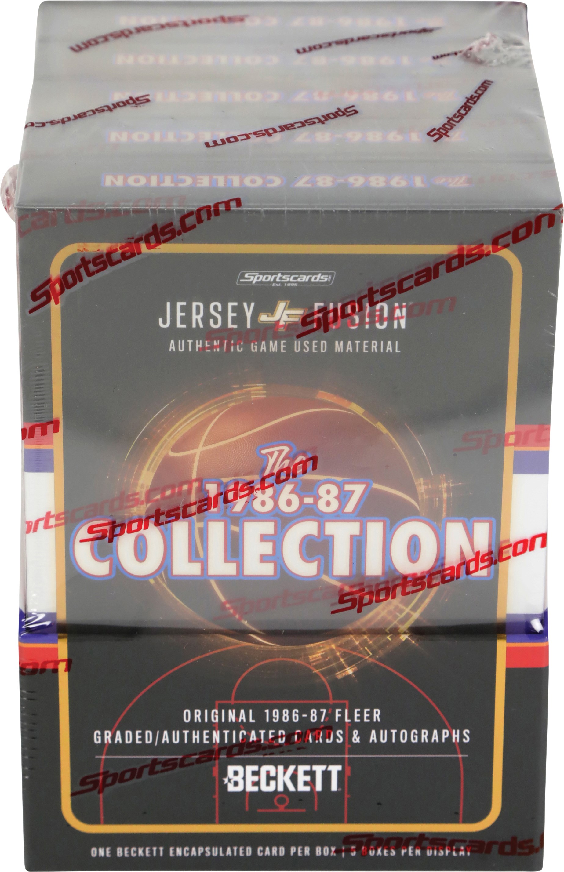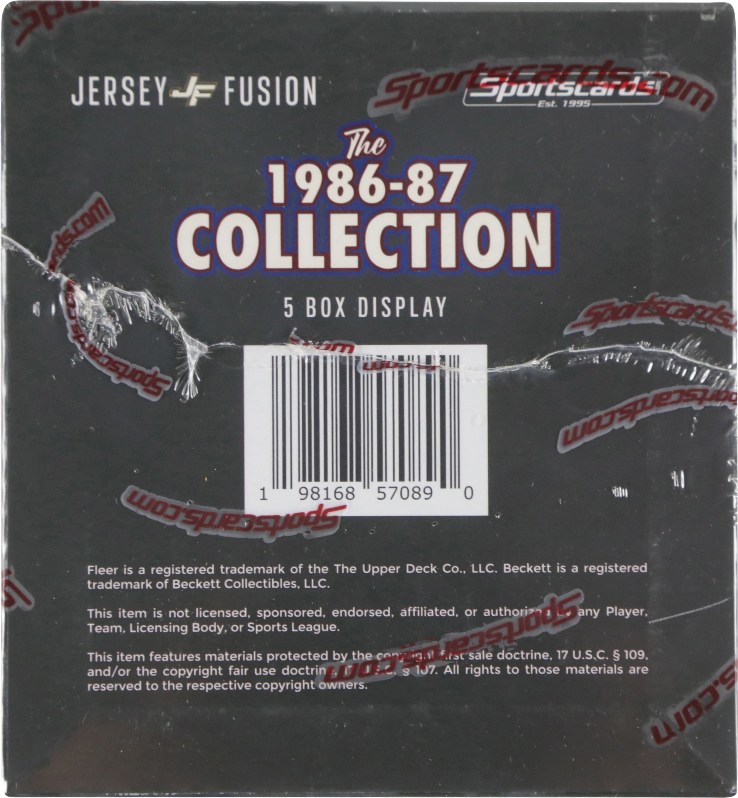 1986-1987 Fleer Jersey Fusion Unopened and Sealed 5 card box. The box is sealed with sportscard.com overwrap. There is a guarantee that the box contains one of a graded card and game used memorabilia-BGS; an authentic card and game used memorabilia-BGS; an autographed graded card and game used memorabilia-BAS. Autographs are possible from over 100 players and all 131 players in the set are possible with game used material. Contents are assumed to be in NM or better condition.