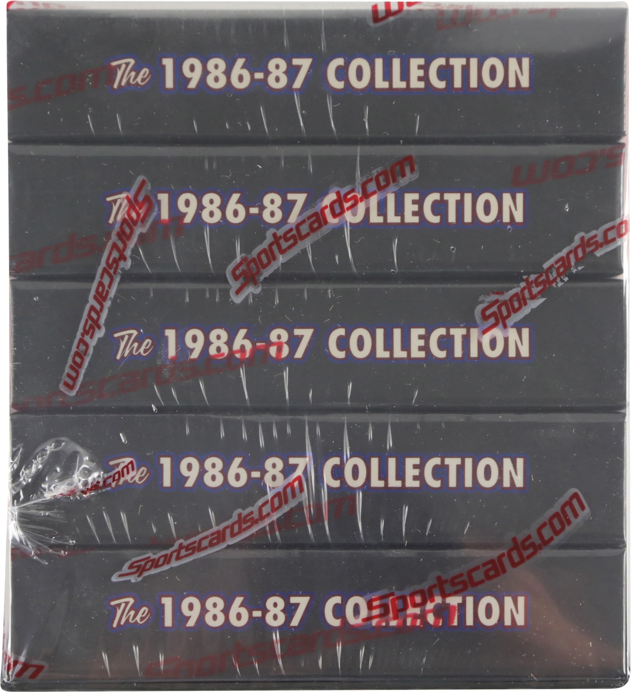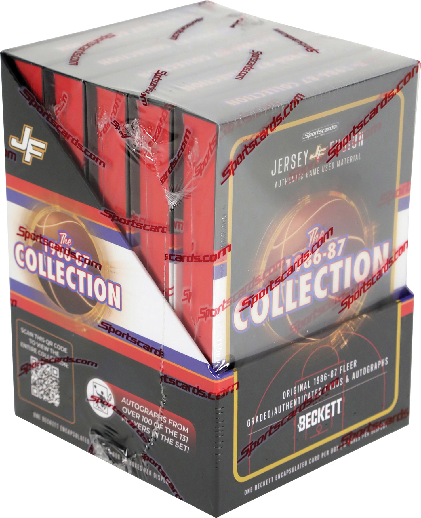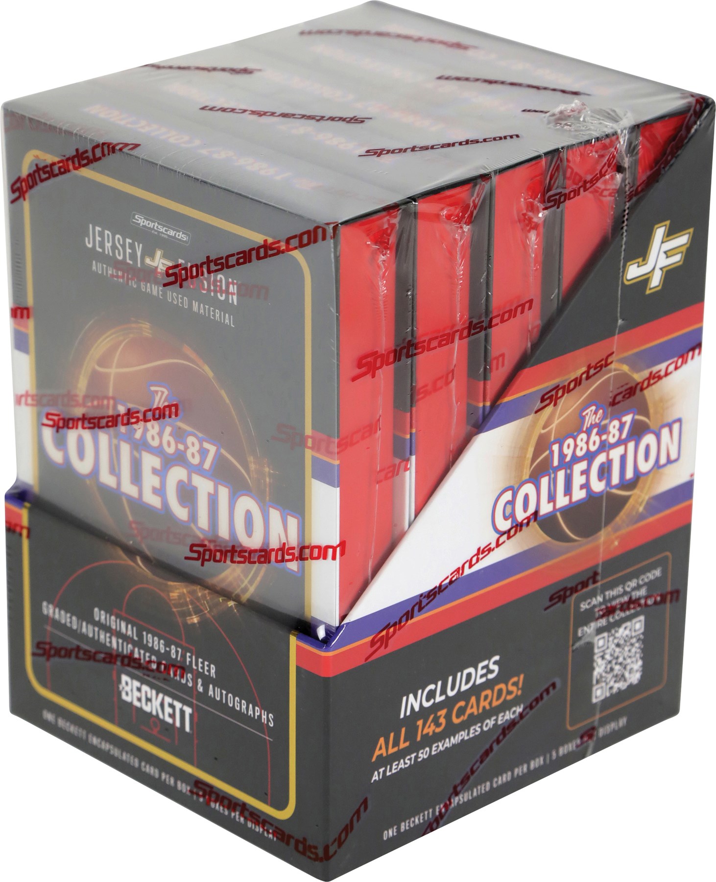 1986-1987 Fleer Jersey Fusion Unopened and Sealed 5 card box. The box is sealed with sportscard.com overwrap. There is a guarantee that the box contains one of a graded card and game used memorabilia-BGS; an authentic card and game used memorabilia-BGS; an autographed graded card and game used memorabilia-BAS. Autographs are possible from over 100 players and all 131 players in the set are possible with game used material. Contents are assumed to be in NM or better condition.