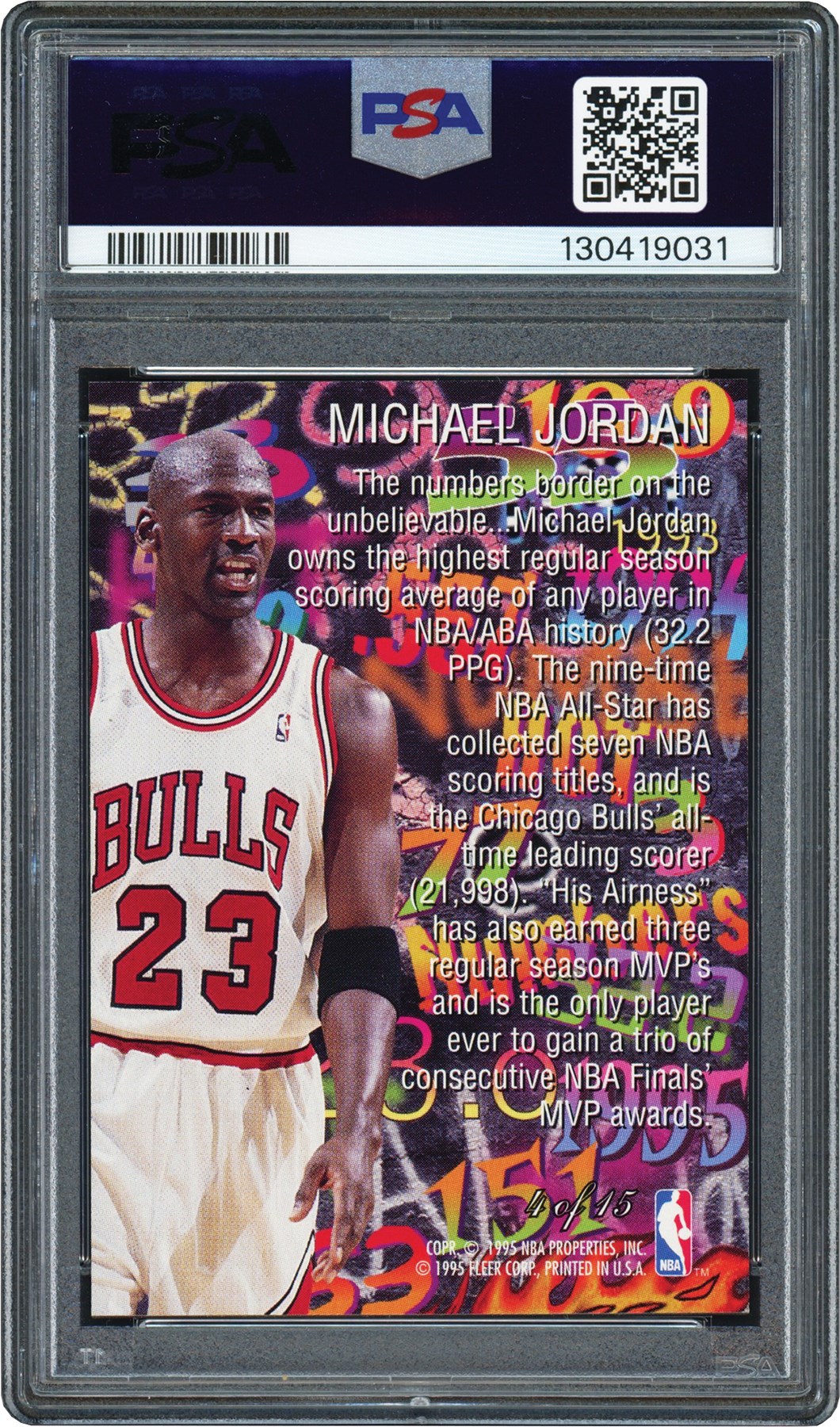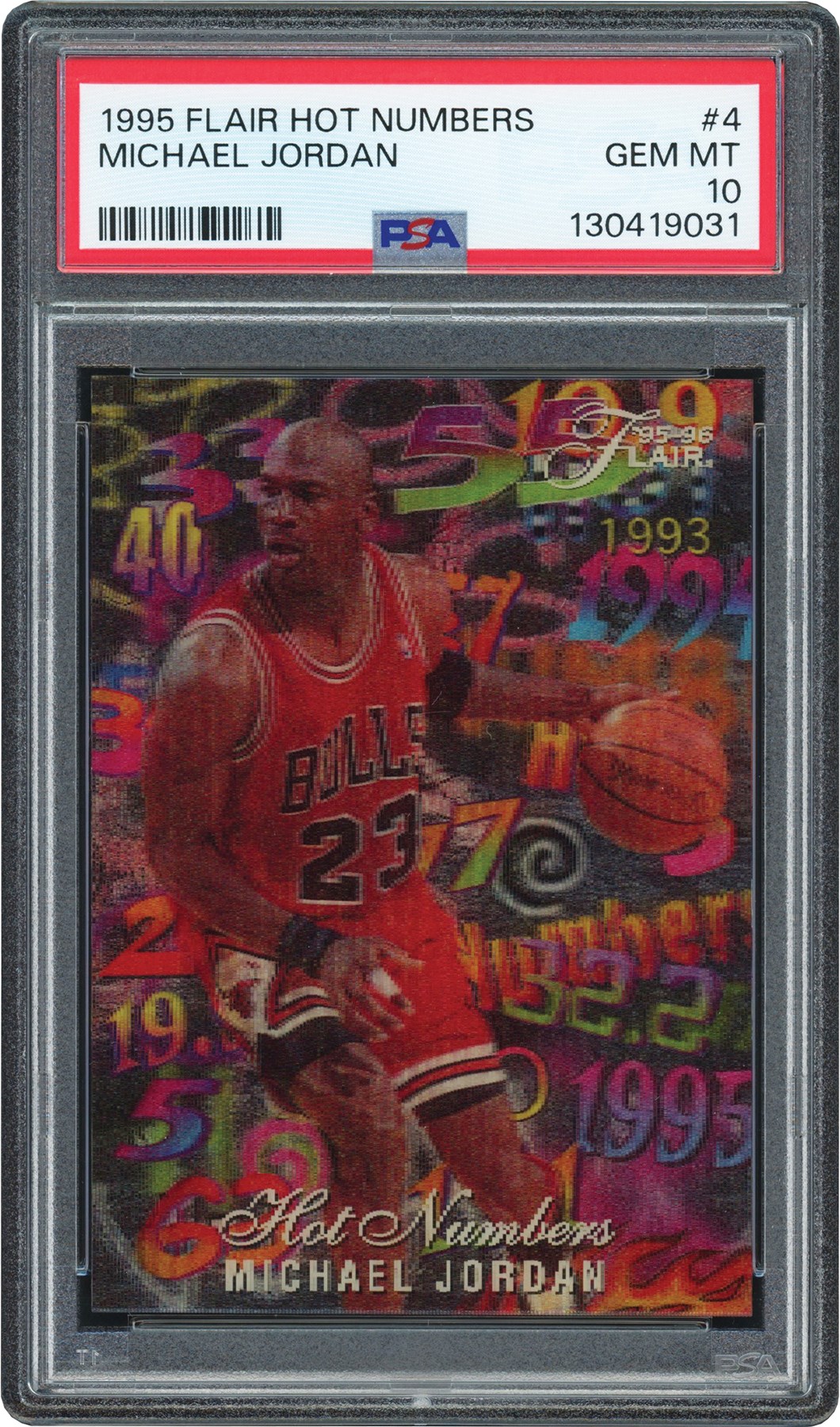 This lot features a 1995 Flair Hot Numbers #4 Michael Jordan card. This card has been graded and encapsulated by PSA GEM MINT 10. All 4 corners are sharp and intact while the centering remains virtually perfect. All of the edges are smooth and the surface is clean with the 3D look free of scratches and marks. The reverse is clean as well. This card is hobby fresh and was submitted to PSA by Leland's in September of 2025.