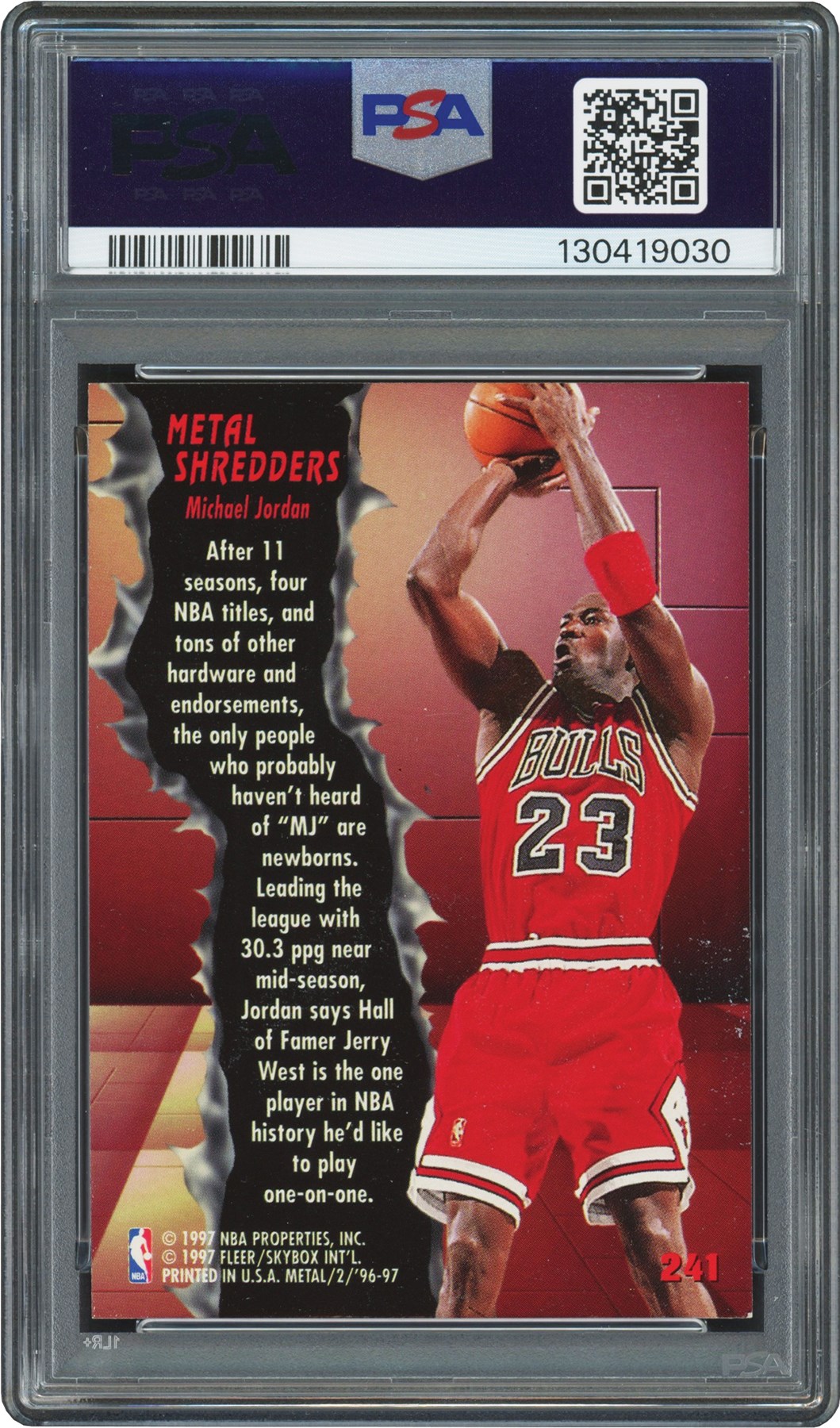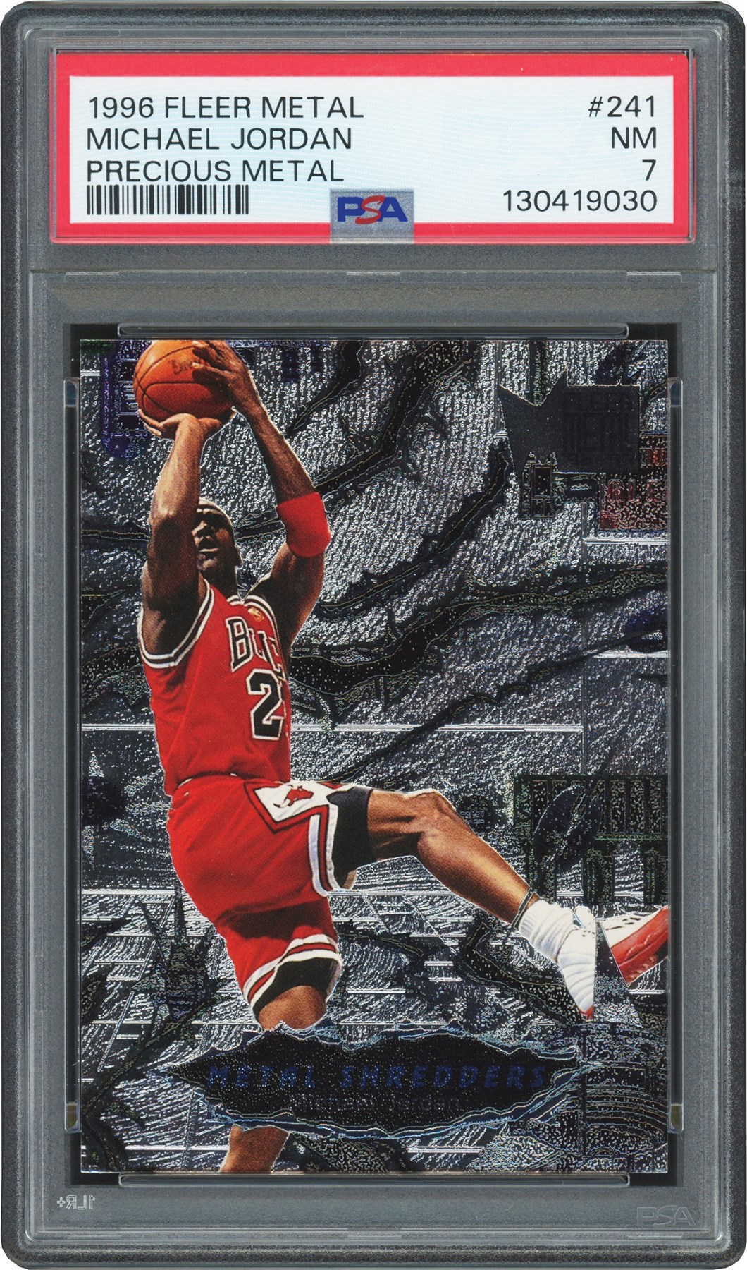 This lot features a 1996 Fleer Metal #241 Michael Jordan Precious Metal card. This card has been graded and encapsulated by PSA NM 7. At first glance, this card looks like a PSA GEM MINT 10, all front 4 corners are sharp and intact while the centering remains virtually perfect. The edges are smooth and the surface is clean. The reverse bottom right corner is dinged and whiting which is likely the lead contributor to the NM 7 grade. This card is hobby fresh and was submitted to PSA by Leland's in September of 2025.