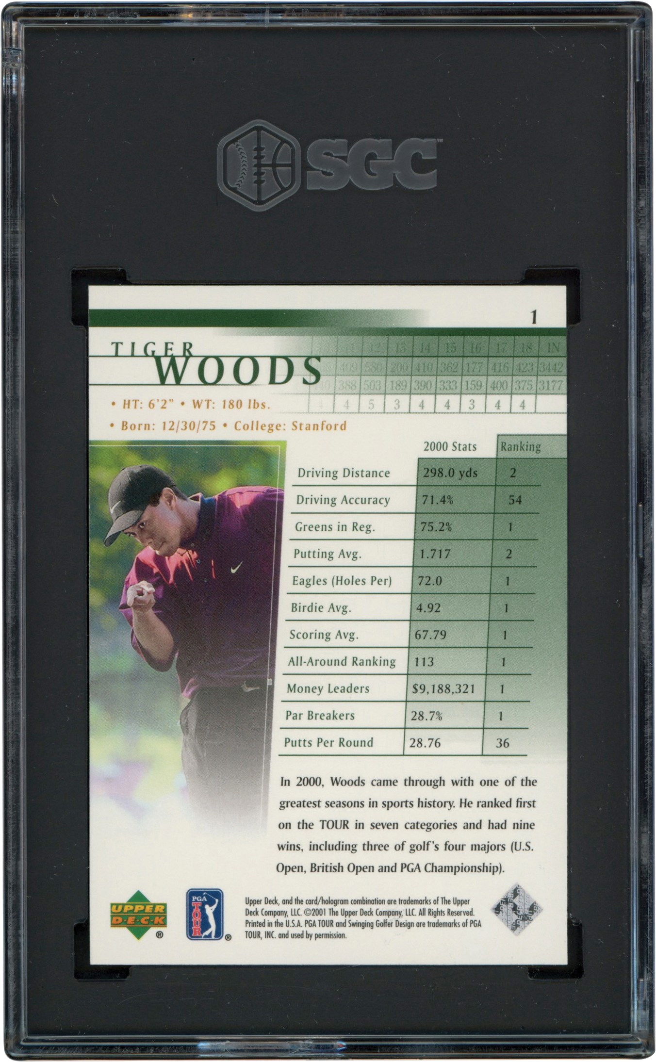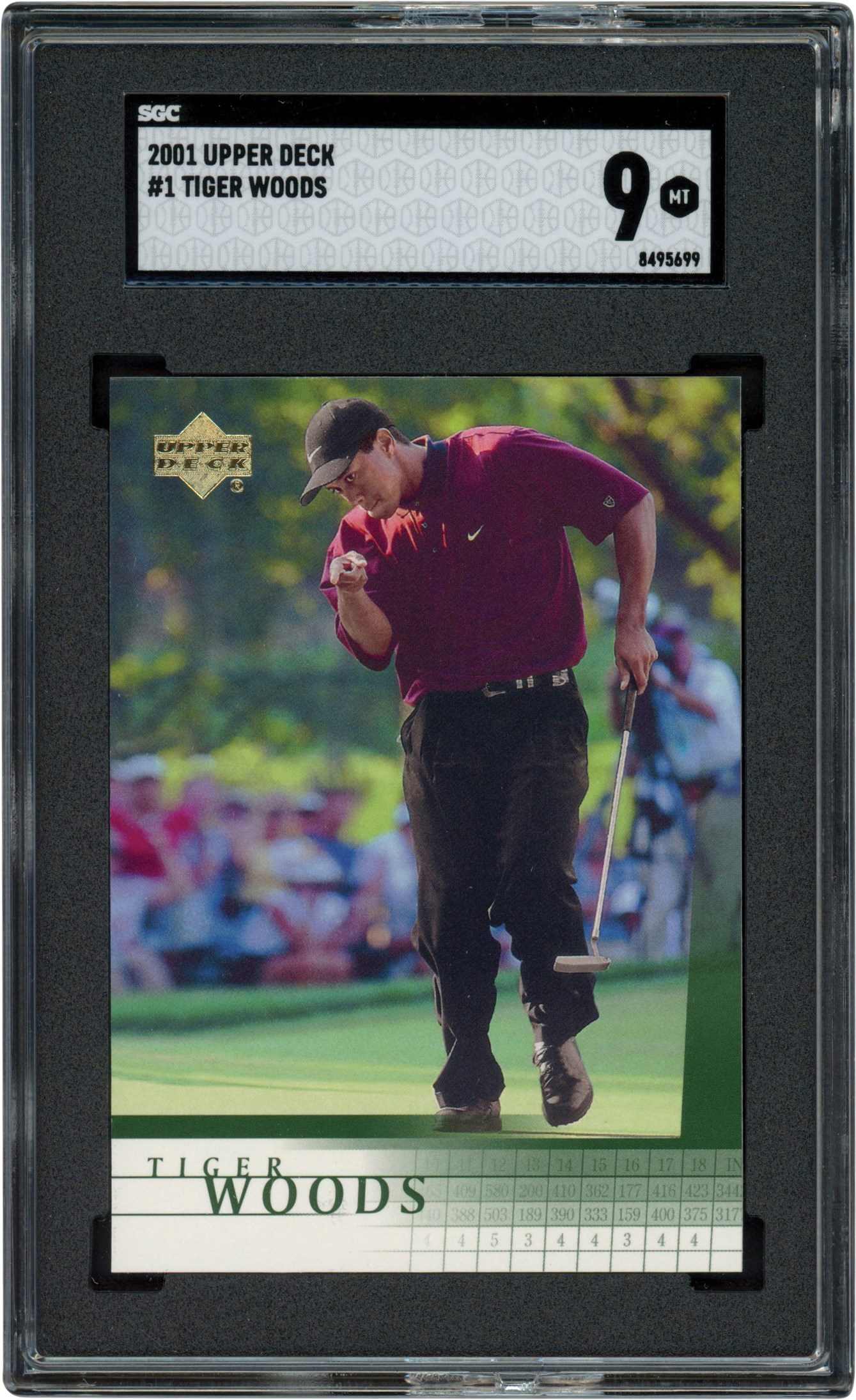 2001 Upper Deck #1 Tiger Woods card. The card has been graded and encapsulated by SGC MT 9. It has crisp edges, near-perfect centering, and four sharp corners. The reverse is bright and clean.