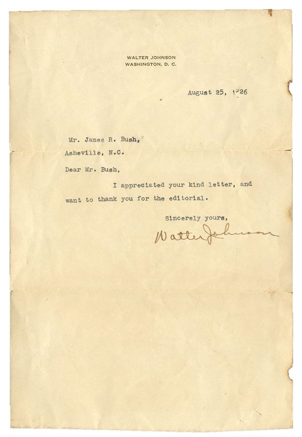 Plain and simple, this letter from legendary hurler Walter Johnson to someone named James R. Bush in Asheville, NC reads: "Dear Mr. Bush, I appreciate your kind letter, and want to thank you for the editorial. Sincerely yours, Walter Johnson." There's a small tear and a couple of burn marks on the letter, which was purchased at an estate sale in Eastman, GA around 10 or so years ago. It was found inside an old University of Georgia yearbook that the consignor did not discover until he got home.