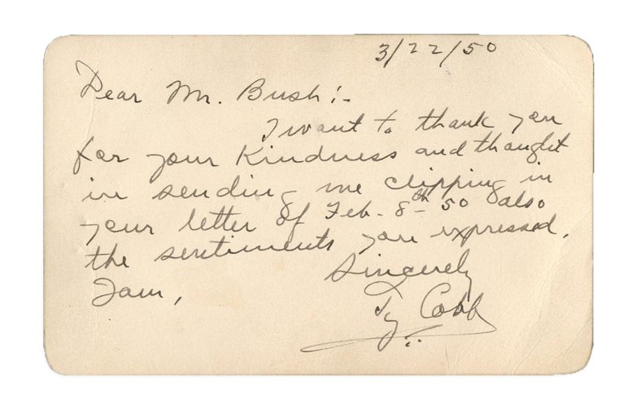 The "Georgia Peach" personally signed this note card comprised of heavy paper of regal quality. It is dated March 22, 1950, and reads: "DEAR MR. BUSH: I WANT TO THANK YOU FOR YOUR KINDNESS AND THOUGHT IN SENDING ME CLIPPINGS IN YOUR LETTER of FEB. 8th '50 ALSO THE SENTIMENTS YOU EXPRESSED. I AM SINCERELY TY COBB." The card was purchased at an estate sale in Eastman, GA around 10 or so years ago.
