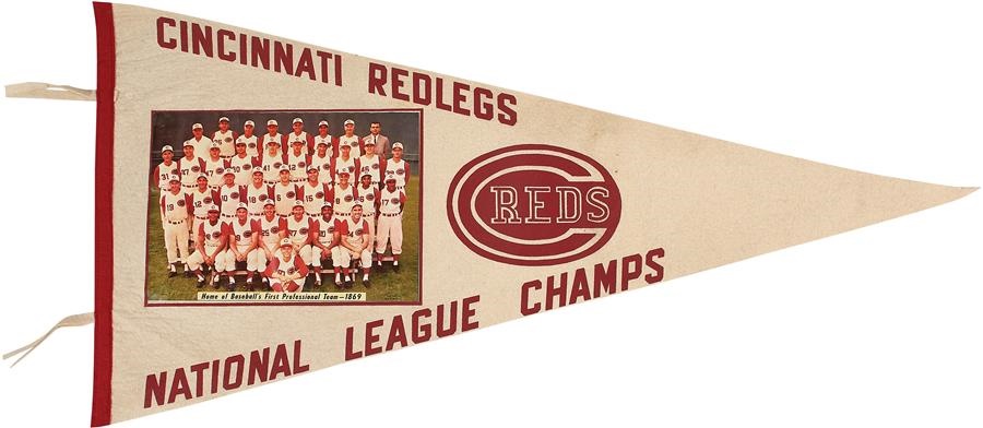 This unusual item is rougly double the normal pennant size and includes a color photo of the 1961 Cincinnati Reds, and boasts the squad as "National League Champions." Likely sold at the World Series, it is in beautiful EX-MT condition.