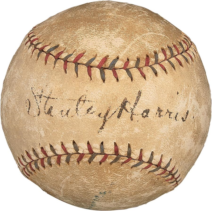 Bucky Harris won World Series as a player and manager over his five decades in the game, and this very special ball was signed during his days as a second baseman, most likely with the Senators in the 1920s. Harris singles are very tough to come by, so to find one from his playing days is a virtual miracle. This official American League (Johnson) baseball with 1909 patent date shows some use and toning and is technically Very Good. The signature "Stanley Harris" on the sweet spot is in 7/10 black fountain ink. Overall, this ball has a spectacular appearance. Due to his long career as a player, manager and executive, Harris was voted into the Hall of Fame by the Veterans Committee in 1975.