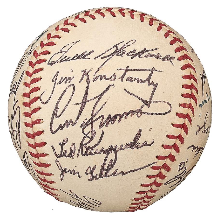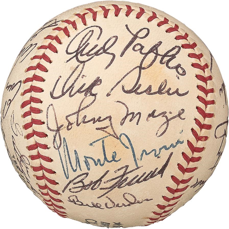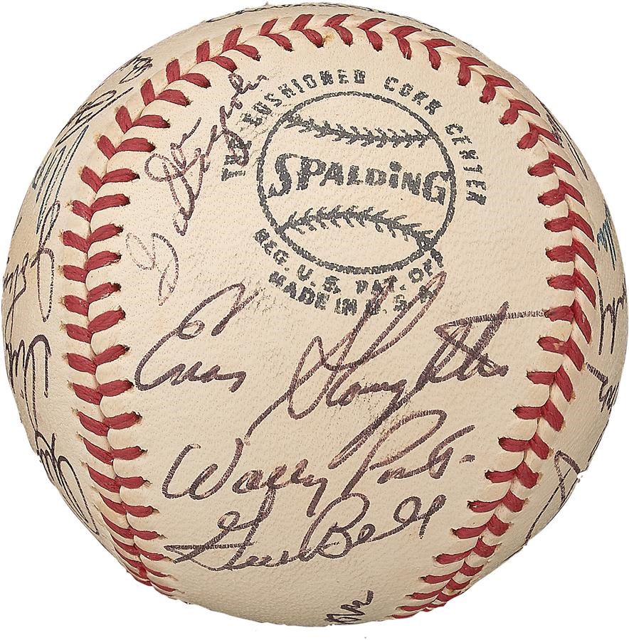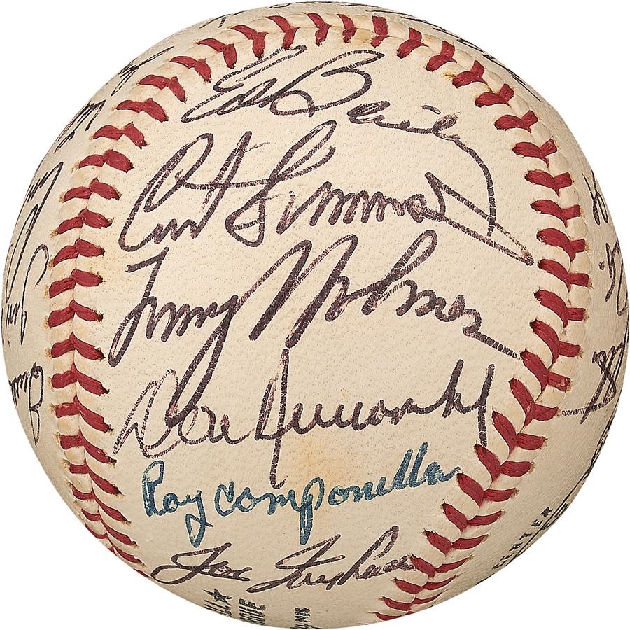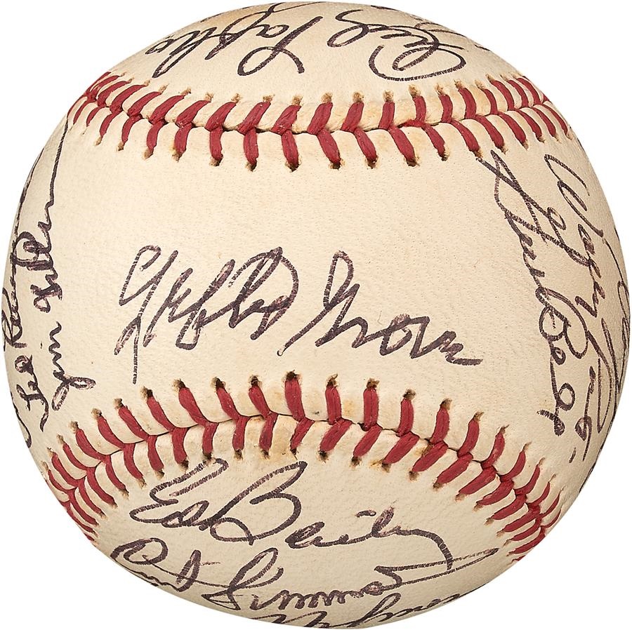 No fewer than 22 greats signed this official National League (Feeney) baseball after their playing days were long over. The standout signature is a beautiful "Lefty Grove" alone on the sweet spot, and he is joined on the cowhide with contemporaries such as Blackwell, Kluszewski, Gilliam, Bell, Slaughter, Post, Mize, Irwin and more. The signatures average 8/10 and the ball is in NRMT condition. The autographs were obtained during the mid-1970s, and the Campanella is a clubhouse version.