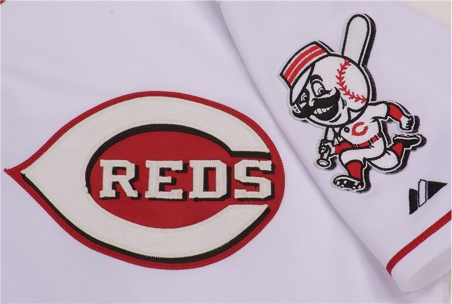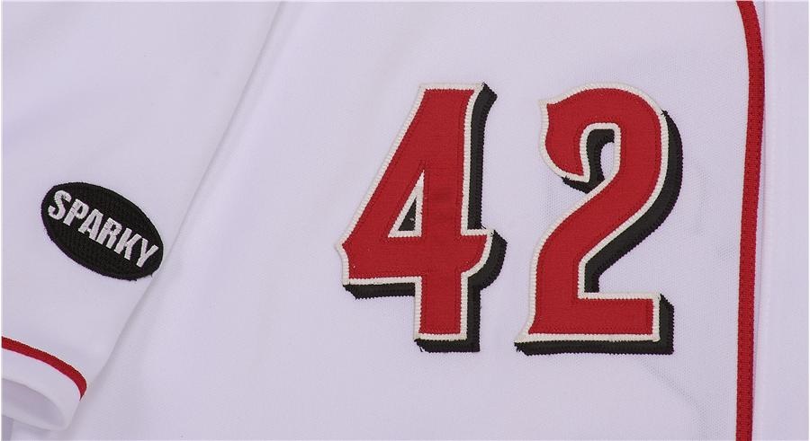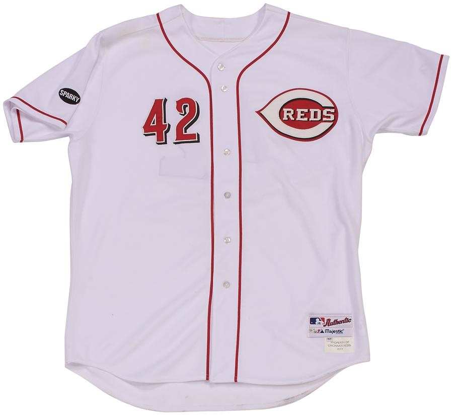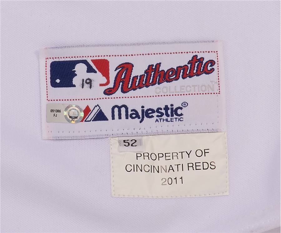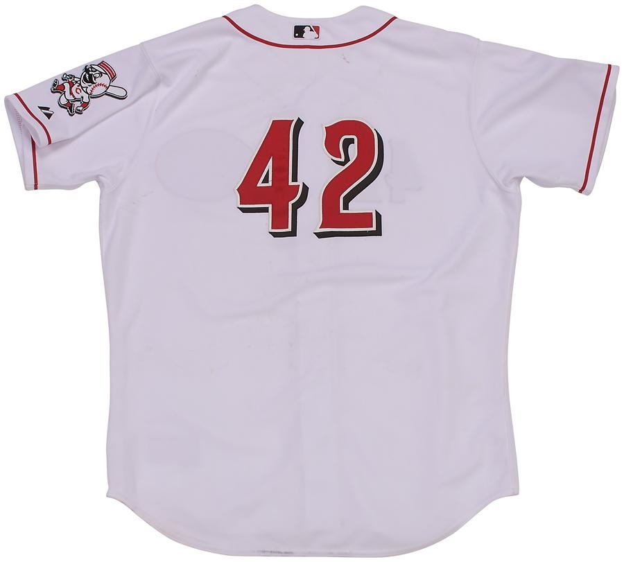 Once a year on April 15th, every player in the MLB wears the #42 to honor Jackie Robinson. This Cincinnati Reds home white jersey was worn by Joey Votto on April 15, 2011 when the Reds faced the Pirates on Jackie Robinson Day. The Majestic tagging on the bottom front of the jersey shows size 52 along with an additional "Property of the Cincinnati Reds 2011" below it. There is also a hologram from the MLB affixed to the Majestic tag that reads "FJ 051386". On the right sleeve, there is a black "Sparky" patch and the left sleeve features the Mr. Red logo patch. Jersey shows solid use.