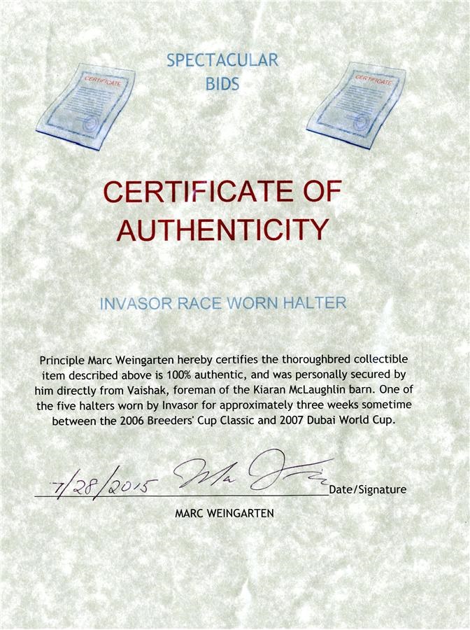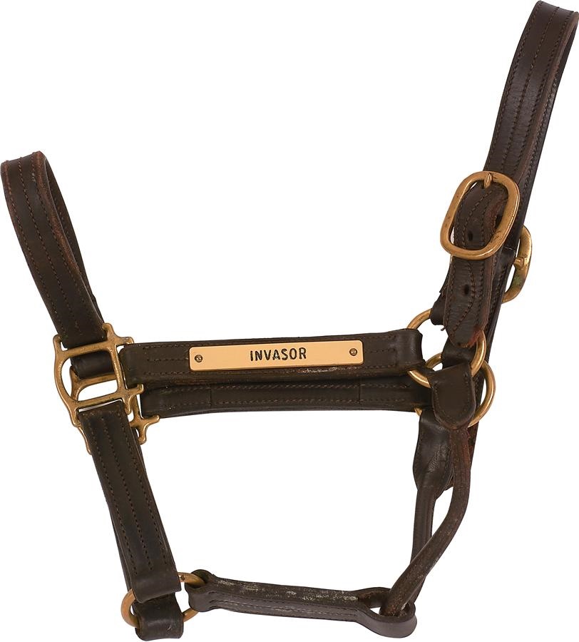 While stallion halters are plentiful, race halters worn by a horse during his racing career are very difficult to obtain. Especially one worn by a horse as special as Invasor. He won 11 of his 12 starts, was racing's 2006 Horse-of-the-Year, won the Breeders' Cup Classic and the Dubai World Cup, and was a first ballot Hall of Fame inductee in 2013. This is one of five halters worn by Invasor during his racing career. He wore this for approximately two weeks between his 2006 win in the Breeders' Cup Classic and 2007 win in the Dubai World Cup. Acquired directly from the barn's longtime foreman, Vaishak.