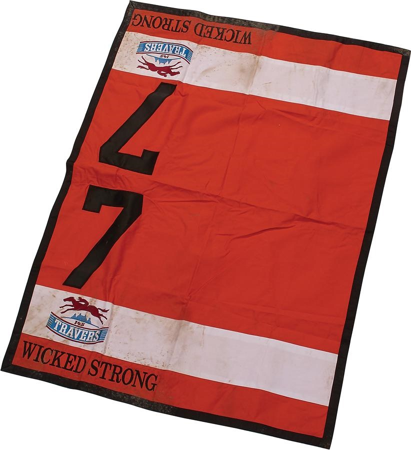Wicked Strong is one of the most popular horses in training and was last year's sentimental favorite to win the Kentucky Derby. Carrying the emotional heartstrings of a nation mourning the Boston Marathon tragedy, the brilliant son of Hard Spun came in fourth in the 2014 Derby, set up by a stirring victory in the Grade 1 Wood Memorial. Second in this, the defining Travers, this cloth is the perfect example of a signature piece around which a collection can be built: A race worn saddle cloth filled with the dirt and remnants of the race, worn by a wildly popular horse in one of horse racing's most cherished and revered races.
