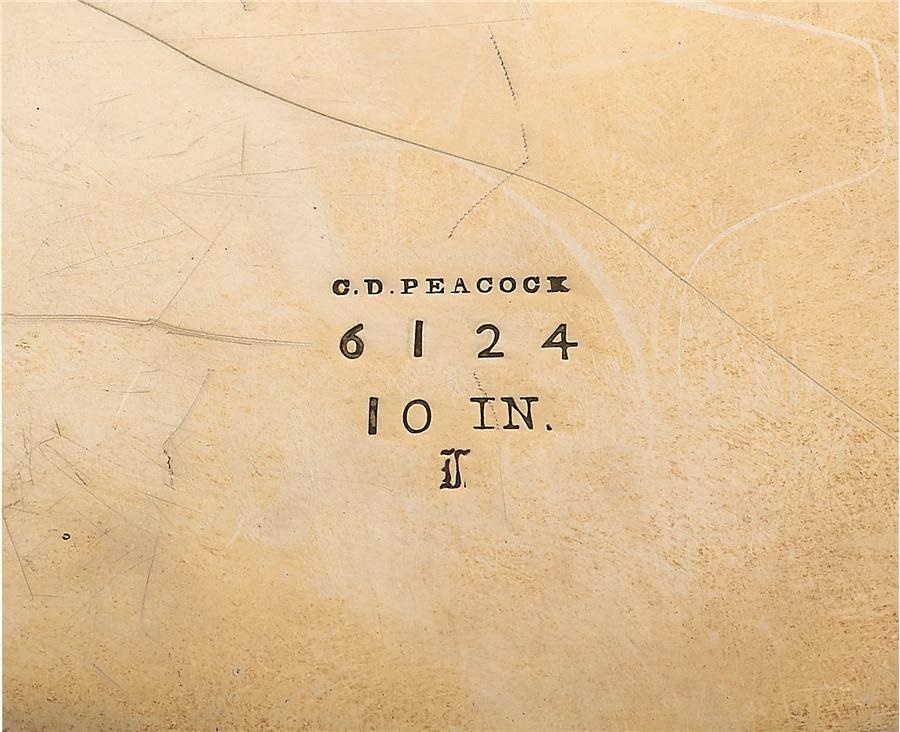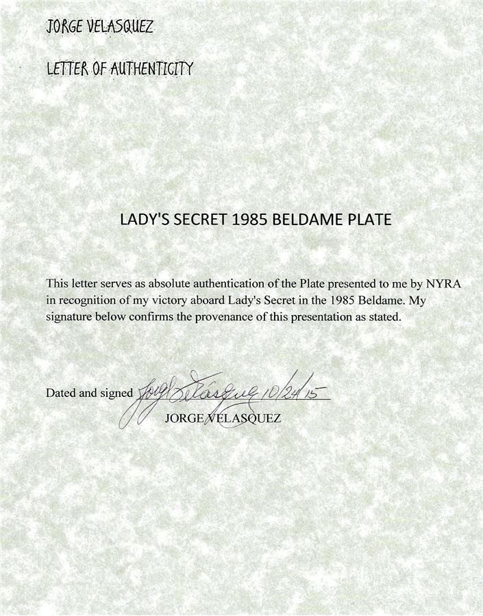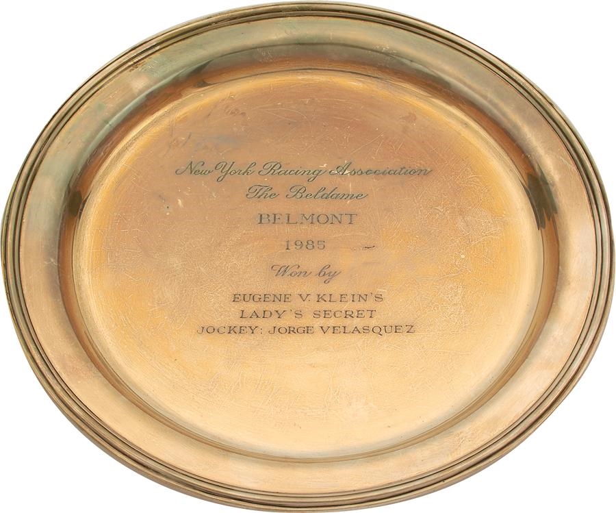 They called her the Iron Lady in 1985, when Lady's Secret ran a mind-boggling 17 races that year. She reeled off eight consecutive wins, the last coming in the Grade 1 Beldame, one of racing's most important and defining races for fillies and mares in the Sport of Kings. A token of victory from that triumph, this sterling silver plate measures 10" in diameter and is engraved, "New York Racing Association The Beldame Belmont 1985 Won By Eugene V. Klen's Lady's Secret Jockey Jorge Velasquez." It is stamped C.D. Peacock Sterling and displays some tarnish and scratches. Comes with LOA from Jorge Velasquez.