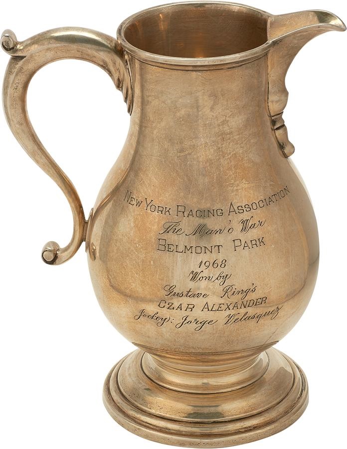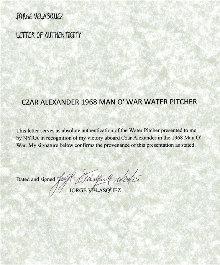 Some historians say the best indicator of a horse's greatness is whether or not he broke a track record. In his day, Czar Alexander showcased a greatness seldom seen. In winning the 1969 Bowling Green at Belmont Park, he set a new course record, and in winning Santa Anita's Oak Tree Stakes he set the world record at 12 furlongs. This beautiful Water Pitcher stands 8.5", marked sterling on the bottom and is inscribed. It was presented to Jorge Velasquez in recognition of his victory aboard Czar Alexander in the 1968 Man O' War Stakes at Belmont Park by the New York Racing Association. Comes with LOA from Jorge Velasquez.