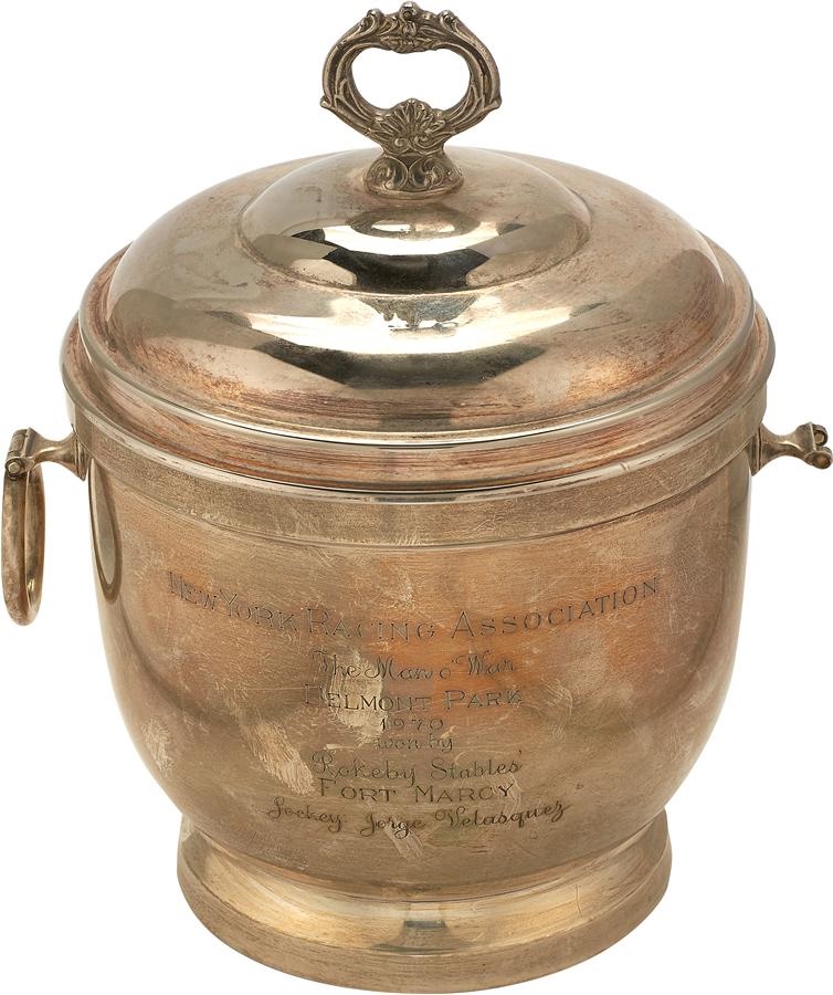 Inducted into the Horse Racing Hall of Fame in 1998, the brilliant Fort Marcy had an extraordinary year in 1970, capping it off by winning three championship titles and being voted the 1970 Horse-of-the-Year. In honor of his victory in the 1970 Man O' War, jockey Jorge Velasquez was presented with this Ice Bucket by the staff of dignitaries representing Belmont Park. The elegant ice bucket stands 10" tall by 7.5" diameter with removable top. Engraving reads, "New York Racing Association The Man o' War Belmont Park 1970 won by Rokeby Stables Fort Marcy Jockey George Velasquez." Stamped sterling on the bottom with the bucket only suffering slight tarnishing and one broken handle. Comes with LOA from Jorge Velasquez.