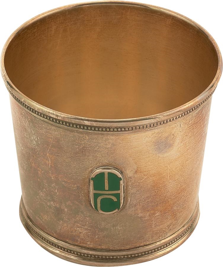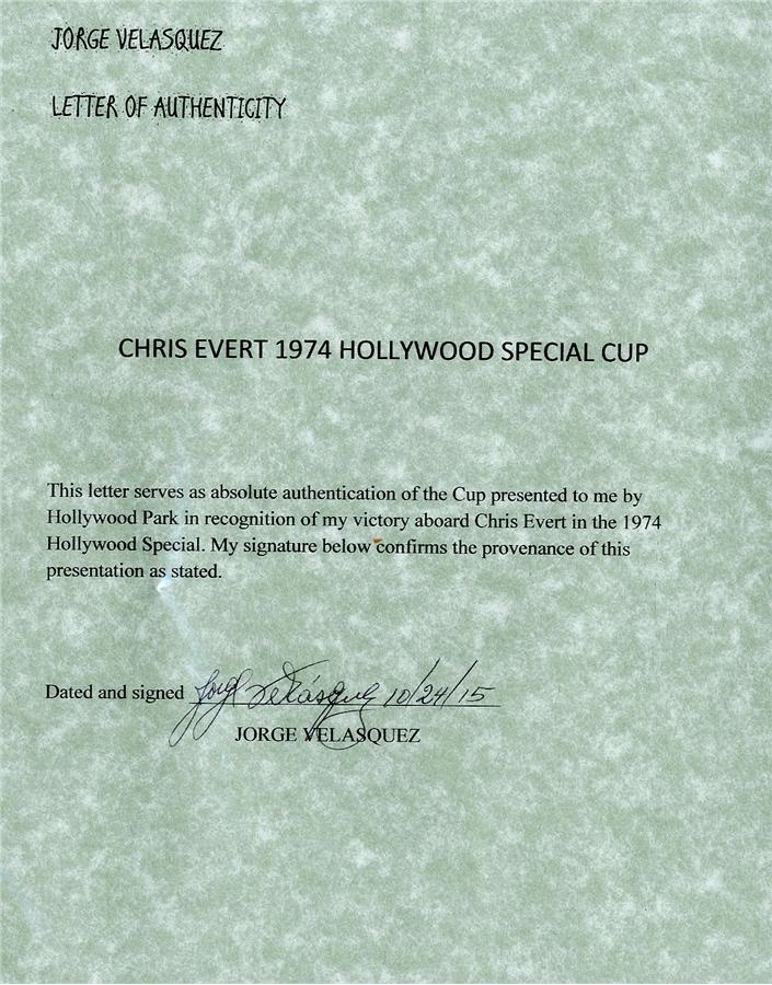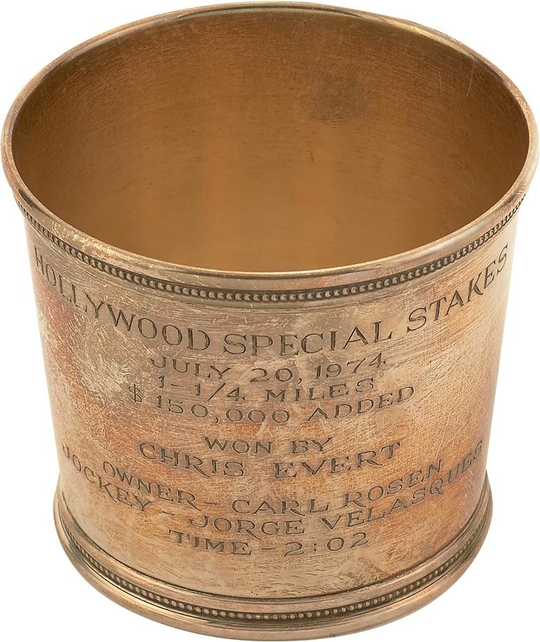 Not to be confused with her tennis star namesake, the precocious Chris Evert was a racing Hall of Fame inductee in 1988, just the third filly in history to win the Filly Triple Crown - the Acorn, the Mother Goose and the Coaching Club of American Oaks. Immediately after completing the rare sweep, she came west and won Hollywood Park's 1974 Hollywood Special. The track honored her legendary jockey Jorge Velasquez with this silver cup measuring 3" tall by 3.5" diameter and stamped Tiffany & Co on bottom with a green enamel THC logo on the backside. The engraving reads "Hollywood Special Stakes July 20 1974 1-1/4 Miles $150,000 Added Won By Chris Evert Owner Carl Rosen Jockey: Jorge Velasquez Time 2:02." The horse was named by its owner, Carl Rosen, who employed the tennis star to endorse his company's line of sportswear. Comes with LOA from Jorge Velasquez.