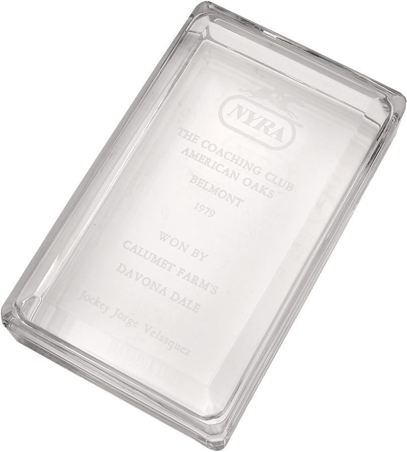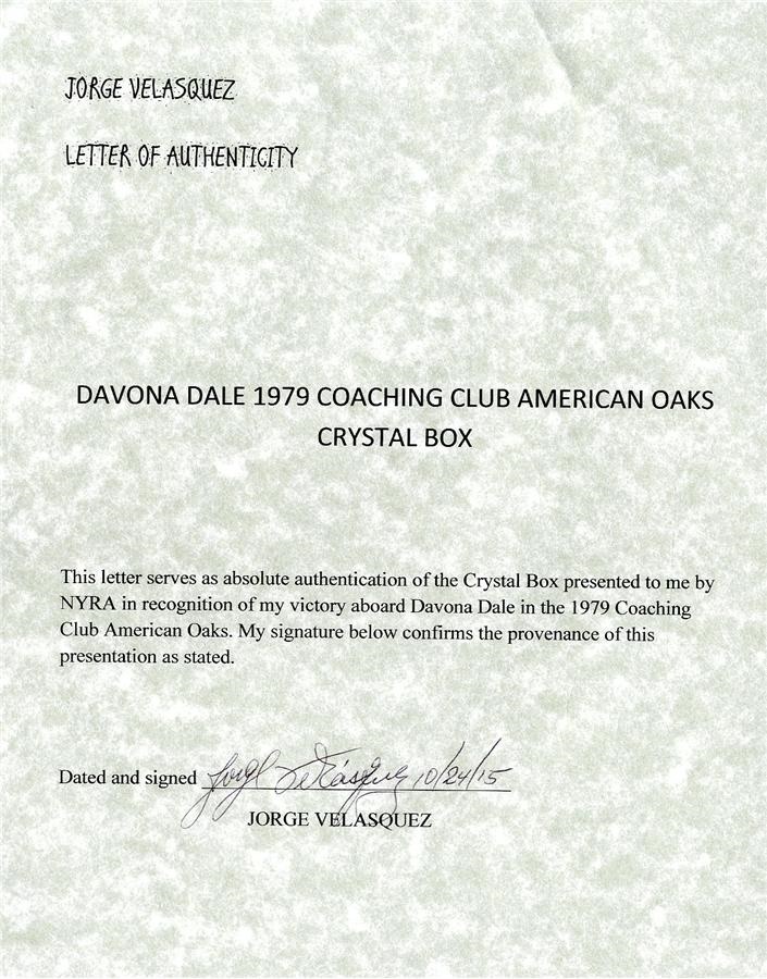 Inducted into the Hall of Fame in 1985, Calumet's Davona Dale accomplished something no other filly in racing history has ever equaled: she won both the National Triple Tiara and the NY Triple Tiara. This crystal jewelry box was awarded to Jorge Velasquez for his victory in the final leg of the 1979 NY Triple Tiara, the Coaching Club American Oaks, which is NYRA's filly equivalent of the Belmont Stakes. Comes with LOA from Jorge Velasquez.