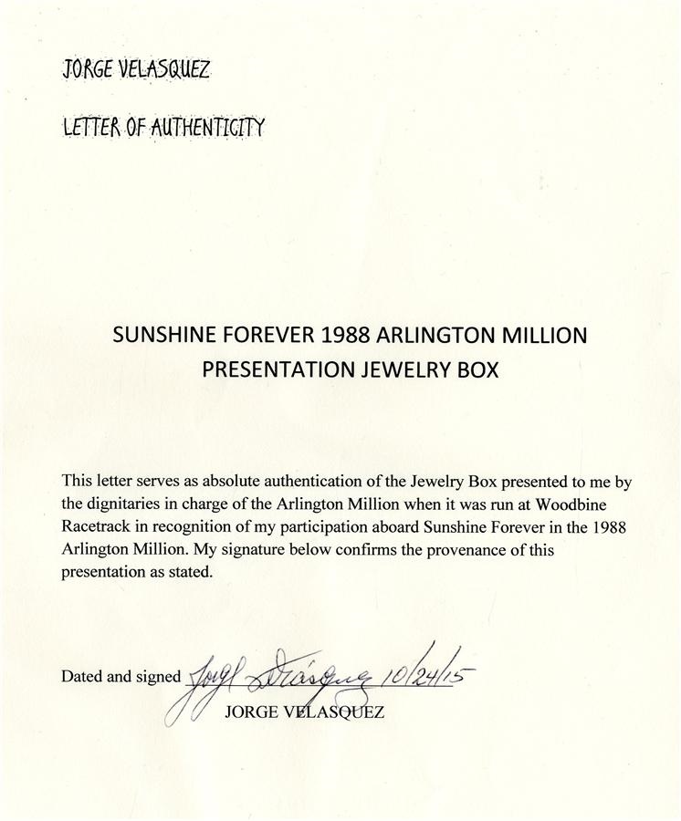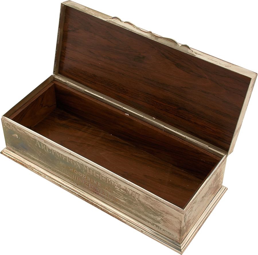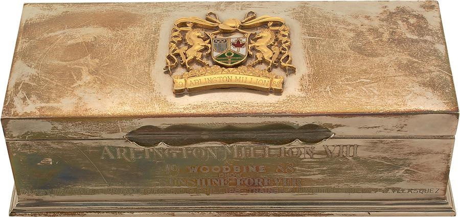 This extraordinary piece represents a collectible rarity: Due to a major renovation of the racetrack initially caused by a fire in 1985, the historic Arlington Million was moved for just one year outside of the U.S when this, the 1988 running, was held at Woodbine Racetrack in Canada. This beautiful jewelry box was actually a presentation trophy; one given to every jockey that rode in the race. The 1988 Eclipse Champion, Sunshine Forever finished 3rd in the 1988 Arlington Million. Comes with LOA from Jorge Velasquez.