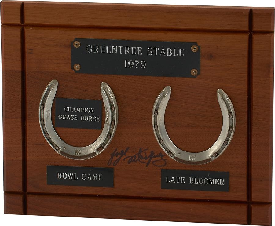 Acquired by Jorge Velasquez directly from the farrier, Bowl Game won the 1979 Eclipse Award as the World's Best Turf Runner after winning five Graded Stakes races in 1979. Late Bloomer was the 1978 Eclipse Champion Older Mare, reeling off seven consecutive wins including three Grade 1's. This wood plaque measuring 15x12" comes from the collection of Velasquez and includes one shoe from each of the two thoroughbreds. Signed by George Velasquez in the middle in 8/10 black marker, it includes a plaque engraved "Greentree Stable 1979," as well as one amidst Bowl Game's shoe indicating "Champion Grass Horse." Comes with LOA from Jorge Velasquez.