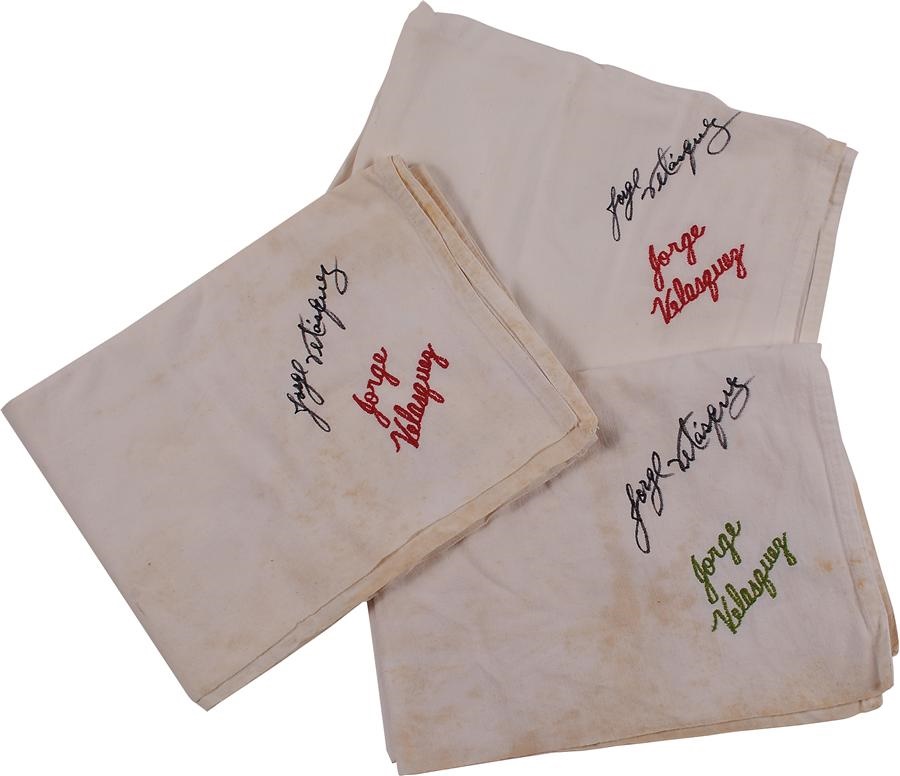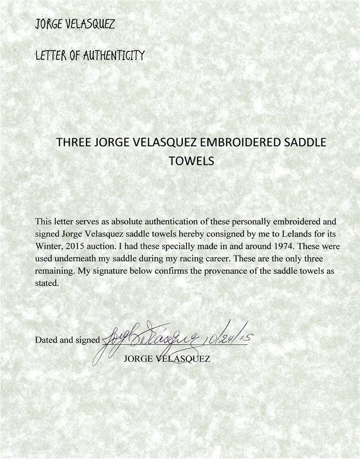 The only three of its kind still in existence, these specially embroidered and autographed saddle towels were used by Jorge Velasquez underneath his saddle in many of his races from 1974 on. From the collection of Jorge Velasquez. Comes with LOA from Jorge Velasquez.