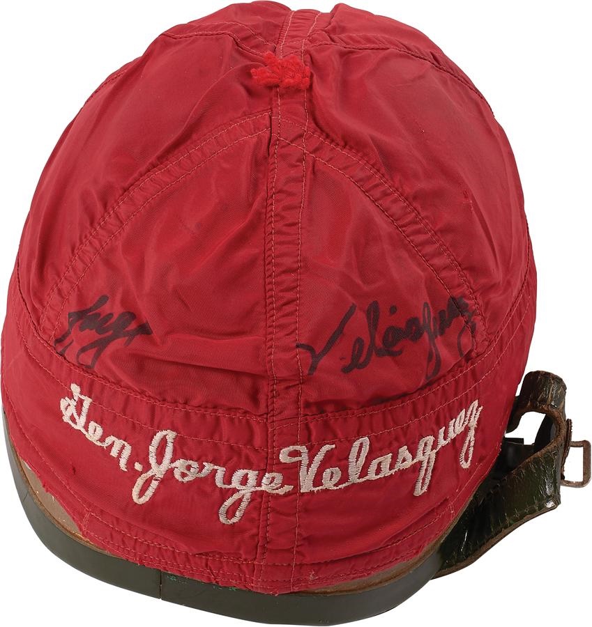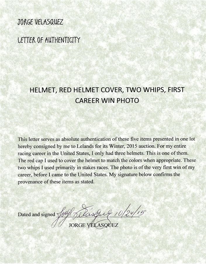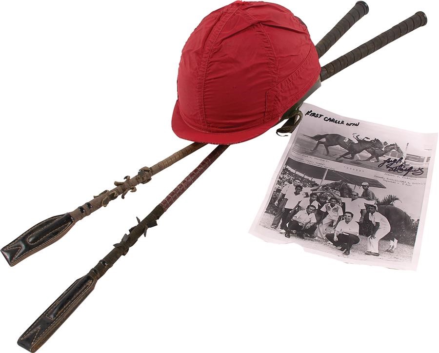 This lot is highlighted by one of only three helmets used by the HOF jockey during his entire racing career. Imagine the horses and historic moments this helmet was part of. Signed by Jorge Velasquez along with one of his helmet covers which also was used substantially throughout his career. In addition, high bidder also wins two of his personal and favorite whips as well as a rare photo of Jorge in the winner's circle after the very first of 6,795 career wins. From the Jorge Velasquez collection. Comes with LOA from Jorge Velasquez.